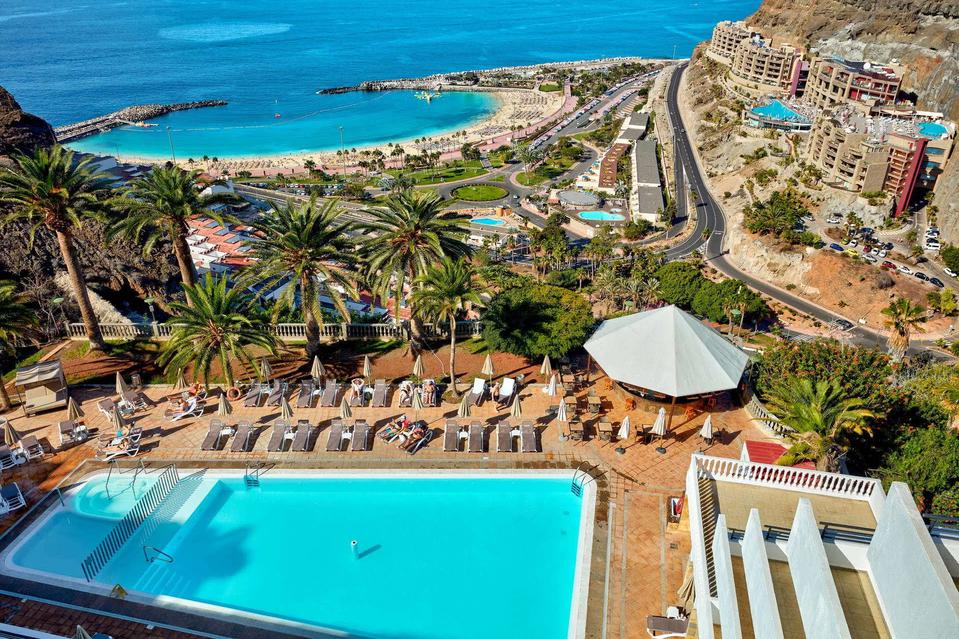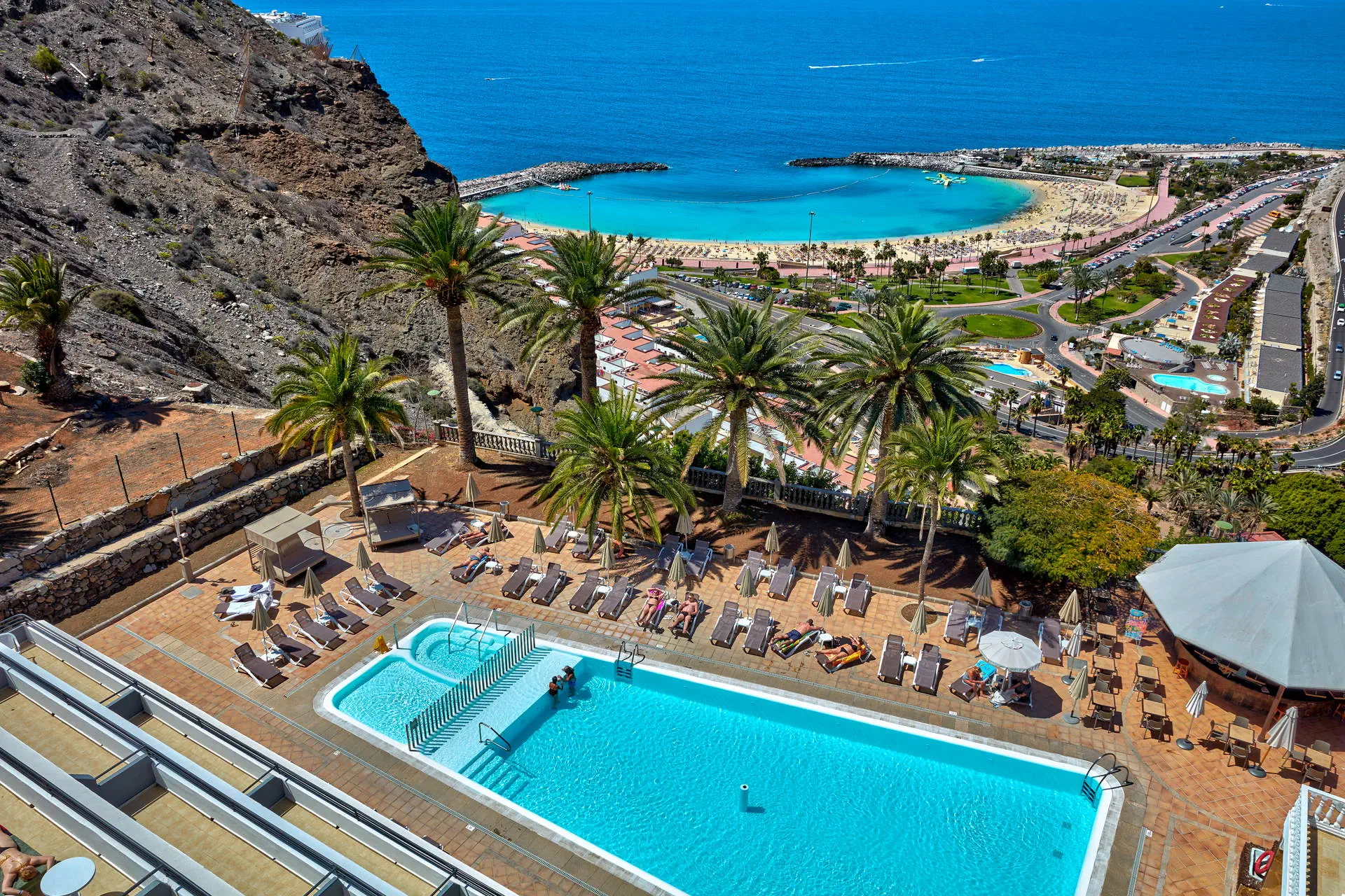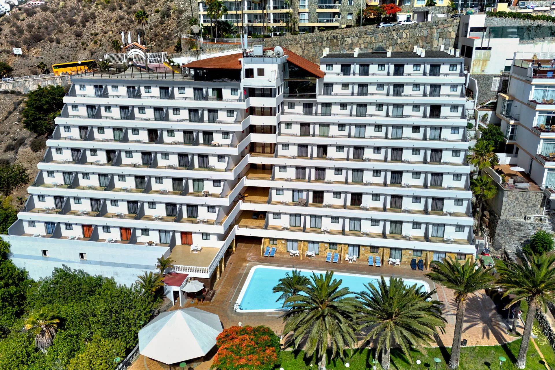 Położenie Położony na wzniesieniu w kameralnym części kurortu Puerto Rico. W pobliżu hotelu sklepy, bary oraz restauracje. Do centrum miasta ok. 1 km. Do lotniska ok. 50 km. Plaża Piaszczysta, zatokowa Plaża de Amadores ok. 700 m od hotelu. Leżaki i parasole na plaży płatne. Do dyspozycji gości Recepcja, windy, snack bar, basen (słodka woda, podgrzewany od listopada do marca), jacuzzi, taras słoneczny z leżakami, mini market. Hotel nie zapewnia ręczników basenowych. Pokoje Hotel zapewnia zakwaterowanie w przestronnych apartamentach. Wszystkie z pokojem dzienny i osobna sypialnią, wyposażone w łazienkę (prysznic lub wanna, suszarka do włosów), TV-sat, sejf (płatny), aneks kuchenny (lodówka, toster, zestaw do robienia kawy i herbaty, ekspres do kawy), telefon, taras lub balkon (meble balkonowe). Dziecko do lat 2 wlicza się w maksymalne obłożenie w pokoju. Apartament economy(pow. ok. 42m2) - dla max. 3 osób. Apartament z widokiem na ocean (pow. ok. 42m2) - dla max. 4 osób Apartament superior z widokiem na ocean (pow. ok. 42m2) - dla max. 4 osób. Częściowo z nowszym umeblowaniem. Wyżywienie Bez wyżywienia. Program sportowy i animacyjny Hotel nie prowadzi animacji. Płatny: bilard Internet Wi-Fi gratis przy recepcji. W pokojach za dodatkową opłatą. Kategoria lokalna * Naszym zdaniem Atrakcyjne cenowo i funkcjonalne zakwaterowanie tuż przy znanej Playa de Amadores. Idealna opcja dla wszystkich tych, dla których hotel stanowi bazę wypadową do poznawania wyspy. Do tego naprawdę dobrze utrzymany hotel i za to nasza ocena. Strona www www.palmeramar.com