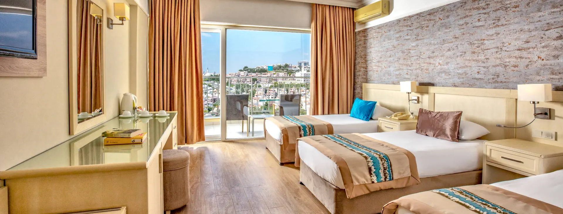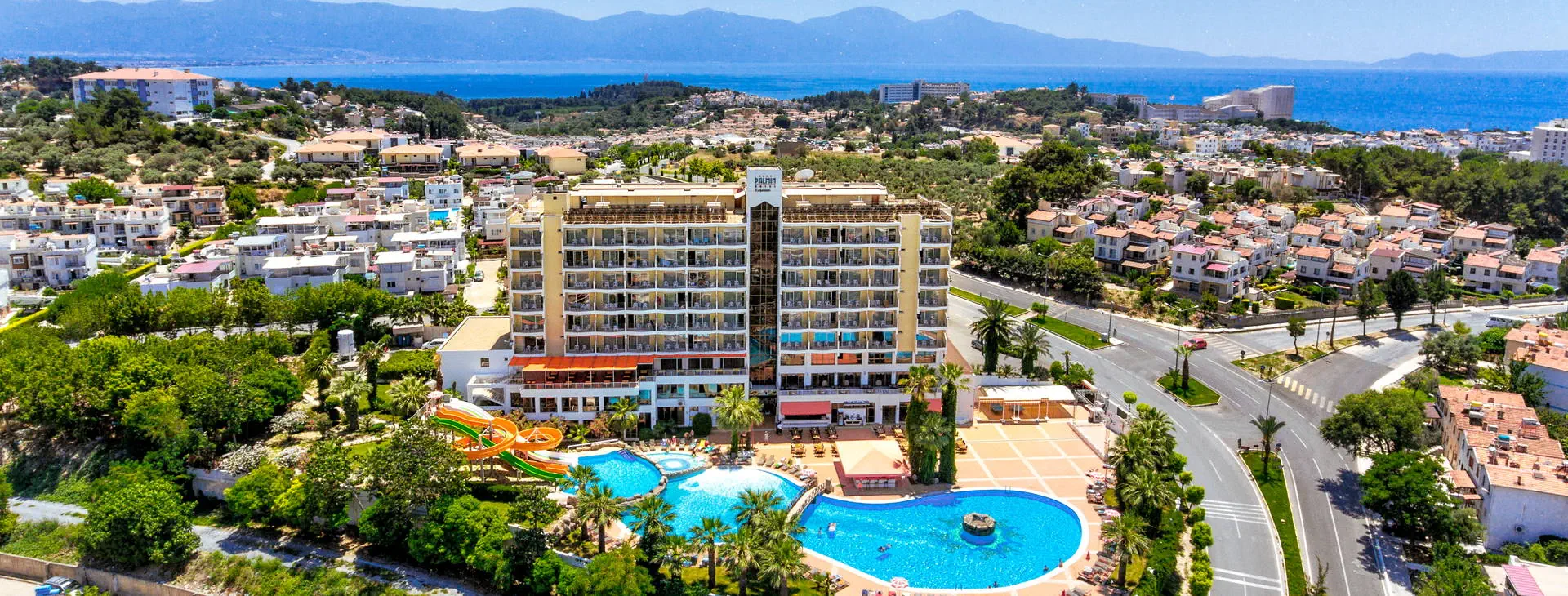 Położenie: Czterogwiazdkowy hotel położony na terenie egzotycznego ogrodu, oddalony ok. 2 km od centrum Kuşadasi. W najbliższym otoczeniu znajdują się restauracje, kawiarnie i sklepy. Lotnisko w Bodrum położone jest w odległości ok. 135 km od hotelu. Plaża: Publiczna piaszczysta plaża Ladies Beach – usytuowana jest ok. 500 m od hotelu. Bezpłatny serwis plażowy (leżaki, parasole i ręczniki) oraz bezpłatny transfer z hotelu (w określonych porach). Do dyspozycji gości: Recepcja całodobowa, lobby, winda, sala TV, restauracja główna, lobby bar, bar przy basenie, basen kryty, basen na zewnątrz, basen dla dzieci, zjeżdżalnie dla dzieci i dorosłych (w godzinach 13:00-15:00). Za dodatkową opłatą: sklepiki, fotograf, pralnia, fryzjer, wypożyczenie samochodu. Wyżywienie: All Inclusive: śniadanie (07:30 - 10:30), obiad (12:30 -14:00), przekąski (14:00 -16:30), kawa i herbata (16:30 - 17:30), kolacja (19:30 - 21:30), późne przekąski (23:30 - 00:30), napoje bezalkoholowe oraz lokalne alkoholowe (10:00 - 24:00). Za dodatkową opłatą: importowane alkohole, lody, kawa po turecku, świeżo wyciskany sok z pomarańczy. Program sportowy i animacyjny: Codzienne animacje w dzień i 5 razy w tygodniu - nocne pokazy. Dla dzieci – miniklub (4-12 lat), plac zabaw. Dodatkowo: siłownia, łaźnia parowa, sauna, jacuzzi, tenis stołowy, rzutki. Dodatkowo płatne: łaźnia turecka, masaże, kort tenisowy (w dzień), bilard, wypożyczenie laptopów. Internet: Bezpłatny dostęp do Wi-Fi w lobby. Kategoria lokalna: **** Strona www: