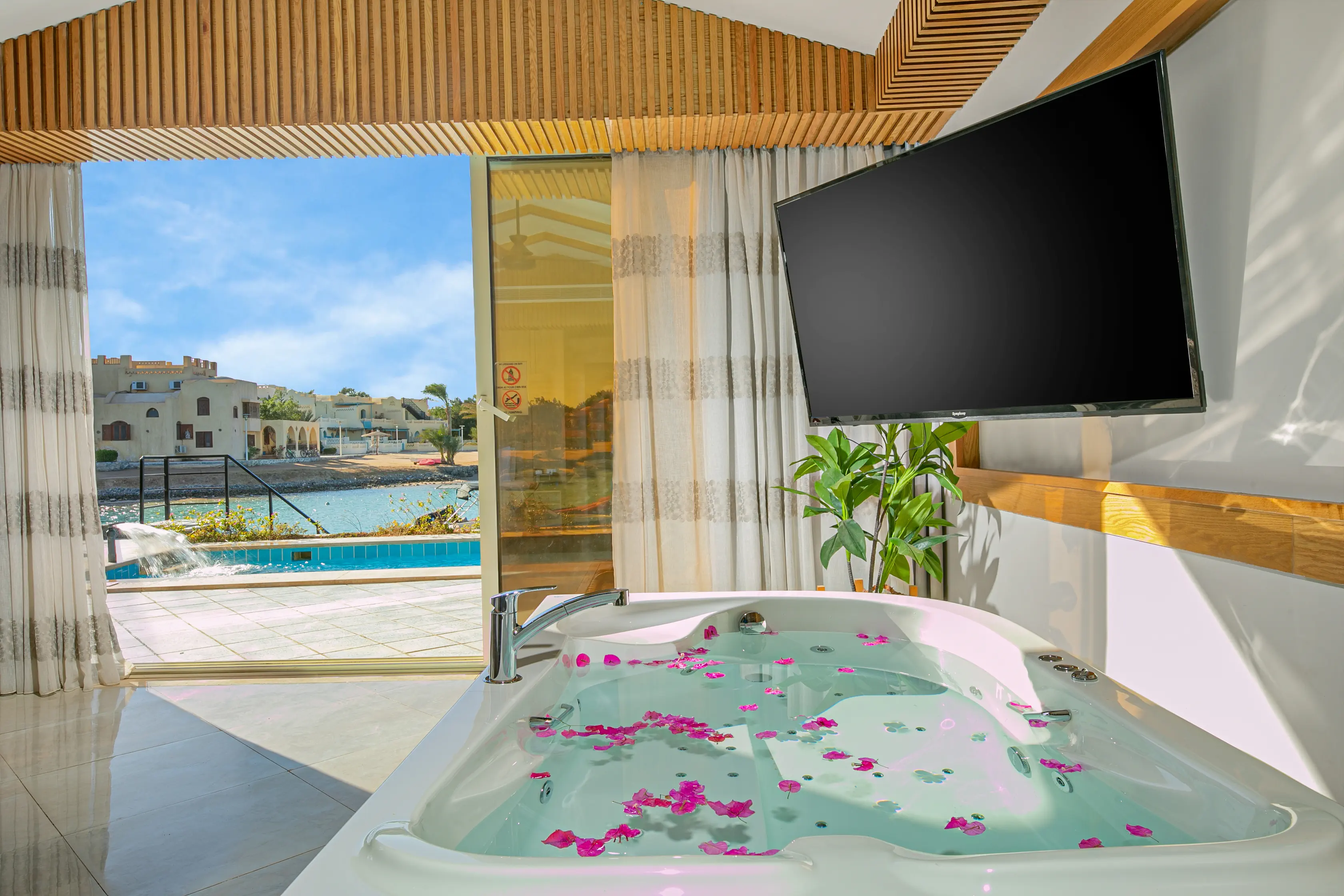 Dla max. 3 osób, Przestrzeń zewnętrzna: Taras, Kanały telewizji: Angielski, Telefon w pokoju, Aneks kuchenny, prysznic, jacuzzi, Powierzchnia pokoju: ok. 55 - 60 m2, Dostawka: sofa, Rodzaj podłogi: płytki, Sprzątanie codziennie, Salon, 1 sypialnia, Maksymalna liczba osób dorosłych: 2, Maksymalna liczba dzieci: 1, Widok na lagunę, Bezpośredni dostęp do plaży, Prywatny basen, Liczba łazienek: 1, Liczba toalet: 1, Zestaw do parzenia kawy i herbaty, Klimatyzacja: Klimatyzacja indywidualna