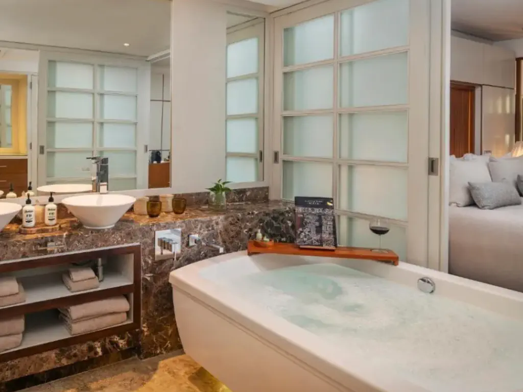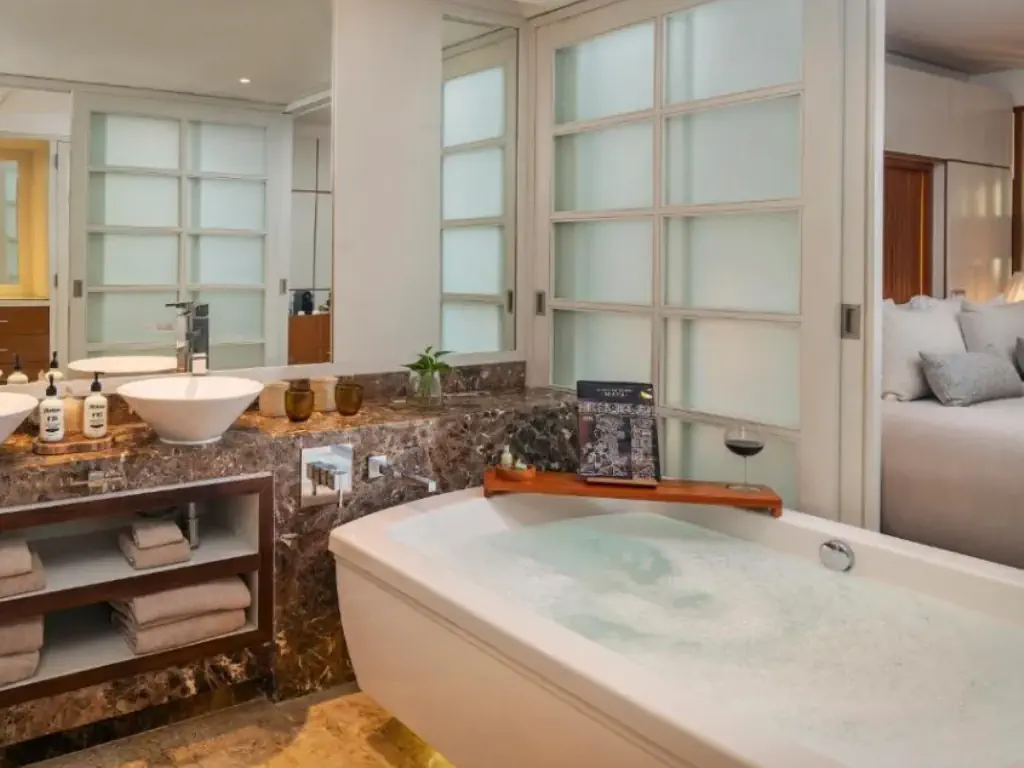 Dla max. 3 osób, Przestrzeń zewnętrzna: Taras, prysznic, jacuzzi, Powierzchnia pokoju: ok. 106 m2, Dostawka: sofa, Rodzaj podłogi: płytki, Sprzątanie codziennie, Salon, część jadalniana, 1 sypialnia, Drzwi przesuwne, Maksymalna liczba osób dorosłych: 3, Maksymalna liczba dzieci: , Widok na ogród, Liczba łazienek: 1, Liczba toalet: 1, Zestaw do parzenia kawy i herbaty, Klimatyzacja: Klimatyzacja centralna