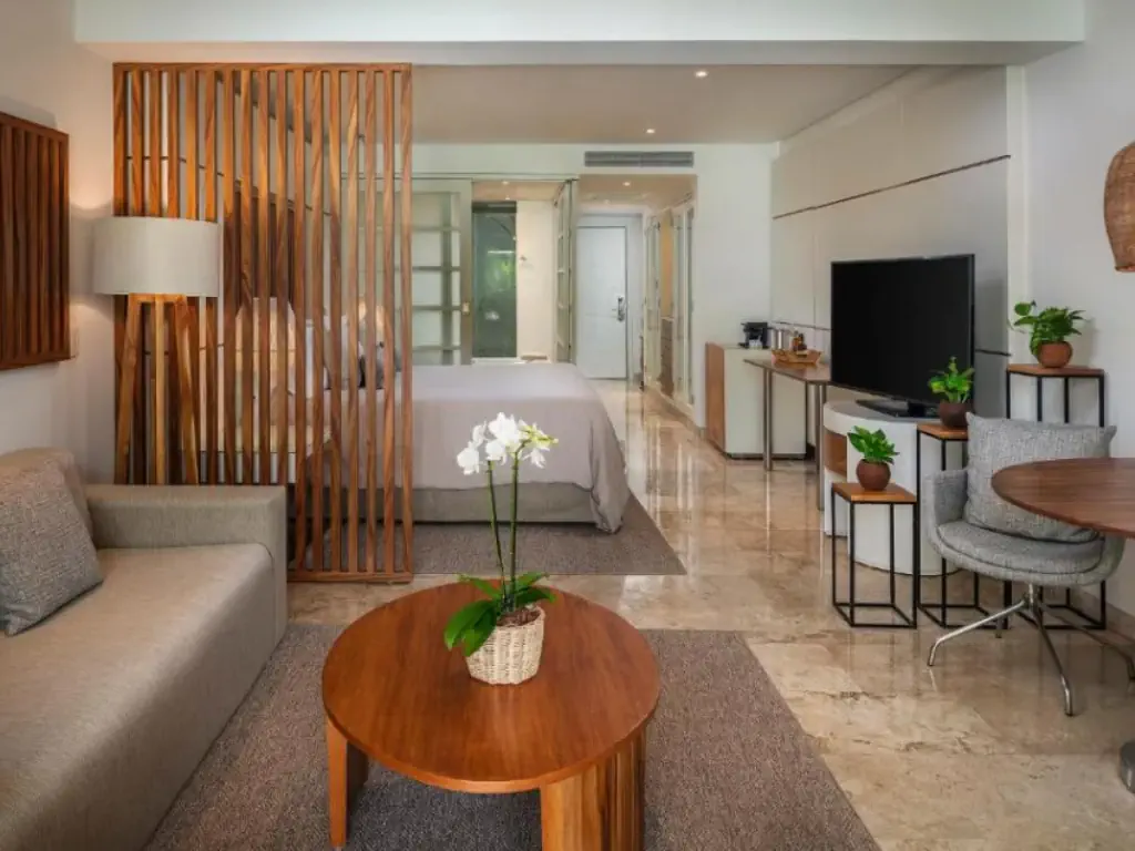 Dla max. 3 osób, Przestrzeń zewnętrzna: Balkon lub taras, prysznic, jacuzzi, Powierzchnia pokoju: ok. 65 m2, Dostawka: sofa, Rodzaj podłogi: płytki, Sprzątanie codziennie, 1 sypialnia, Maksymalna liczba osób dorosłych: 3, Maksymalna liczba dzieci: , Widok na ogród, Liczba łazienek: 1, Liczba toalet: 1, Zestaw do parzenia kawy i herbaty, Klimatyzacja: Klimatyzacja centralna
