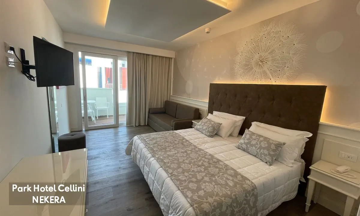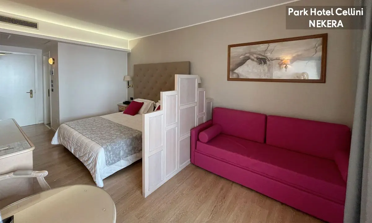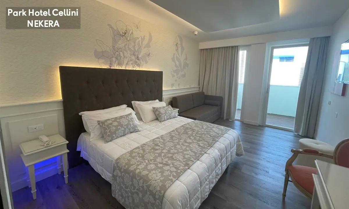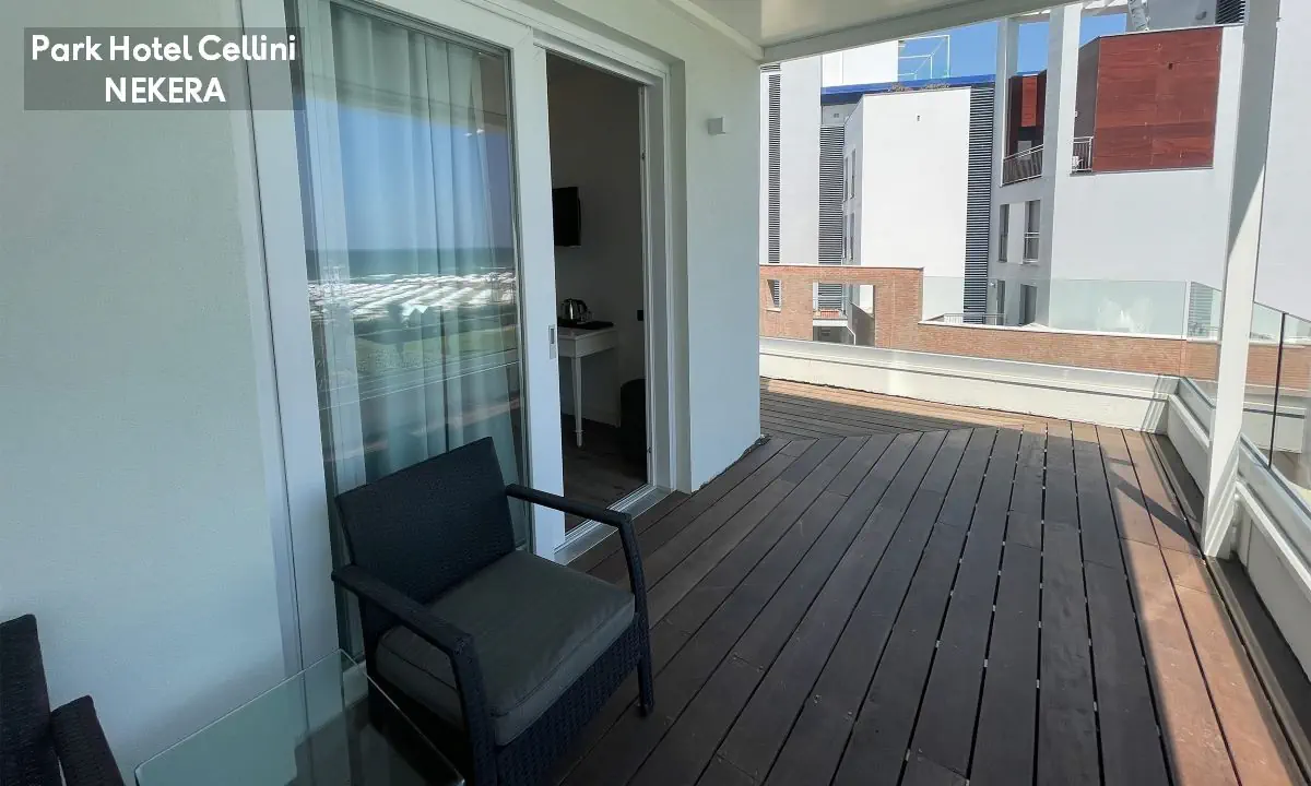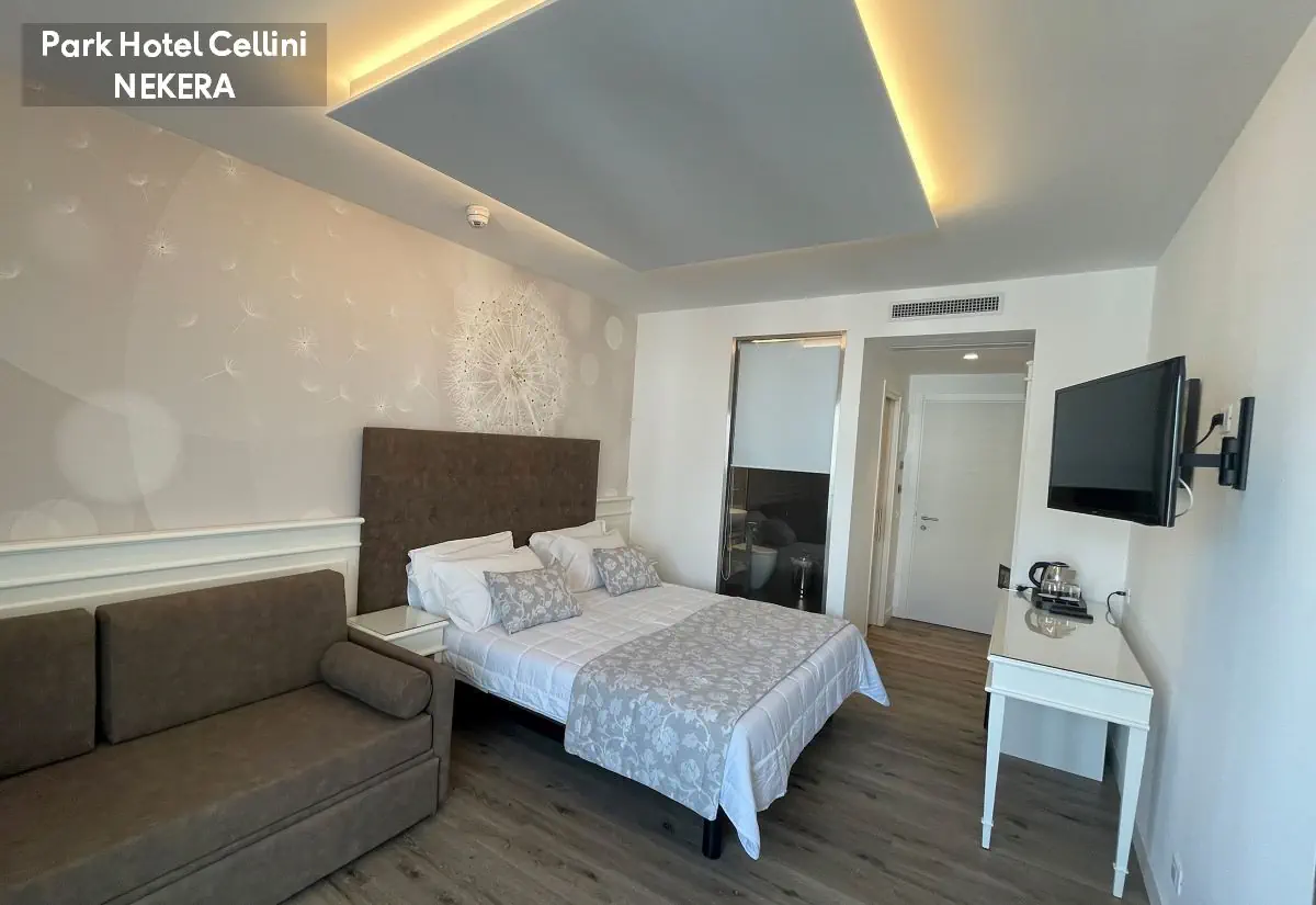 pokoje dwuosobowe (ok. 16 m2): prysznic, WC, telefon, TV, WiFi, klimatyzacja, sejf, balkon. Pokoje trzy-czteroosobowe (ok. 18 m2): wyposażone jak pokoje dwuosobowe, łóżko piętrowe.