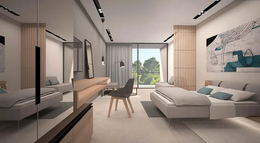 pokoje rodzinne od strony morza F4BN (ok. 28 m2): prysznic, WC, suszarka, telefon, TV, WiFi, klimatyzacja, sejf, balkon, mini bar, od strony morza. Pokoje rodzinne z widokiem na morze F4BM (ok. 28 m2): wyposażone jak pokoje rodzinne od strony morza F4BN, widok na morze.