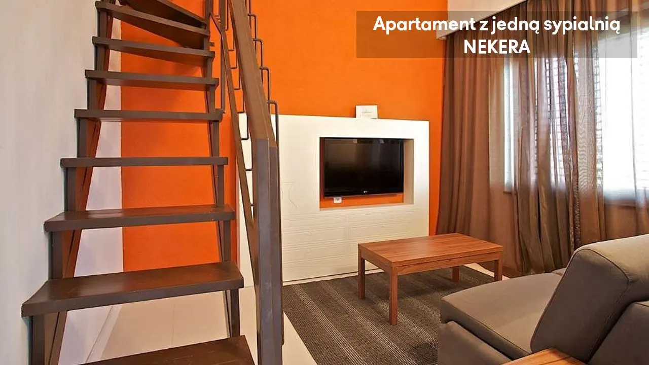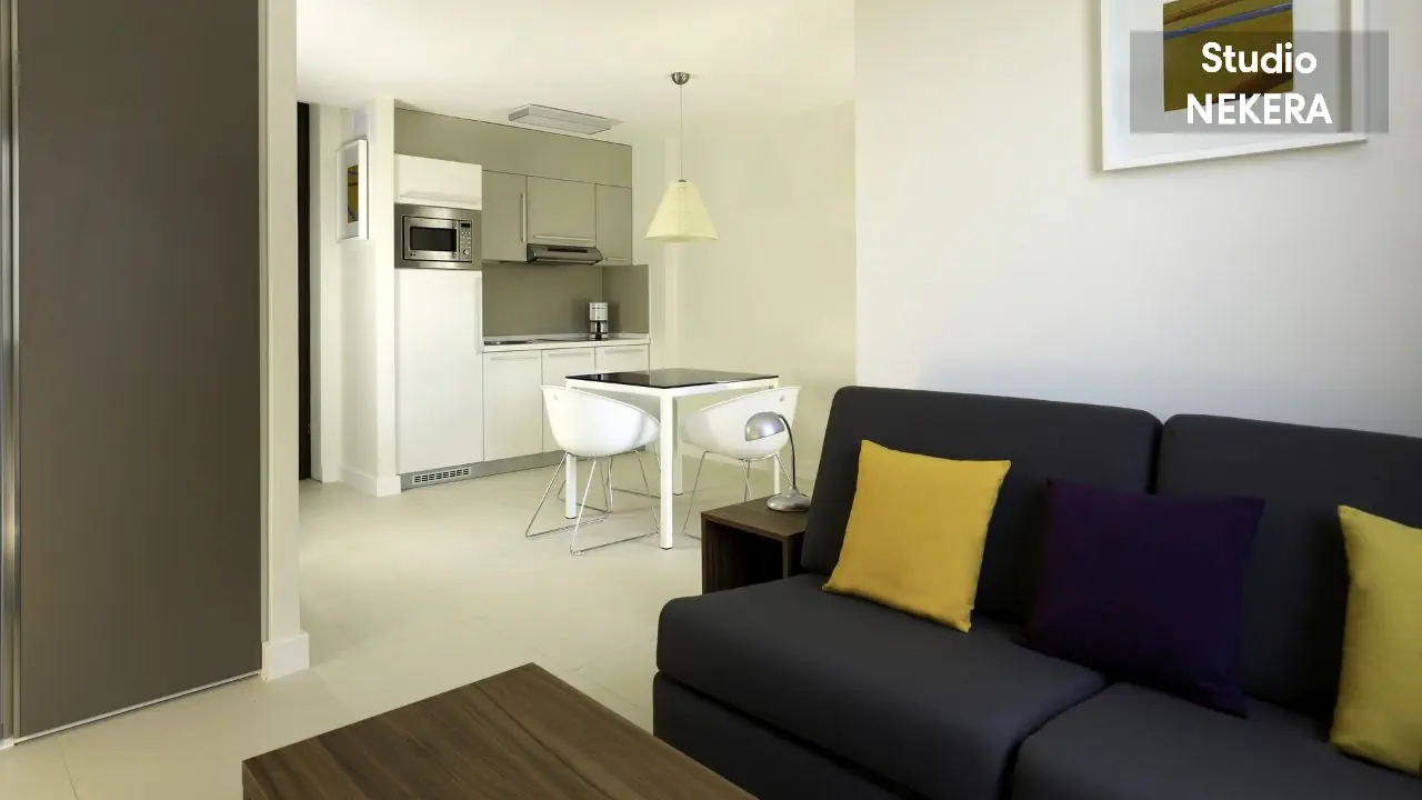 Studio: ok. 25 m2, mogący zakwaterować do dwóch osób, pokój na otwartym planie z rozkładaną sofą i aneksem kuchennym (mikrofalówka, lodówka, kuchenka, ekspres do kawy), TV, prywatna łazienka (prysznic, toaleta, umywalka, suszarka do włosów), umeblowany balkon. Apartament z jedną sypialnią: ok. 30 – 40 m2, mogący zakwaterować do dwóch osób, sypialnia z łóżkiem podwójnym i pokój dzienny z sofą i aneksem kuchennym; poza tym wyposażony jak Studio. Apartament z dwoma sypialniami: ok. 55 m2, apartament piętrowy, mogący zakwaterować do pięciu osób, sypialnia z łóżkiem podwójnym, sypialnia z łóżkiem pojedynczym i pokój dzienny z sofą i aneksem kuchennym; poza tym wyposażony jak Studio.