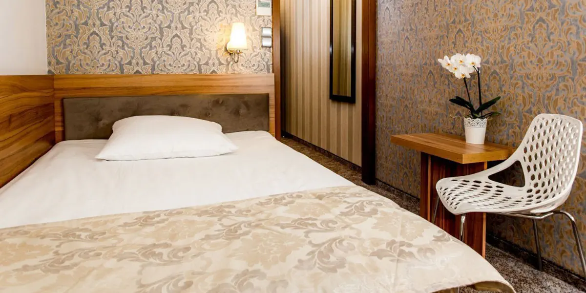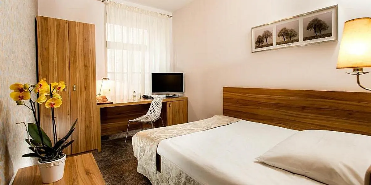 Klimatyzowany pokój z łazienką i widokiem na kościół św. Elżbiety. Łóżko o wymiarach 140x200 cm