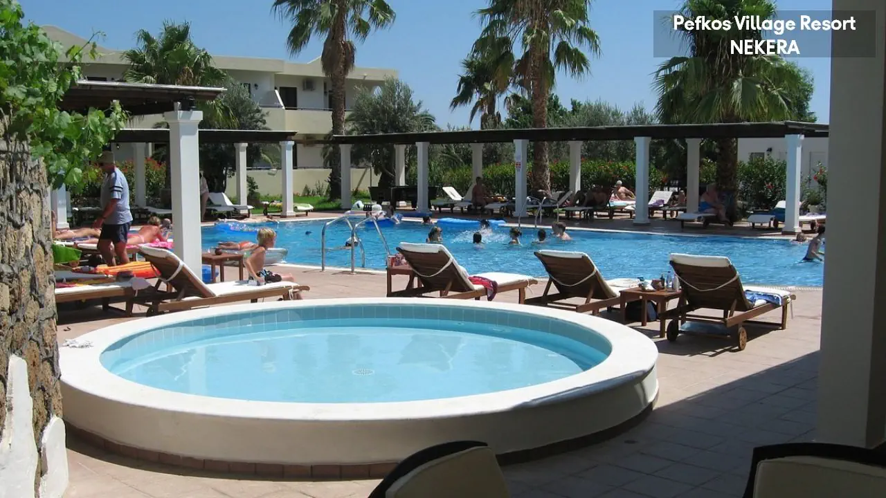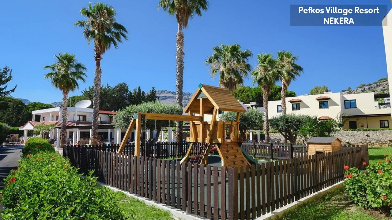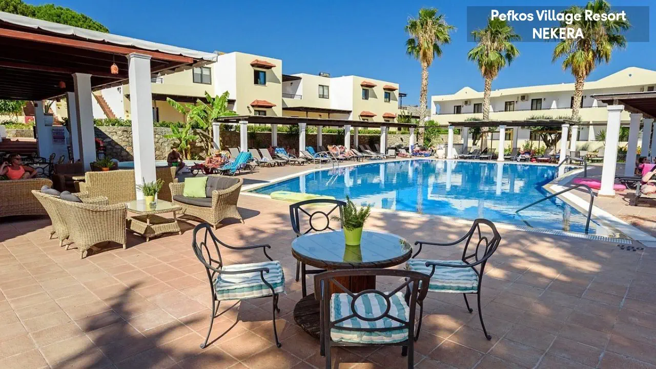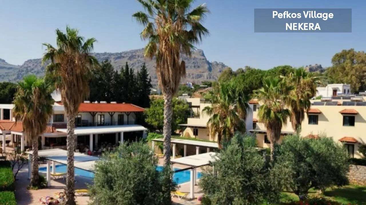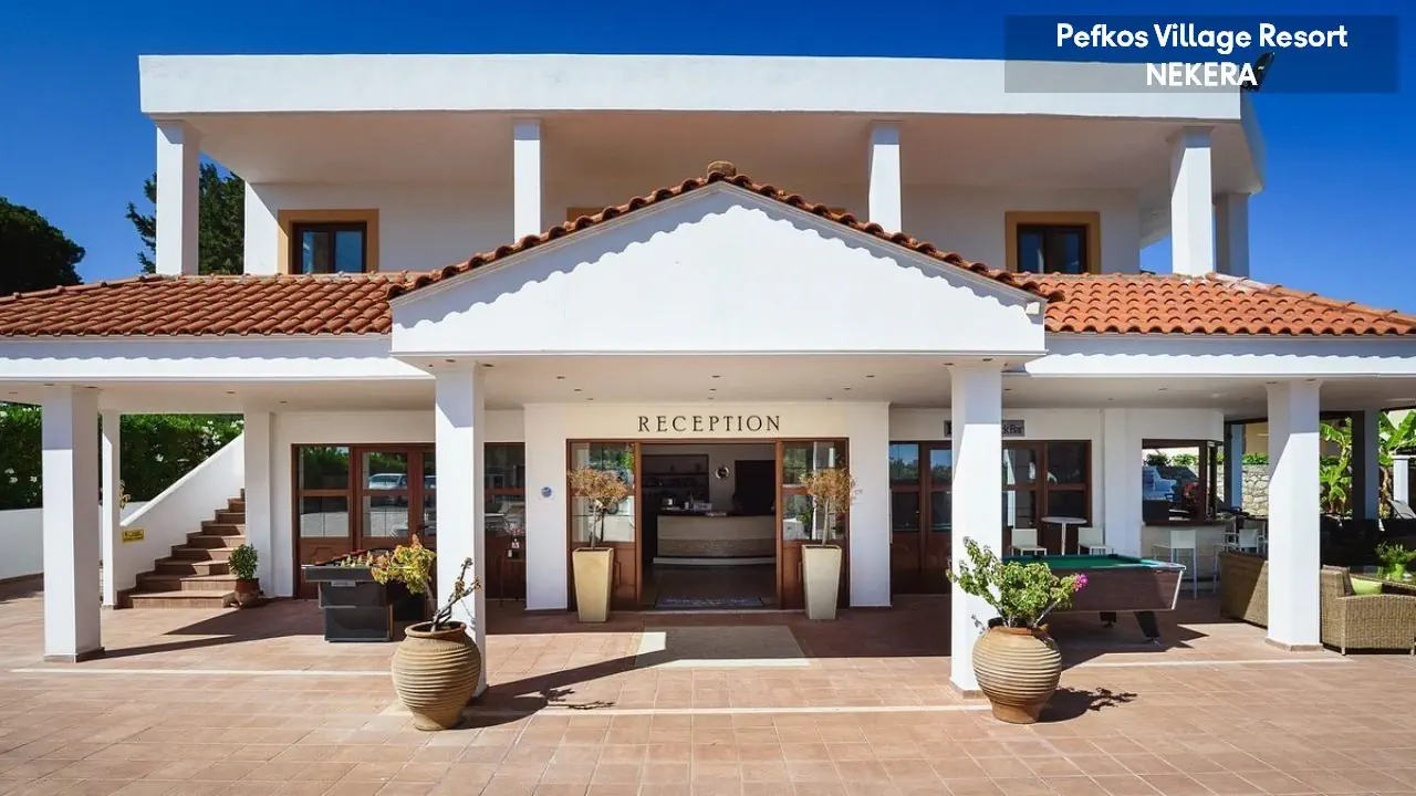 w centralnej części wschodniego wybrzeża wyspy, na wzniesieniu, na obrzeżach niewielkiego kurortu turystycznego Pefki, spokojnym w dzień, a tętniącym życiem wieczorami (do centrum ok 1,5 km). Akropol w Lindos oddalony jest o ok. 6 km od hotelu, Water Park w Faliraki o ok. 45km, półwysep Prasonissi o ok. 46 km, stare miasto w Rodos o ok. 53 km. Międzynarodowy Port Lotniczy Rodos znajduje się ok. 57 km od hotelu