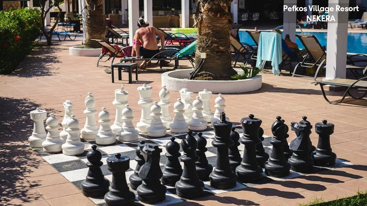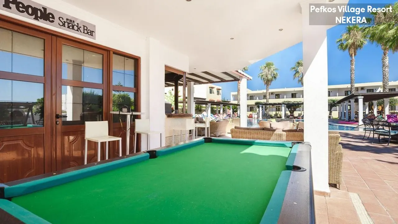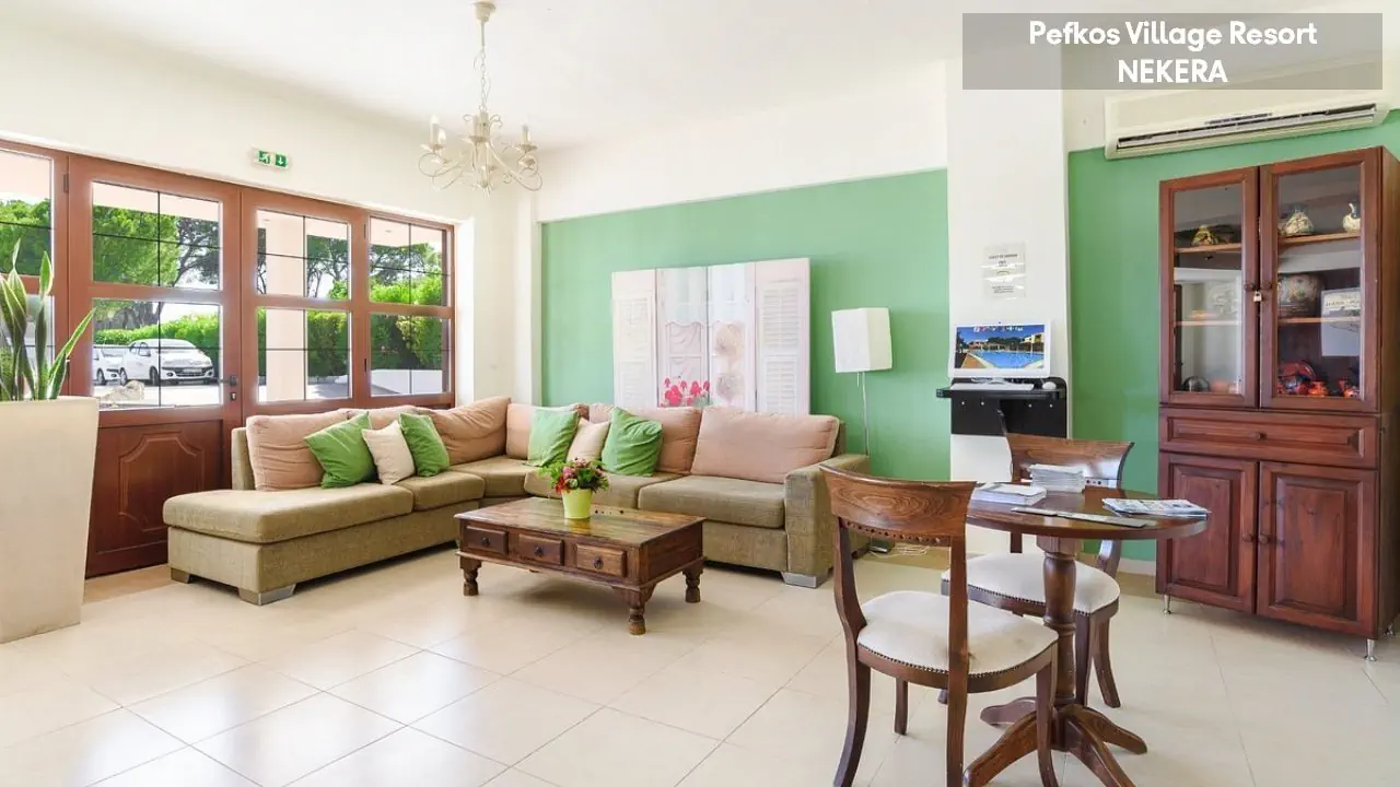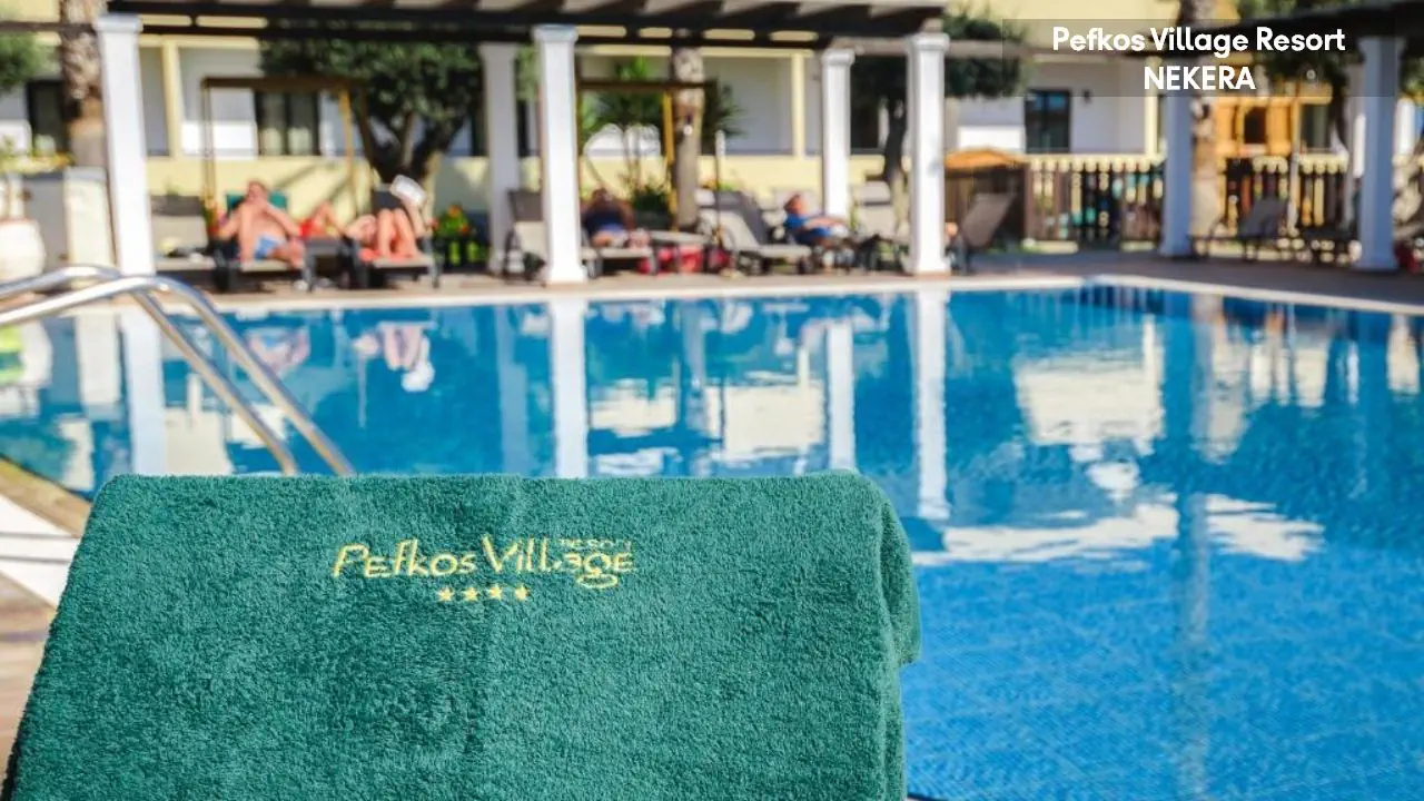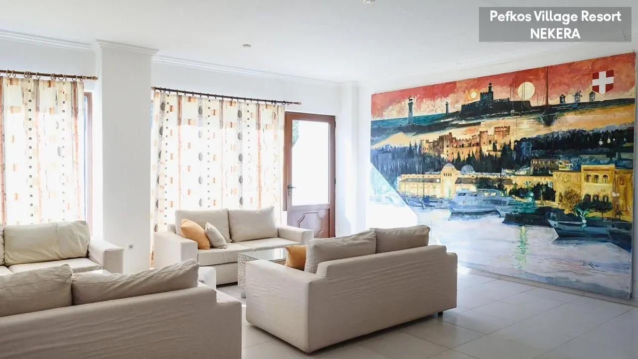 w centralnej części wschodniego wybrzeża wyspy, na wzniesieniu, na obrzeżach niewielkiego kurortu turystycznego Pefki, spokojnym w dzień, a tętniącym życiem wieczorami (do centrum ok 1,5 km). Akropol w Lindos oddalony jest o ok. 6 km od hotelu, Water Park w Faliraki o ok. 45km, półwysep Prasonissi o ok. 46 km, stare miasto w Rodos o ok. 53 km. Międzynarodowy Port Lotniczy Rodos znajduje się ok. 57 km od hotelu