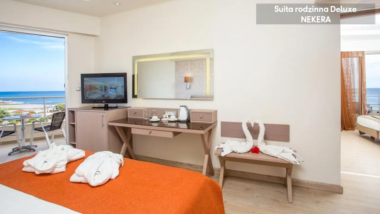 pokój dwuosobowy od strony gór SUPERIOR MOUNTAIN VIEW: ok. 20 m², mogący zakwaterować 2 osoby (możliwość dostawki); dwa łóżka pojedyńcze lub jedno łóżko podwójne; klimatyzacja; TV, Wi-Fi, prywatna łazienka; balkon; ręczniki kąpielowe na plażę/basen; minilodówka; za dopłatą: pokój dwuosobowy z widokiem na morze SUPERIOR SEA VIEW. Pokój dwuosobowy z widokiem na morze DELUXE SEA VIEW: ok. 25 m², pozostałe tak, jak: pokój dwuosobowy od strony gór SUPERIOR MOUNTAIN VIEW. Pokój dwuosobowy dla osób z niepełnosprawnością SUPERIOR LAND VIEW ACCESSIBLE: ok. 20 m², udogodnienia dla osób z niepełnosprawnością; pozostałe tak, jak: pokój dwuosobowy od strony gór SUPERIOR MOUNTAIN VIEW. Suita rodzinna FAMILY SUITE DELUXE: ok. 35 m², mogący zakwaterować 4 osoby dorosłe; zlokalizowany w nowym skrzydle hotelu; dwie sypialnie; jedno łóżko podwójne lub jedno łóżko pojedyńcze; dwa łóżka podwójne; jacuzzi; umeblowany, duży balkon; pozostałe tak, jak: pokój dwuosobowy od strony gór SUPERIOR MOUNTAIN VIEW. Bungalow z prywatnym basenem BUNGALOW PRIVATE POOL: ok. 40 m², mogący zakwaterować 4 osoby dorosłe; częściowy widok na morze; blisko plaży; widok na ogród lub częściowy widok na morze; jedna sypialnia z łóżkiem king-size; druga sypialnia z dwoma łóżkami pojedyńczymi; dwa TV; szlafrok, kapcie; pozostałe tak, jak: pokój dwuosobowy od strony gór SUPERIOR MOUNTAIN VIEW. Suita zlokalizowana na ostatnim piętrze z widokiem na morze SKY SEA VIEW: duży taras z jaccuzzi; dwa łóżka podwójne typu queen-size, dodatkowe łóżko pojedyńcze; pozostałe tak, jak: bungalow z prywatnym basenem BUNGALOW PRIVATE POOL. Luksusowy pokój dwuosobowy z widokiem na morze ROSE DELUXE SEA VIEW: ok. 25 m², mogący zakwaterować 2 osoby; zlokalizowany na 7 piętrze, piękny widok na morze i umeblowany balkon; część wypoczynkowa; łóżko typu king-size; pozostałe tak, jak: pokój dwuosobowy od strony gór SUPERIOR MOUNTAIN VIEW. Suita prezydencka PRESIDENTIAL SUITE: ok. 55 m², dwa pomieszczenia; sypialnia z dużym łóżkiem podwójnym typu king-size; część wypoczynkowa z dużą sofą; prywatna łazienka z prysznicem; jaccuzzi; przestronny i duży balkon; pozostałe tak, jak: pokój dwuosobowy od strony gór SUPERIOR MOUNTAIN VIEW.