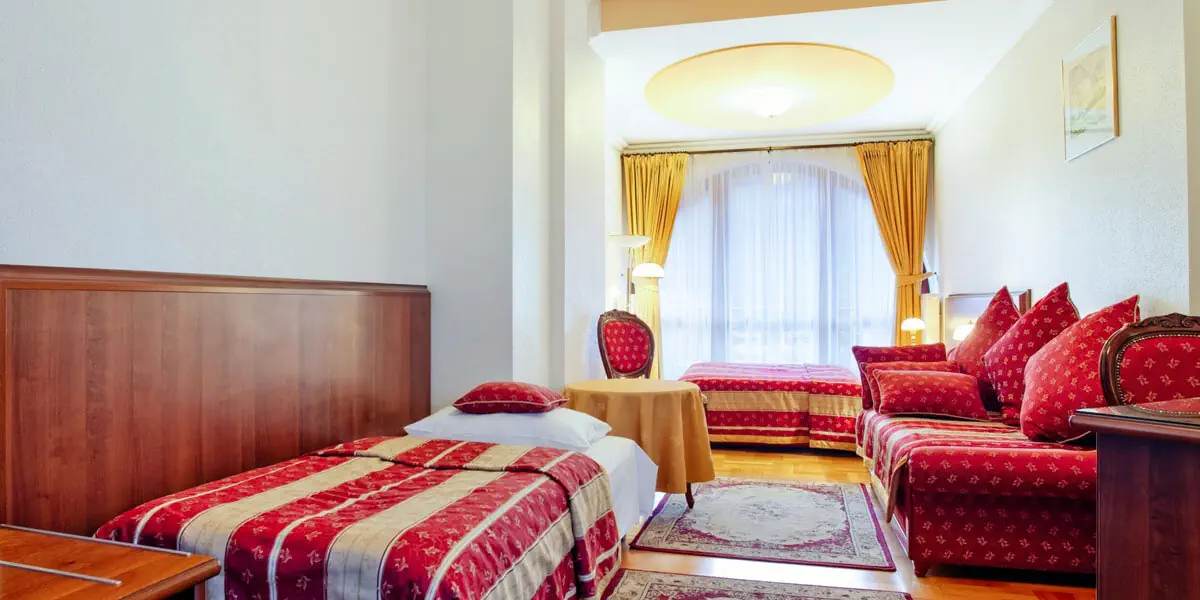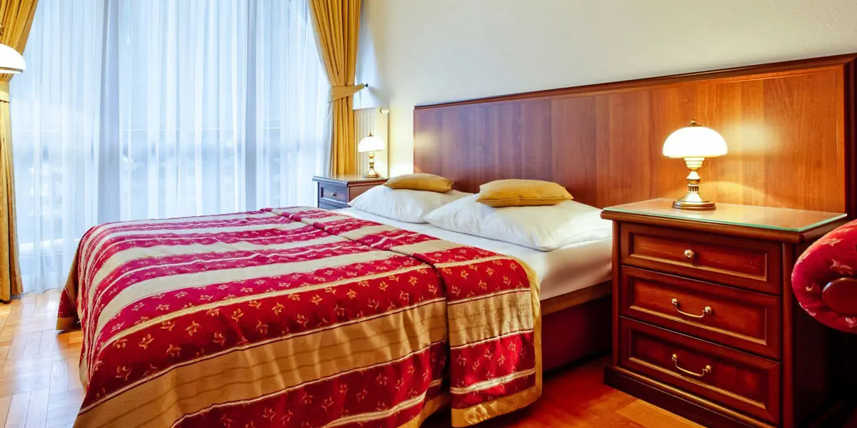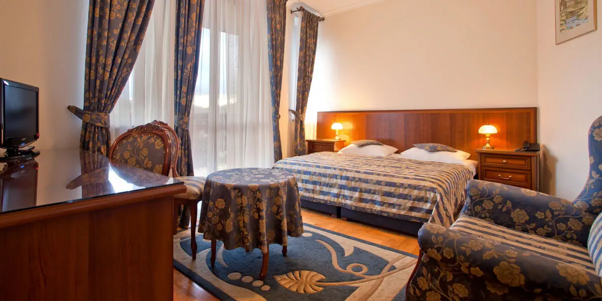 Elegancki, przestronny pokój zaaranżowany w klasycznym stylu. Pokój wyposażony w: zestaw do parzenia kawy lub herbaty, lodówkę, sejf, tv, radio, wifi, telefon, tekstylia hotelowe, klimatyzacje, podgrzewaną podłogę, kabinę prysznicową, bidet, suszarkę do włosów. Dla zachowania przyjemnej atmosfery w pokojach obowiązuje bezwzględny zakaz palenia.