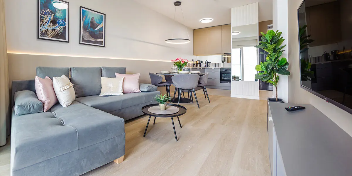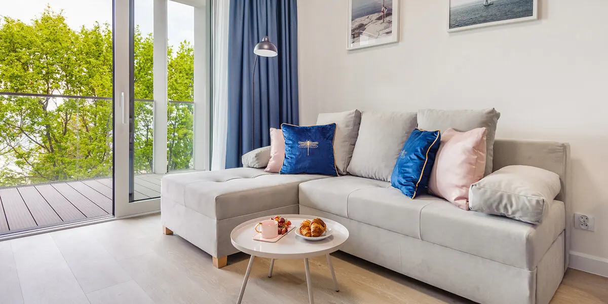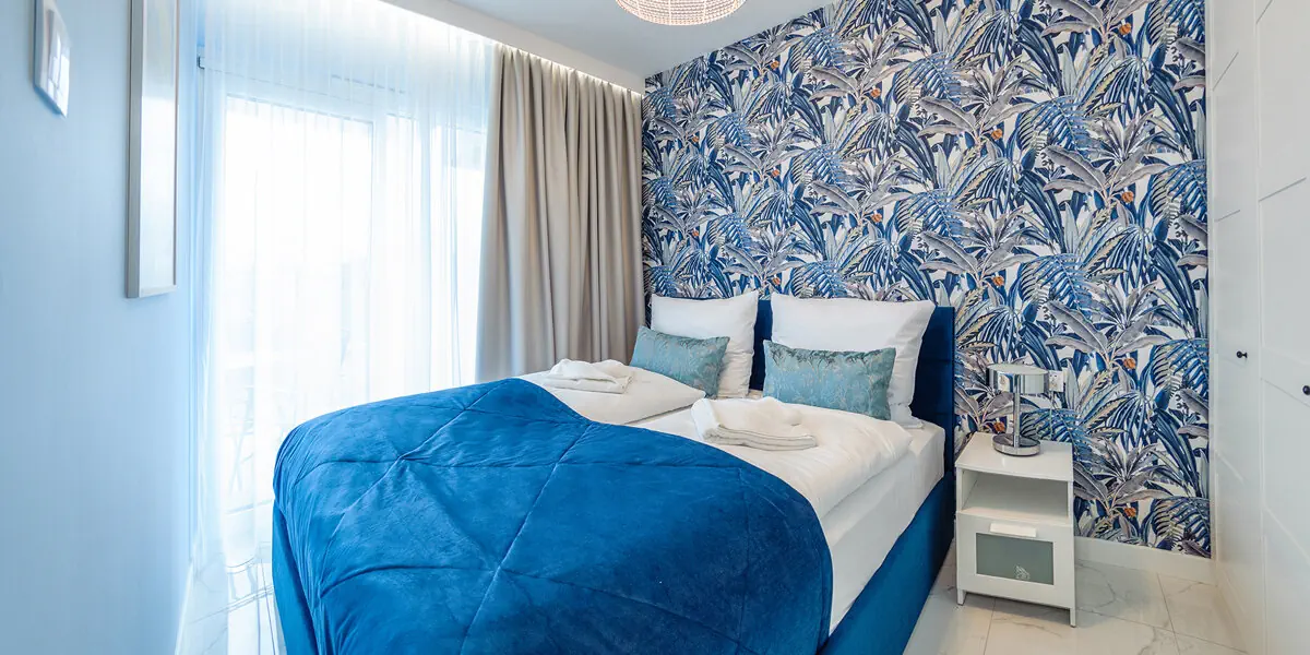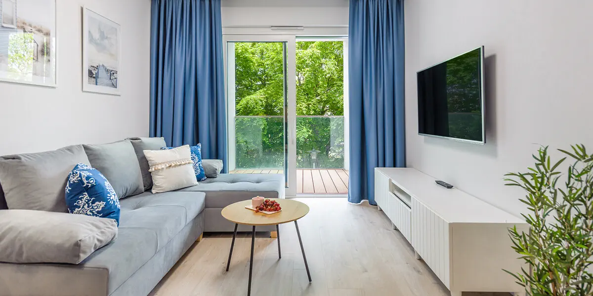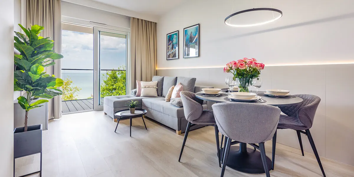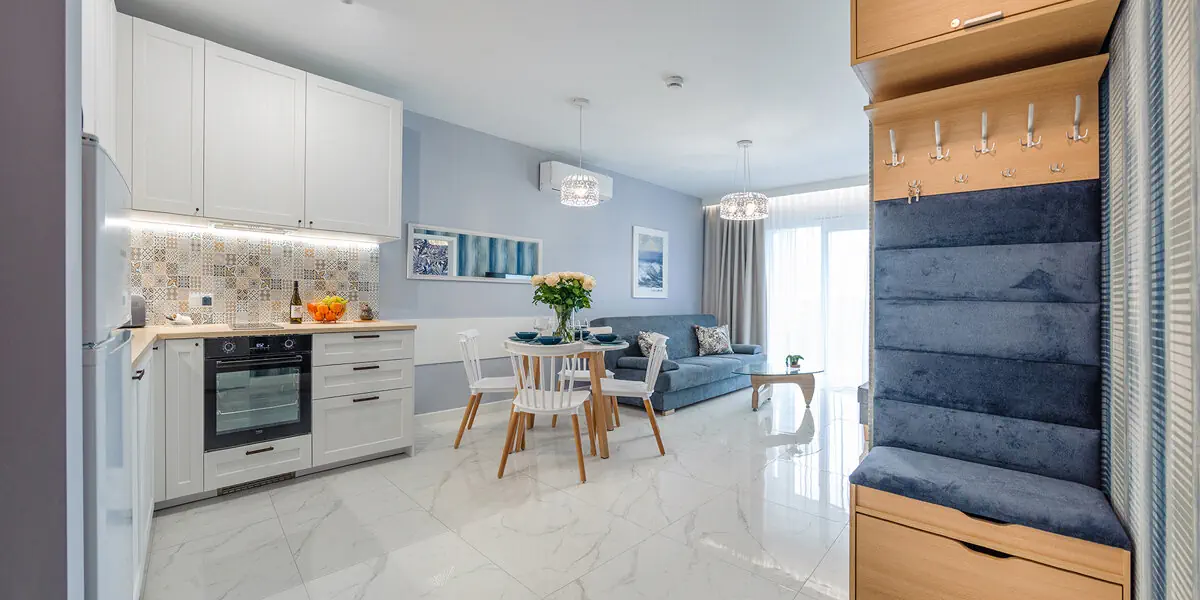 Komfortowy apartament z 1 sypialnią, wielofunkcyjnym pokojem dziennym, klimatyzacją, łazienką i balkonem. W wyposażeniu rozkładana kanapa, nowoczesny aneks kuchenny (zmywarka, lodówka, czajnik, ekspres do kawy, naczynia i sztućce), smart TV, Wi-Fi, stół z krzesłami, w łazience pralka, kabina prysznicowa, suszarka do włosów, kosmetyki