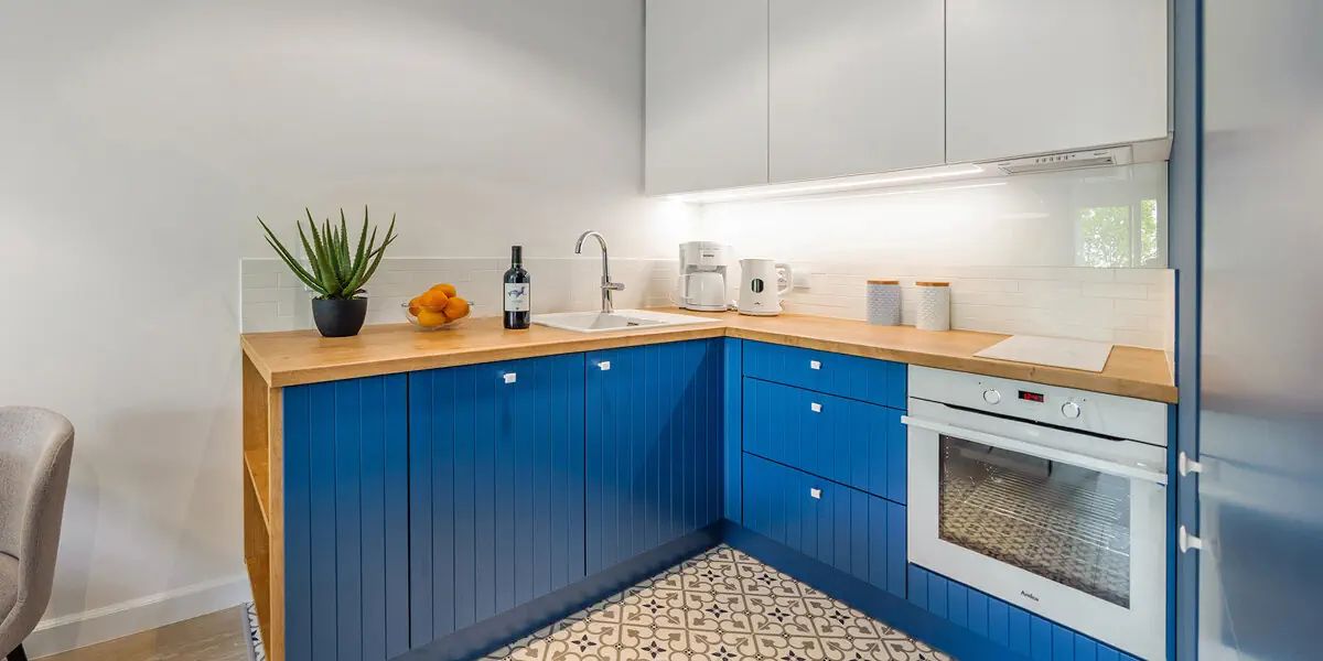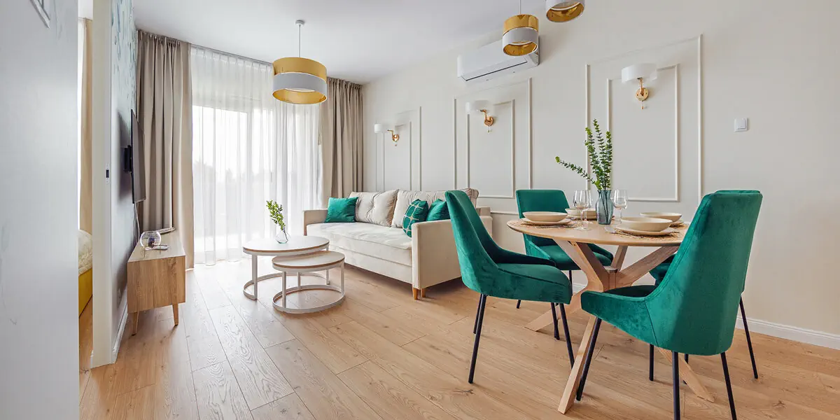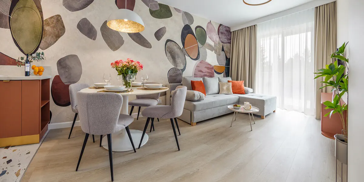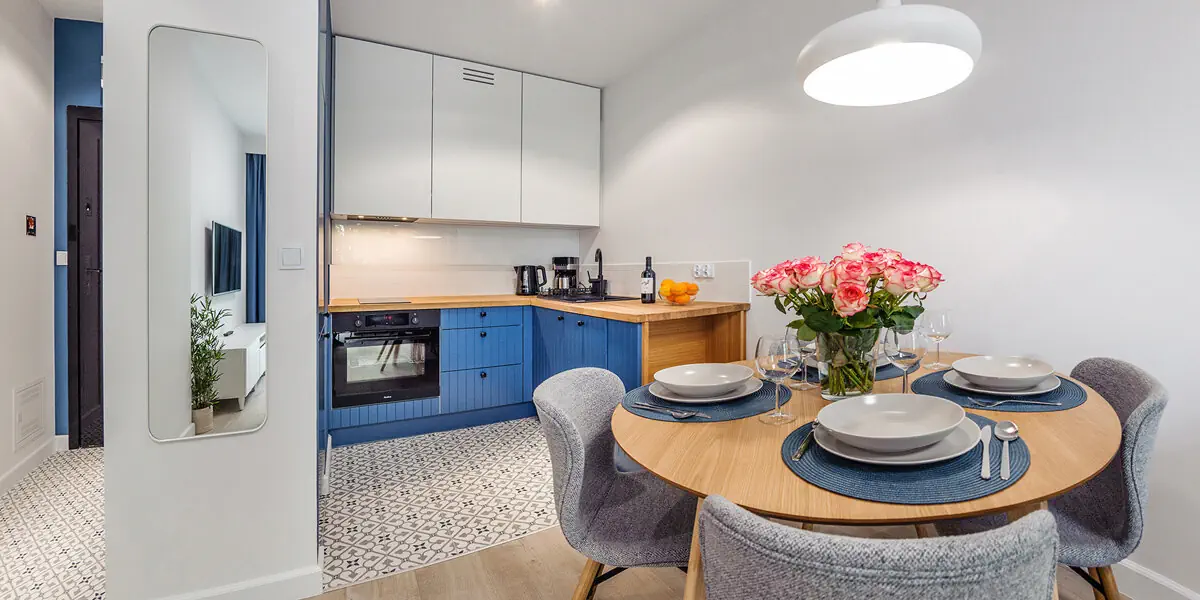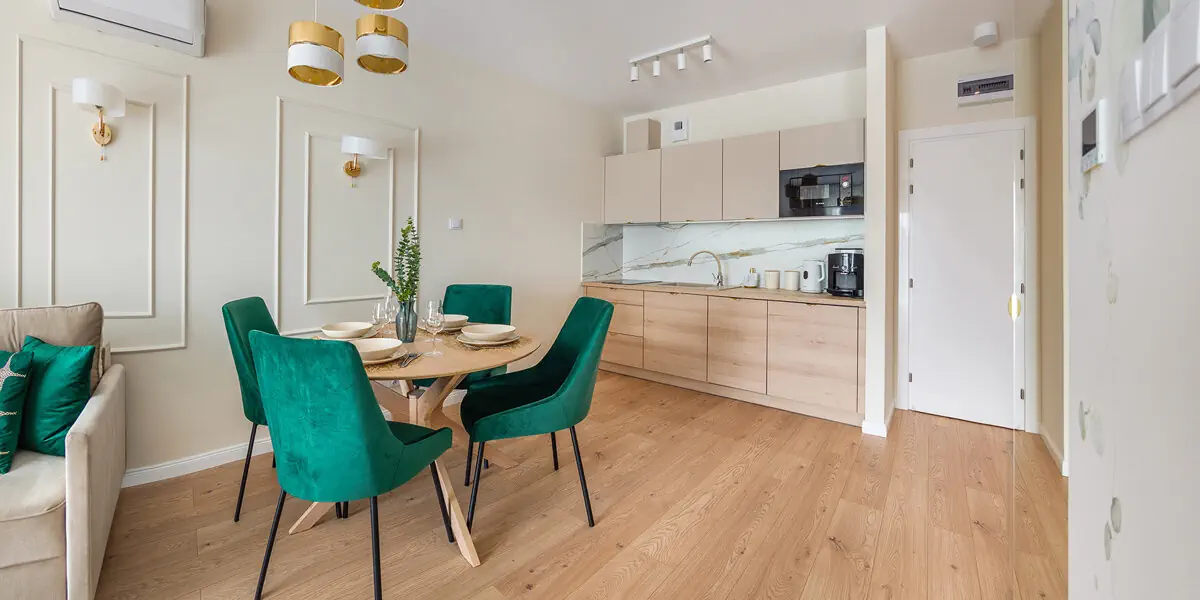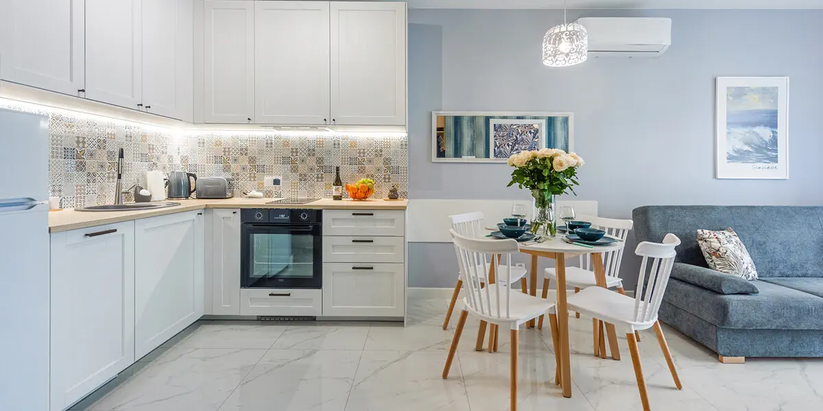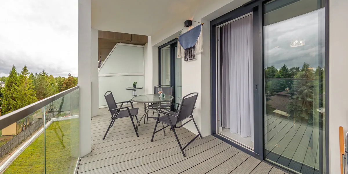Komfortowy apartament z 1 sypialnią, wielofunkcyjnym pokojem dziennym, klimatyzacją, łazienką i balkonem. W wyposażeniu rozkładana kanapa, nowoczesny aneks kuchenny (zmywarka, lodówka, czajnik, ekspres do kawy, naczynia i sztućce), smart TV, Wi-Fi, stół z krzesłami, w łazience pralka, kabina prysznicowa, suszarka do włosów, kosmetyki
