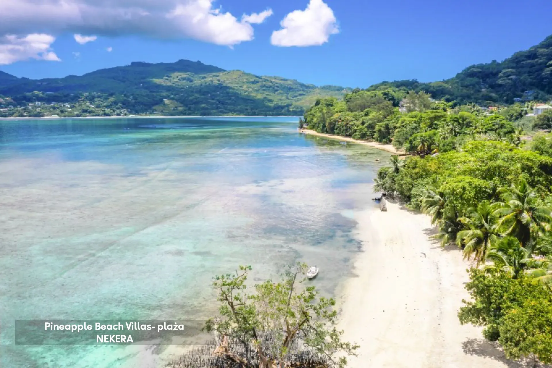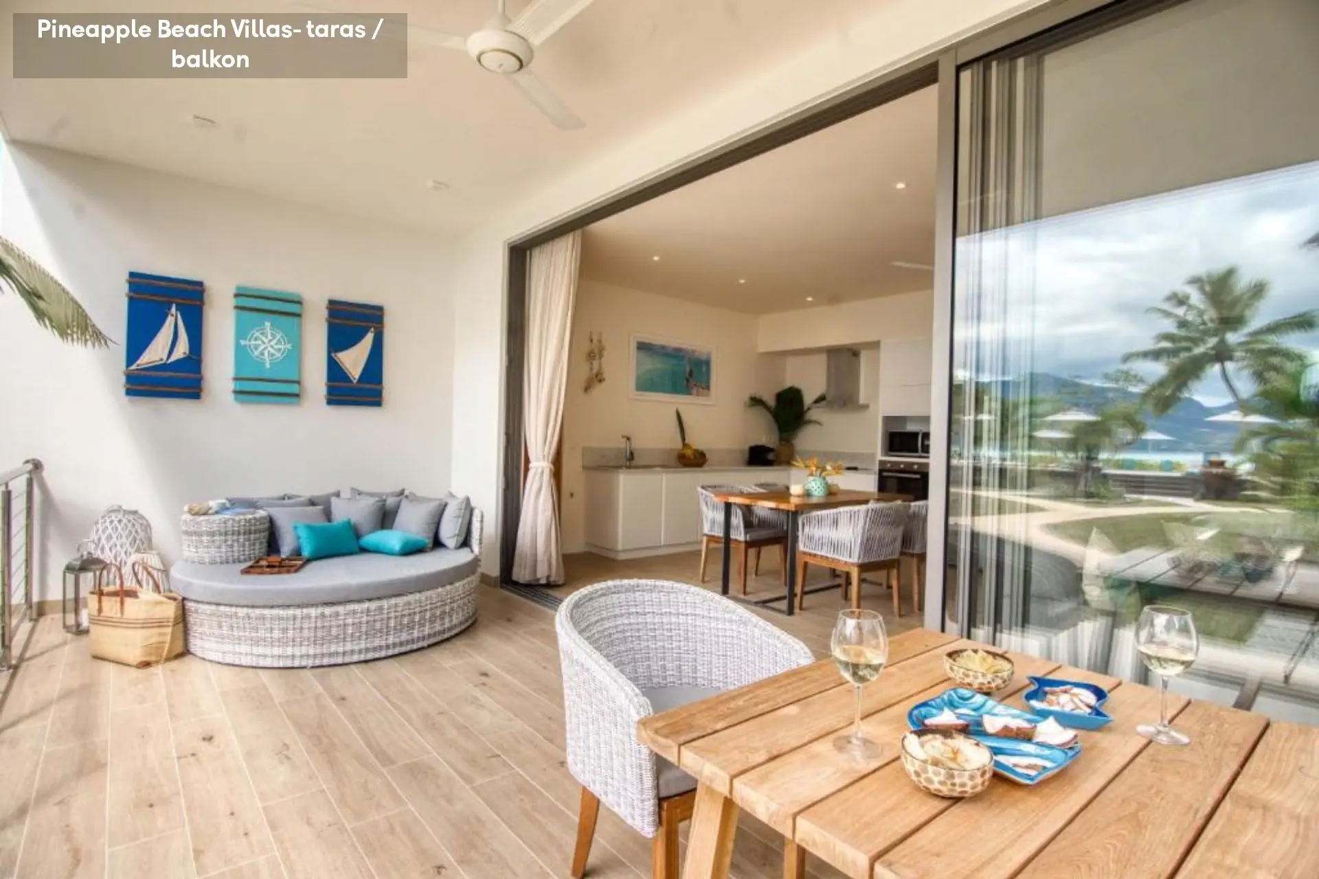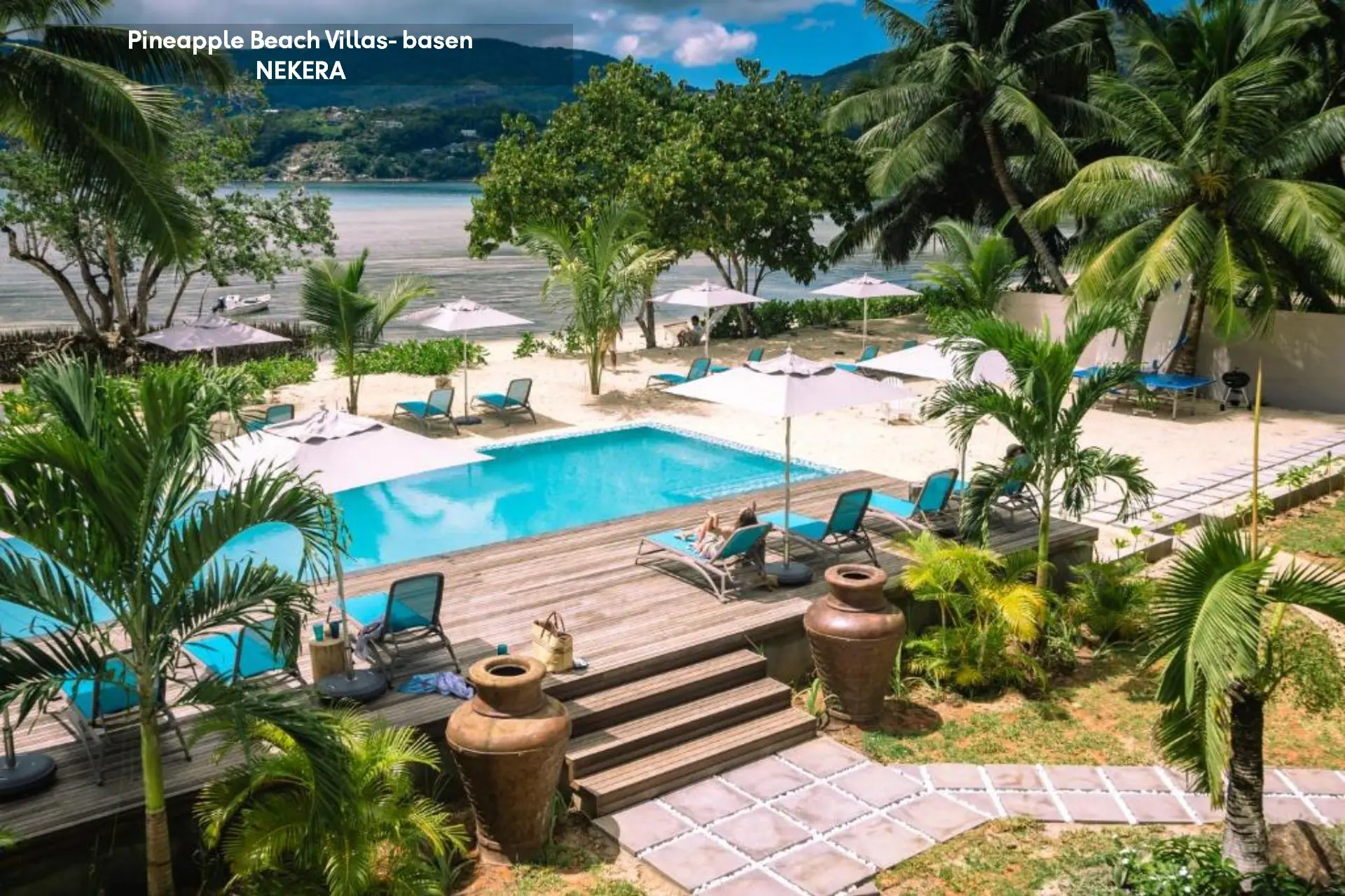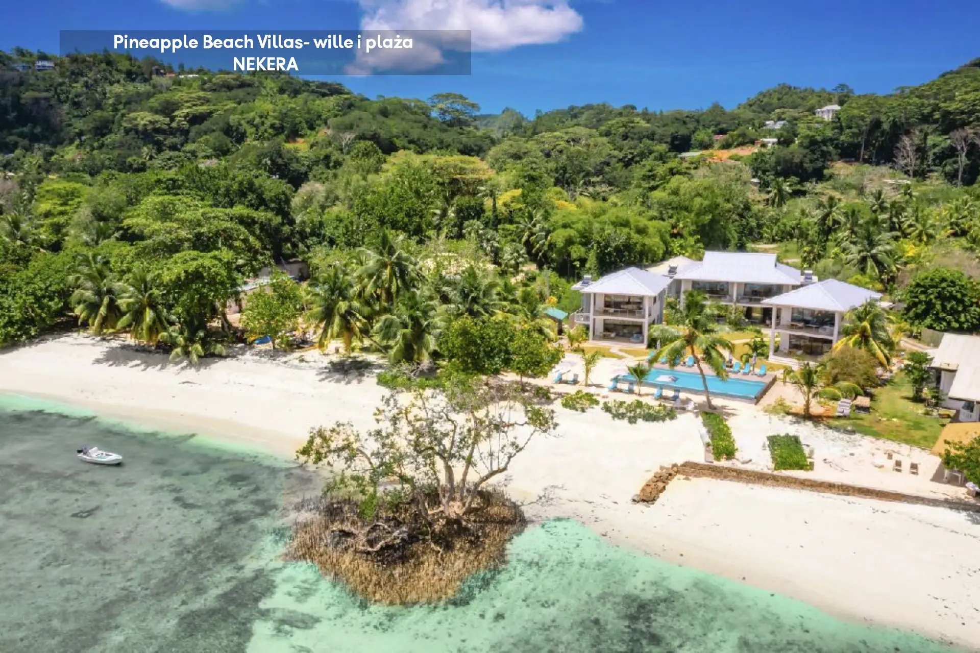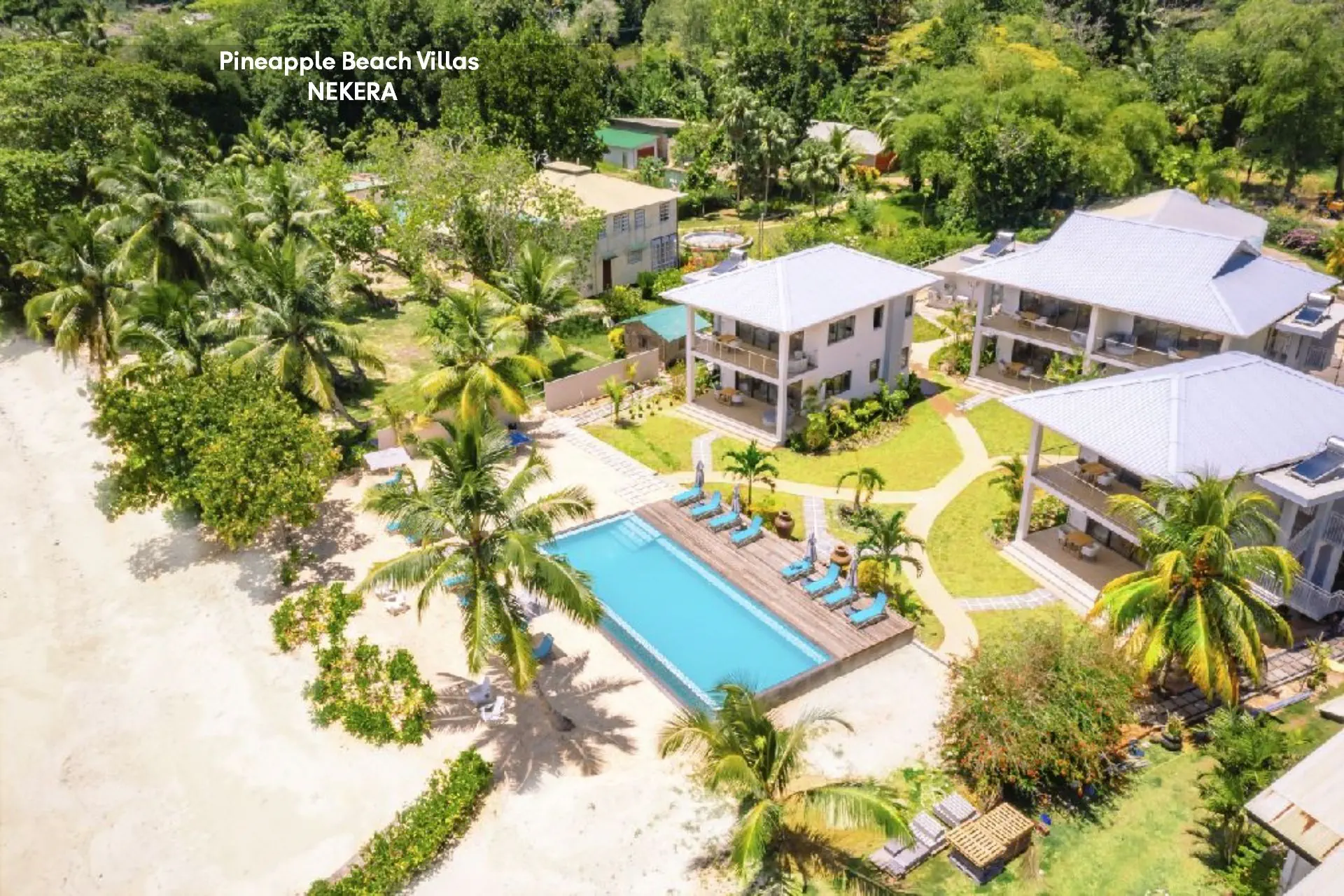 Pineapple Beach Villas składa się z 8 willi z własnym wyżywieniem, w doskonałej lokalizacji na południu Mahe. Wille położone są na białej, piaszczystej plaży, przed wyjątkową rafą koralową. Wokół willi znajduje się duży tropikalny ogród i główny taras z basenem, leżakami, grillami. Same wille są zaprojektowane tak, aby czuć się jak w domu, będąc z dala z dala od domu. Wszystkie wille posiadają jedną sypialnię z łóżkiem King Size XL oraz łazienkę z prysznicem. Do dyspozycji Gości jest w pełni wyposażona kuchnia na otwartym planie oraz salon z rozkładaną sofą, a także weranda