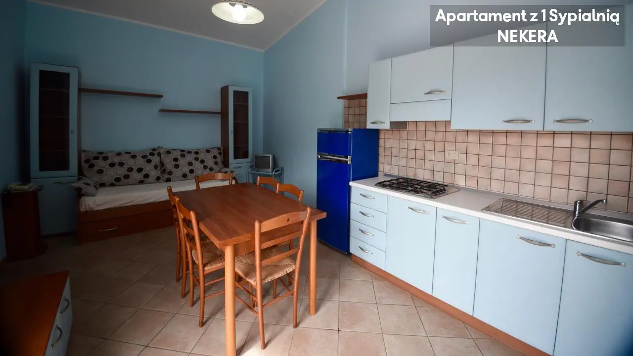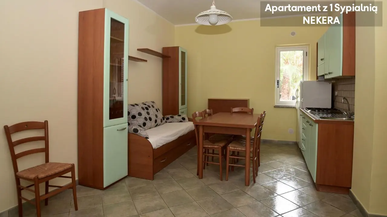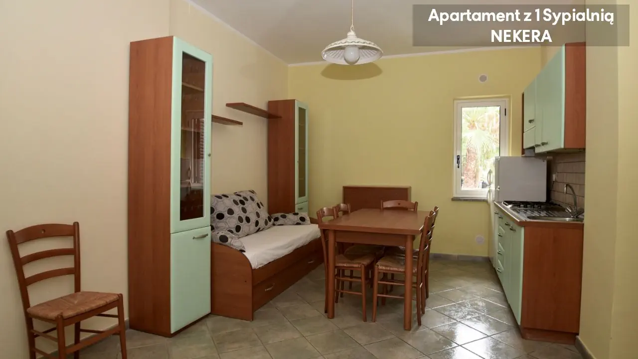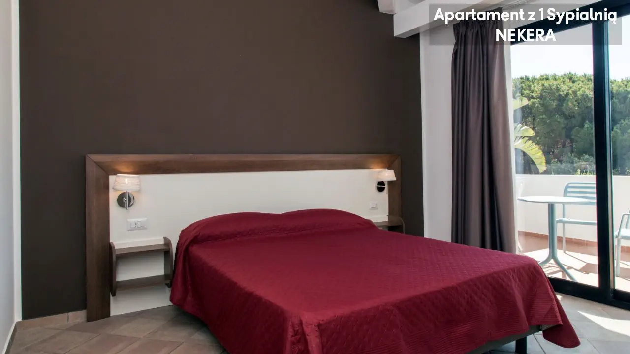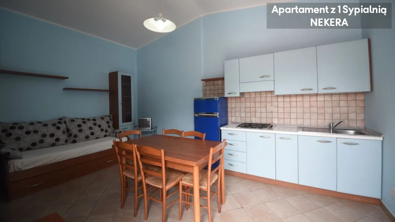 Apartament z 1 sypialnią ok 40 m2 dla max 4 osób dorosłych, sypialnia z łóżkiem podwójnym oraz salon z w pełni wyposażonym aneksem kuchennym i sofą, klimatyzacja, TV – Sat., prywatna łazienka (prysznic, suszarka do włosów, zestaw mini kosmetyków), umeblowany balkon lub taras. Woda, gaz, prąd i końcowe sprzątanie wliczone w cenę.
