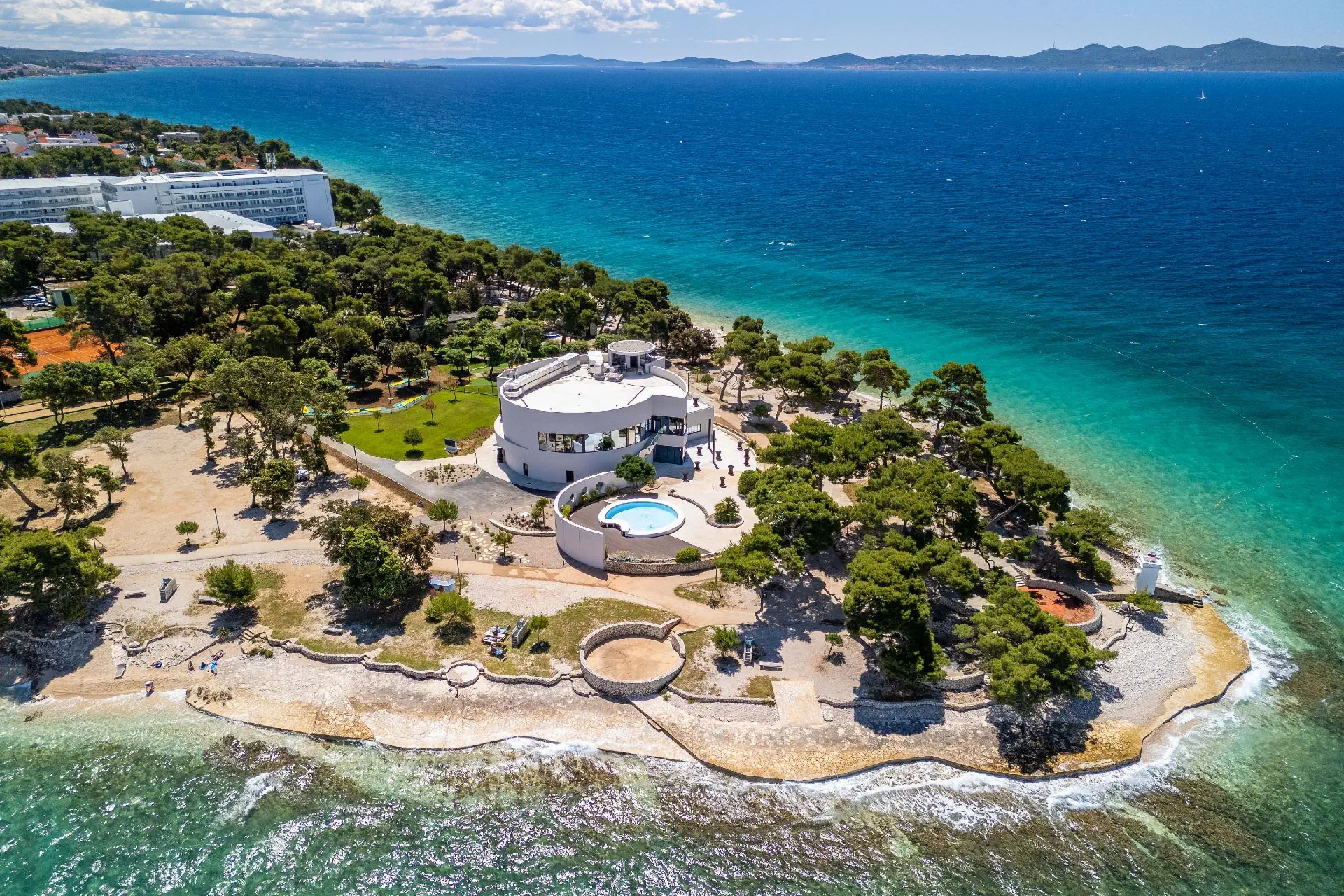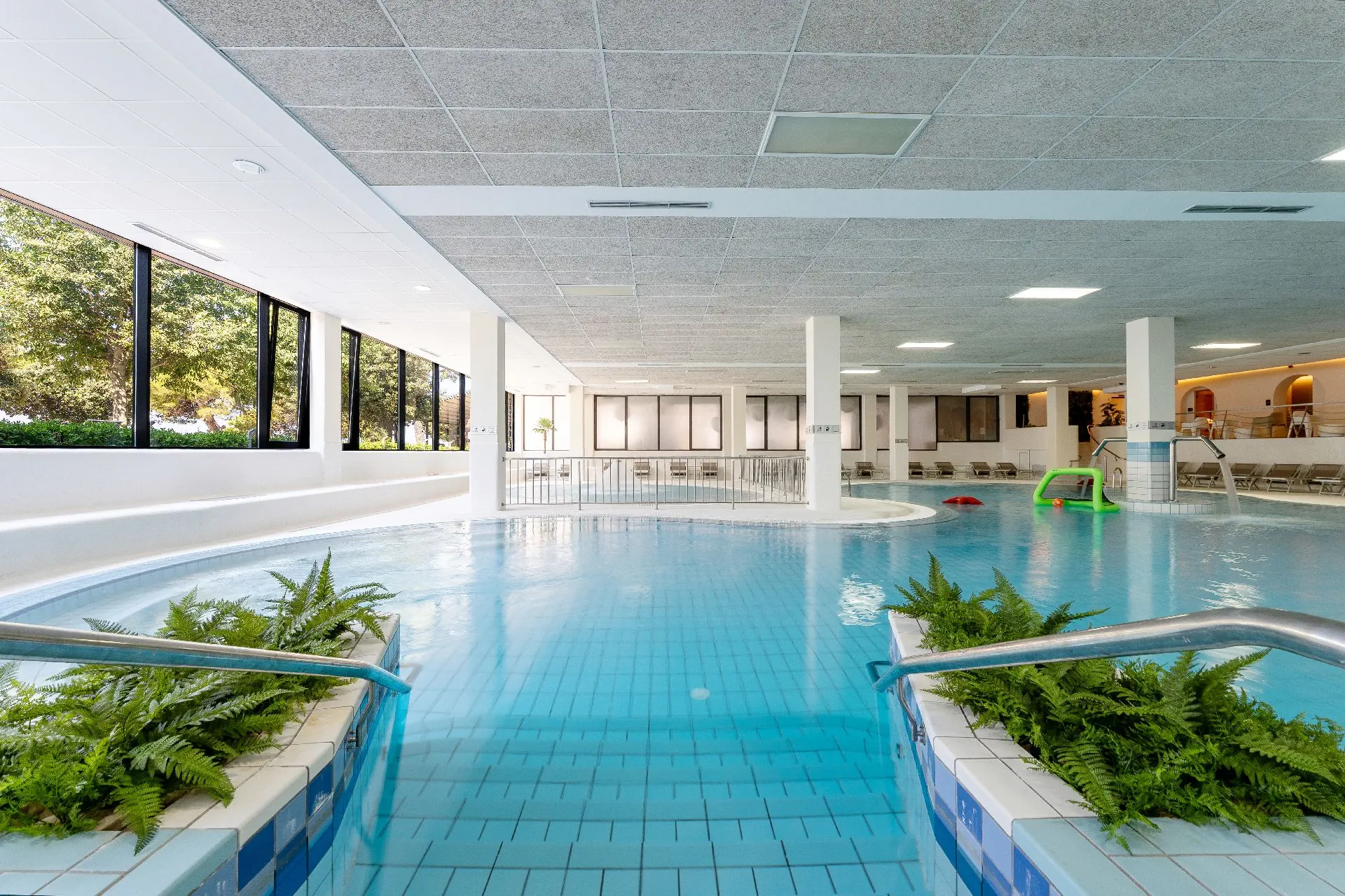 odkryty z hydromasażem i basen dla dzieci ze słodką wodą oraz kryty z hydromasażem (23 x 25 m, głębokość 120 cm) z podgrzewaną słodką wodą (czynny poza sezonem).