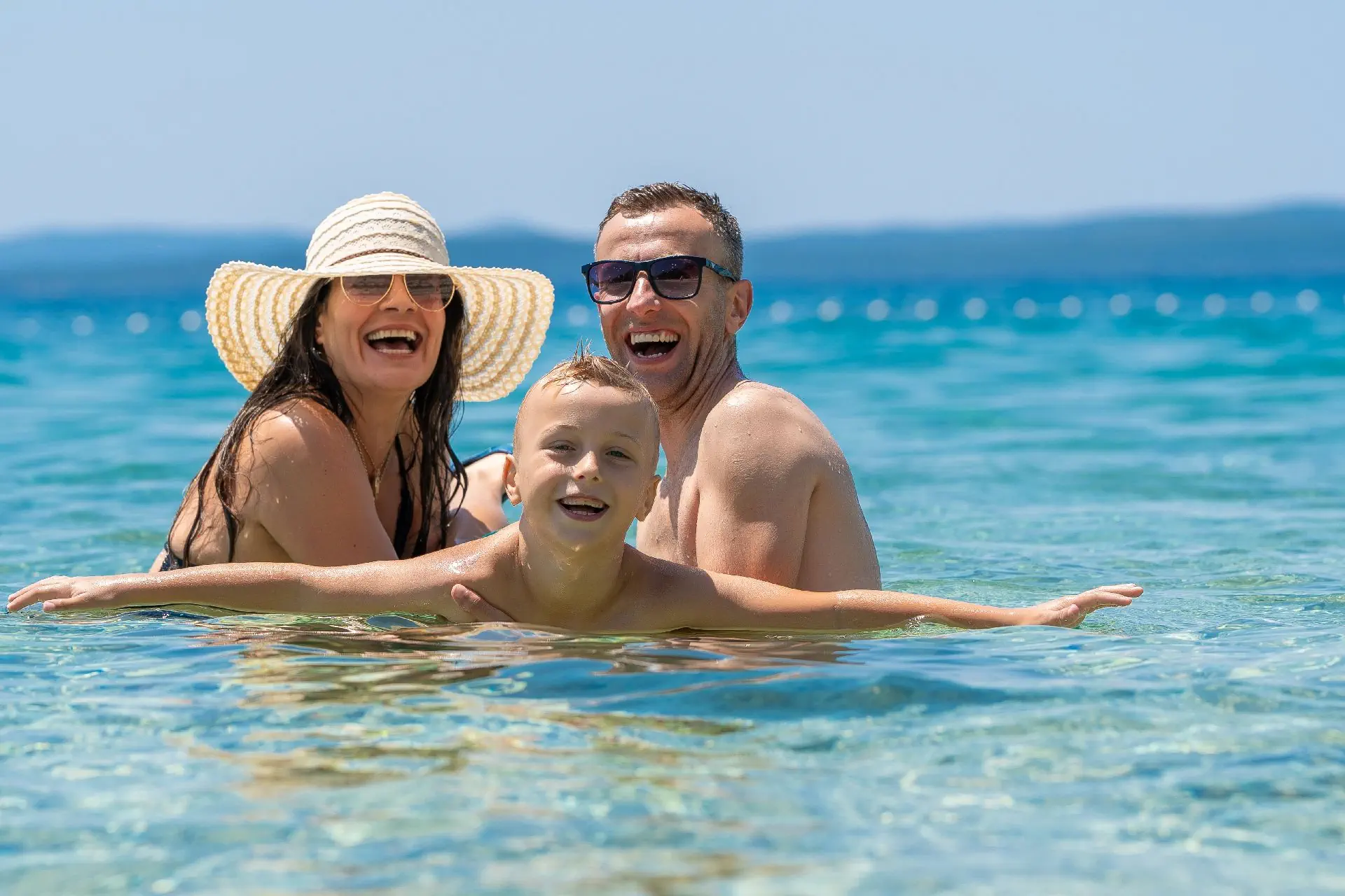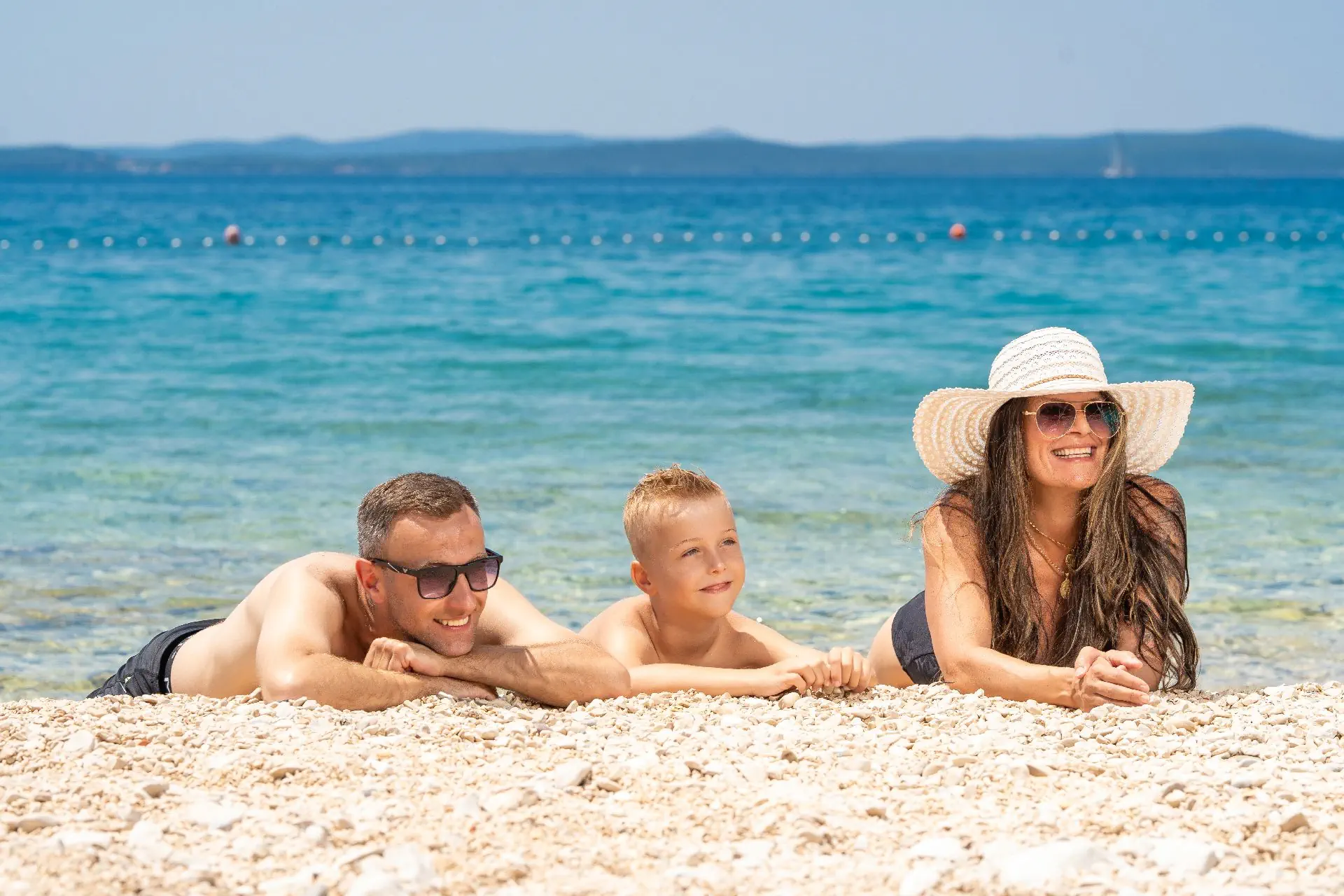 oddalona o ok. 30 m., żwirowa, kamienista i skalista. Leżaki w terminie 01.06.-15.09.2026 (odpłatnie: 10 EUR osoba/dzień). Prysznice i przebieralnie na plaży.