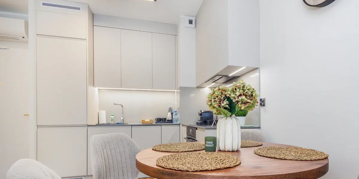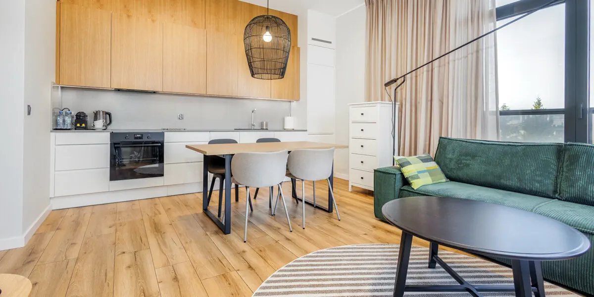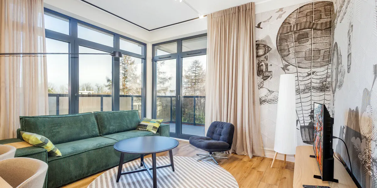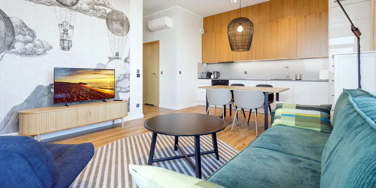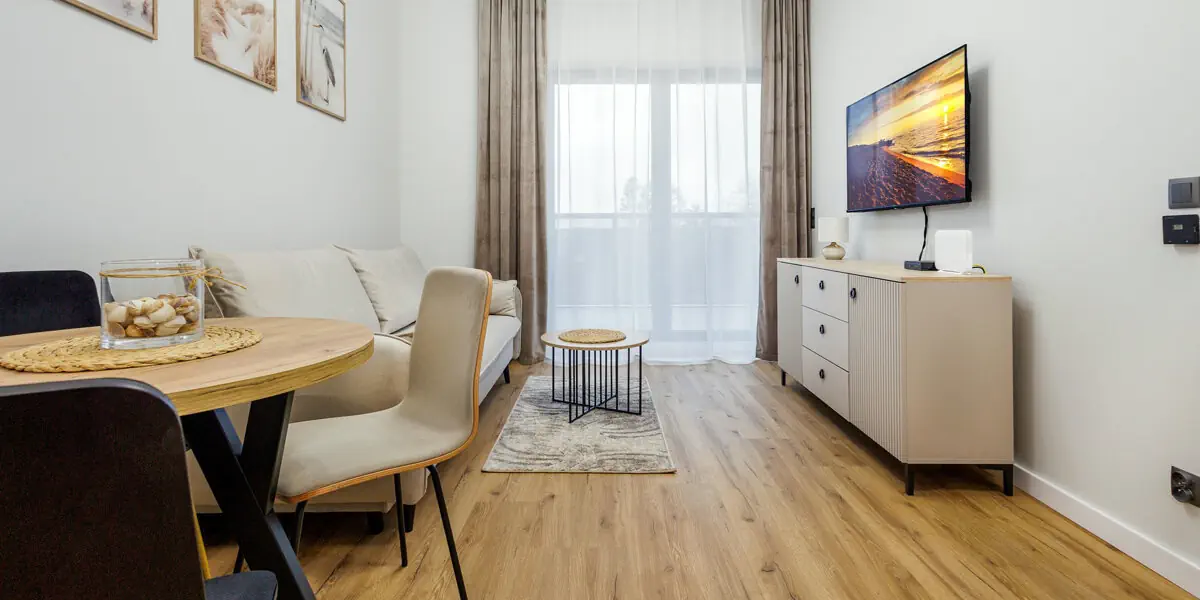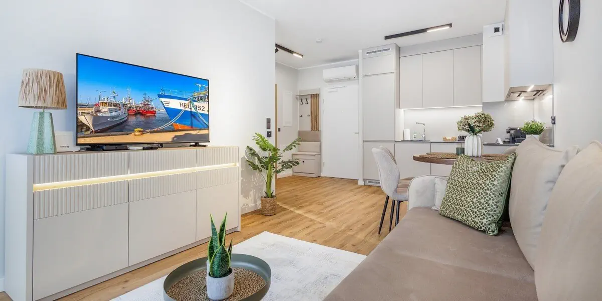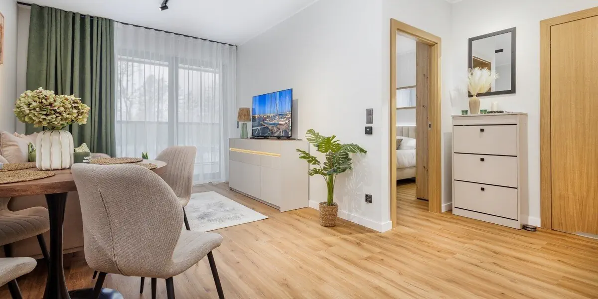 Nowoczesny, kameralny apartament z funkcjonalnym wyposażeniem. Salon z sofą, kącikiem jadalnianym i aneksem kuchennym, odrębna sypialnia, balkon, nowoczesna łazienka z pralką.