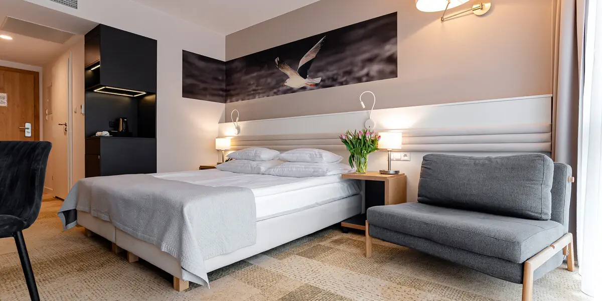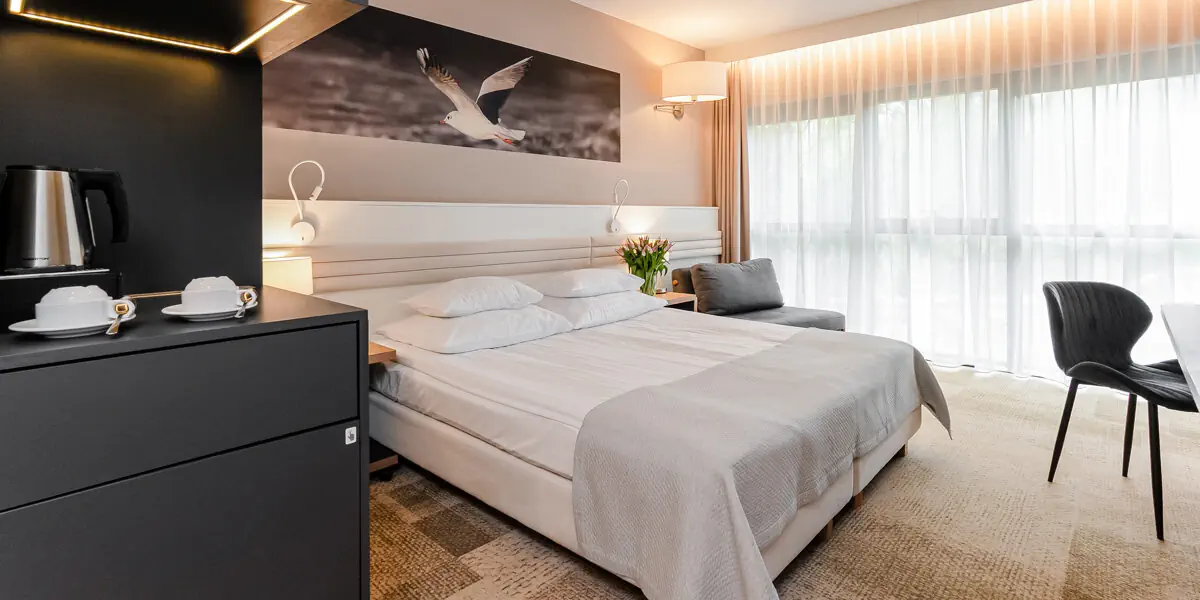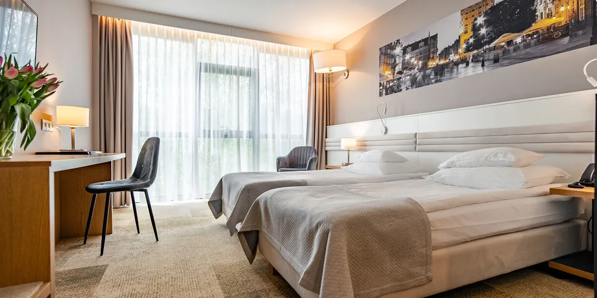 Komfortowy pokój wyposażony w: telewizor, Wi-Fi, telefon, indywidualny system klimatyzacyjno-grzewczy, mini-barek, biurko, zestaw do parzenia kawy i herbaty, łazienka z kabiną prysznicową, suszarką do włosów i ręcznikami