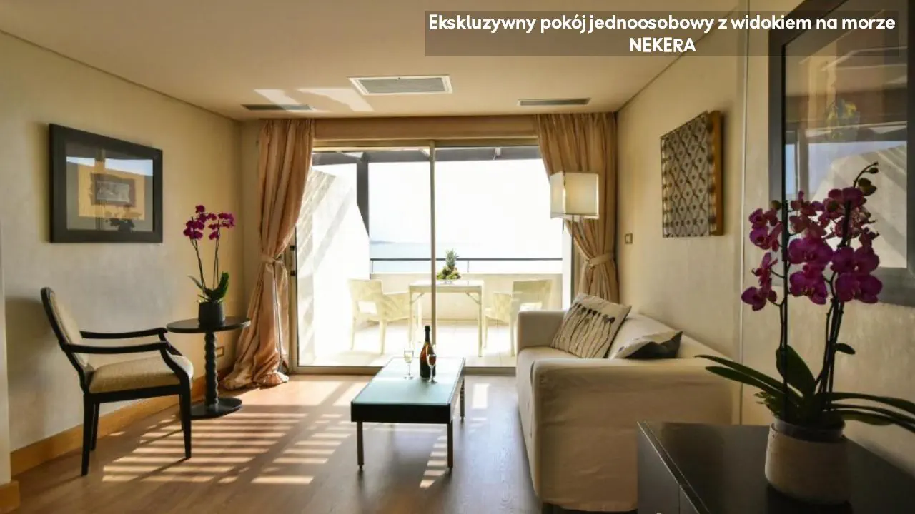 Pokój rodzinny exclusive EXCLUSIVE FAMILY: ok. 40 m2, mogący zakwaterować od czterech osób, jedno łóżko podwójne/ dwa łóżka pojedyncze i sofa dla dwóch osób; klimatyzacja, sejf, minibar, TV, Wi-Fi, prywatna łazienka (wanna/ prysznic, toaleta, kosmetyki do kąpieli, suszarka do włosów), balkon z widokiem na morze. Pokój dwuosobowy exclusive EXCLUSIVE DOUBLE: ok. 40 m2, mogące zakwaterować dwie osoby dorosłe i dwójkę dzieci; jedno łóżko podwójne/ dwa łóżka pojedyncze i sofa balkon z widokiem na morze; poza tym wyposażone jak pokój rodzinny exclusive EXCLUSIVE FAMILY. Pokój trzyosobowy exclusive EXCLUSIVE TRIPLE: ok. 40 m2, mogący zakwaterować trzy osoby dorosłe i dwójkę dzieci; jedno łóżko podwójne/ dwa łóżka pojedyncze i sofa, balkon z widokiem na morze; poza tym wyposażone jak pokój rodzinny exclusive EXCLUSIVE FAMILY. Pokój dwuosobowy comfort COMFORT DOUBLE: ok. 28 m2, mogący zakwaterować dwie osoby, jedno łóżko podwójne lub dwa łóżka pojedyncze, balkon z widokiem na miasto; poza tym wyposażone jak pokój rodzinny exclusive EXCLUSIVE FAMILY. Pokój trzyosobowy comfort COMFORT TRIPLE: ok. 32 m2, mogący zakwaterować do czterech osób; jedno łóżko podwójne/ dwa łóżka pojedyncze i sofa; balkon z widokiem na miasto; poza tym wyposażone jak pokój rodzinny exclusive EXCLUSIVE FAMILY. Pokój rodzinny comfort COMFORT FAMILY: ok. 32 m2, mogący zakwaterować do czterech osób; jedno łóżko podwójne/ dwa łóżka pojedyncze i sofa, balkon z widokiem na miasto; poza tym wyposażone jak pokój rodzinny exclusive EXCLUSIVE FAMILY. Pokój exclusive z tarasem EXCLUSIVE LOBBY: ok. 40 m2, mogący zakwaterować do czterech osób; jedno łóżko podwójne/ dwa łóżka pojedyncze i sofa; umeblowany taras z widokiem na morze i ogród; poza tym wyposażone jak pokój rodzinny exclusive EXCLUSIVE FAMILY.