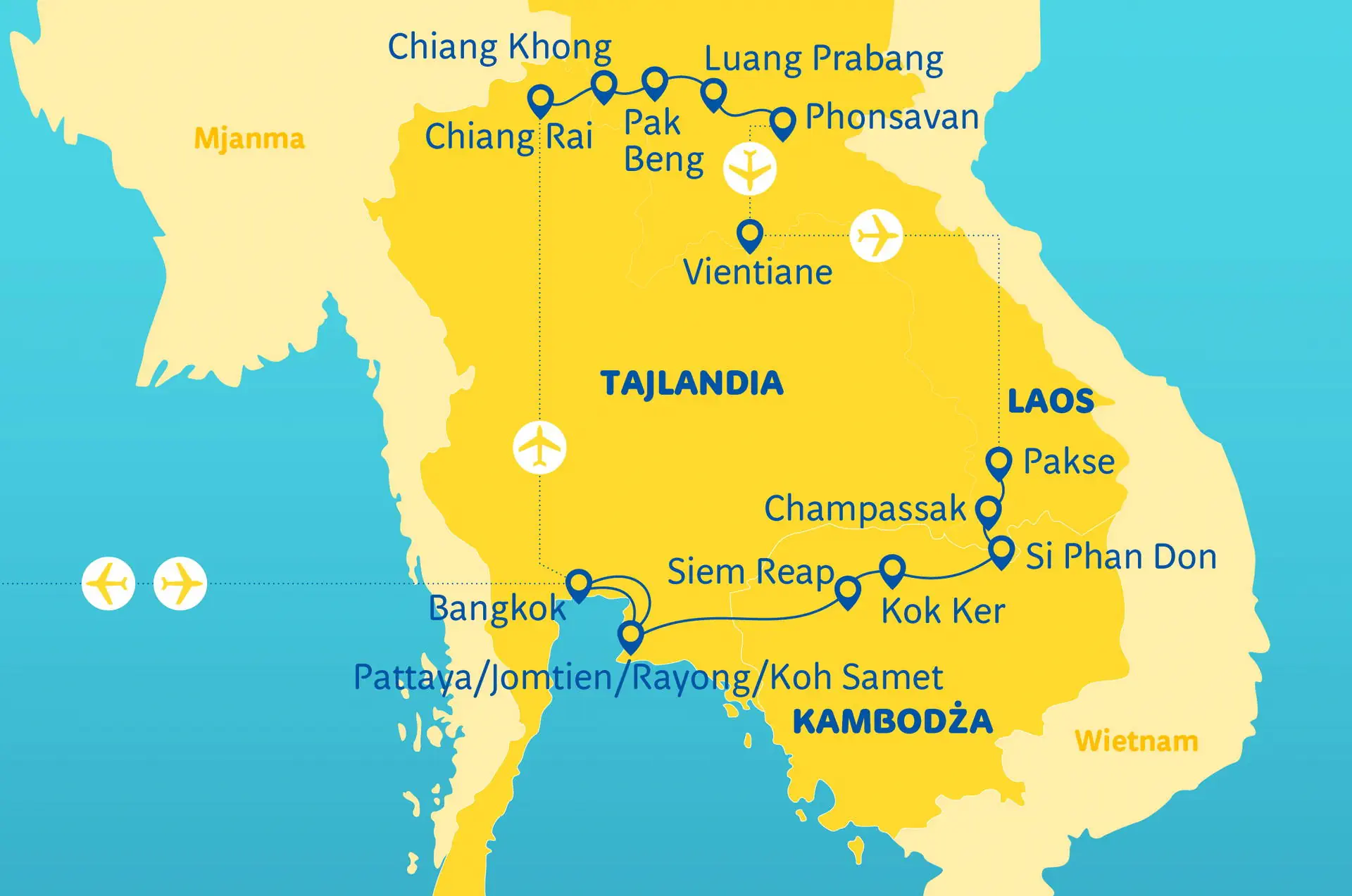 Do dyspozycji gości w hotelach restauracja, recepcja, bar Zakwaterowanie Hotele klasy ** na terenie Laosu i ***/**** na terenie Tajlandii i Kambodży (w ocenie organizatora). Należy jednak pamiętać, że w Kambodży i Laosie standard hoteli może nieco odbiegać od norm europejskich (w Tajlandii, Laosie i Kambodży nie istnieje oficjalna kategoryzacja hoteli, hotele pozostawiają kategoryzację organizatorom turystyki). Pokoje: skromne, ale wygodnie urządzone z łazienkami. W większości TV, klimatyzacja i telefon, czasami minibar (dodatkowo płatny). Pokój 3 - osobowy, to z reguły pokój 2-osobowy z dostawką (dostawka na ogół w formie łóżka polowego lub rozkładanej kanapy). Część pobytowa. Hotele: opisy hoteli w sekcji Wypoczynek Tajlandia (Jomtien/Pattaya, Rayong, Koh Samet lub Koh Chang) i w systemie rezerwacyjnym R.pl.