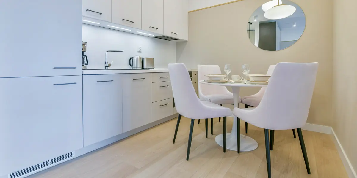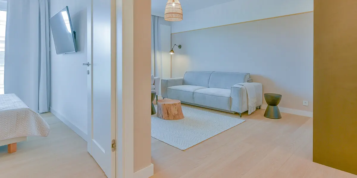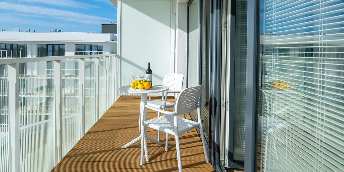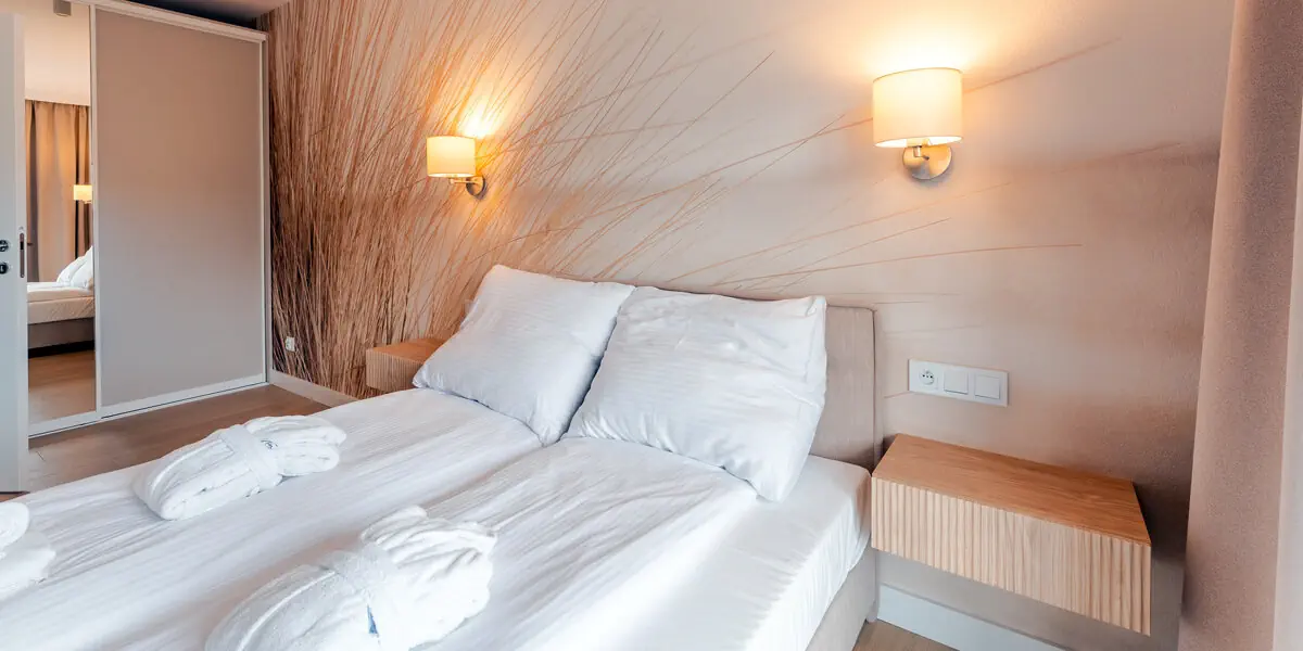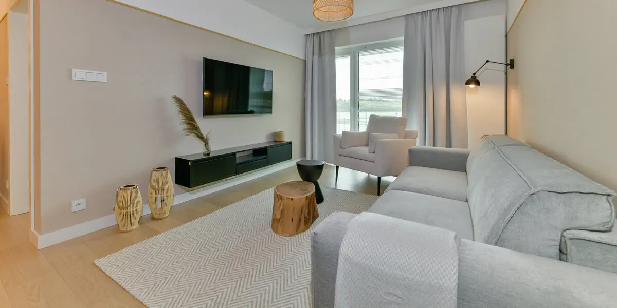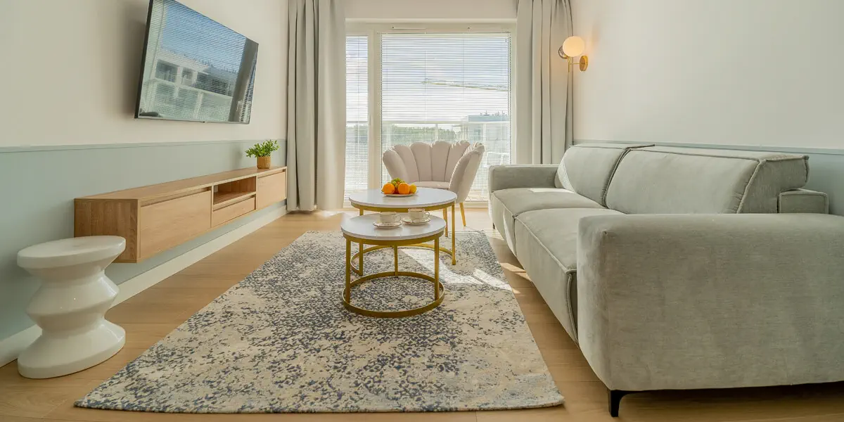 Kompleksowo wyposażony apartament 2-pokojowy z 1 sypialnią, pokojem dziennym z aneksem kuchennym, sofą i częścią jadalną oraz balkonem i łazienką. Utrzymany w stonowanych kolorach