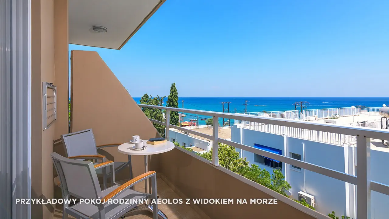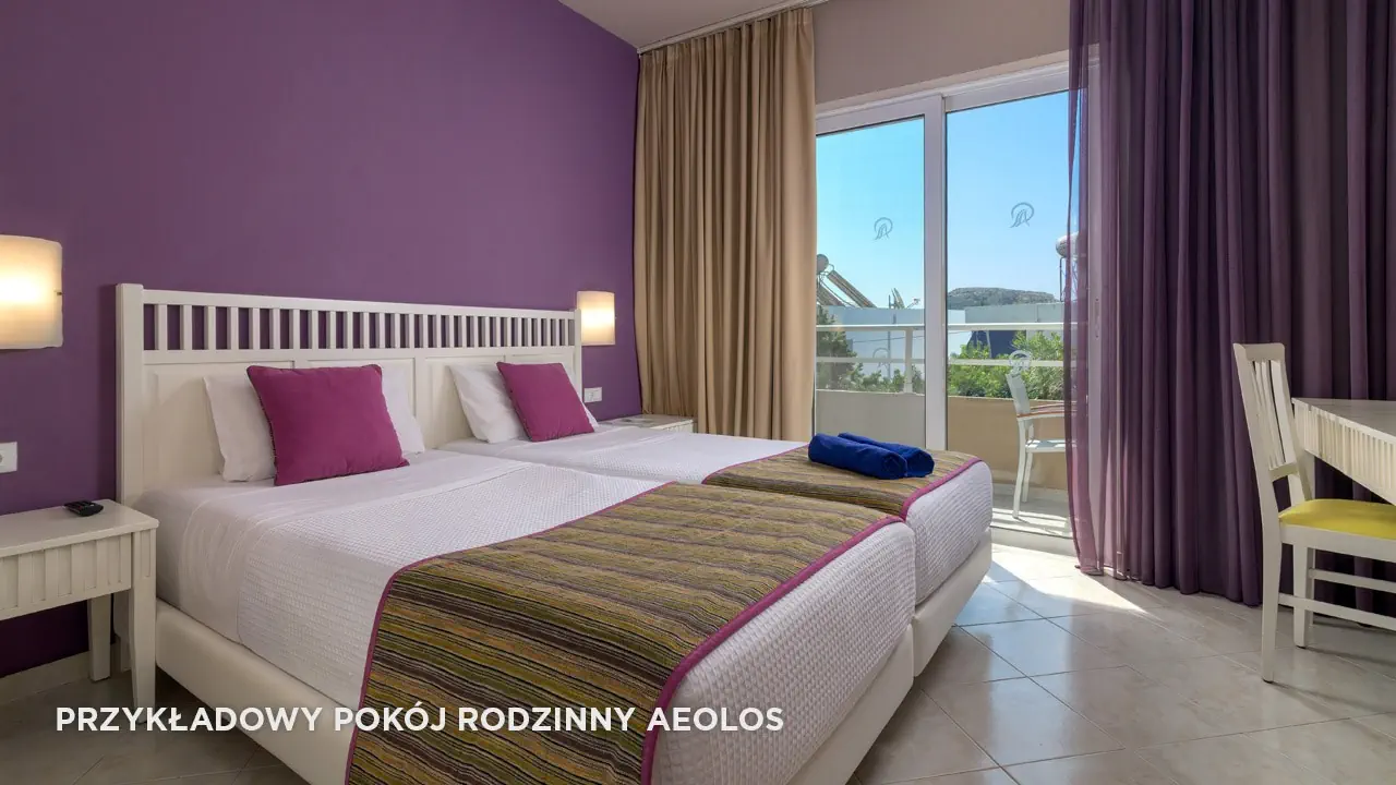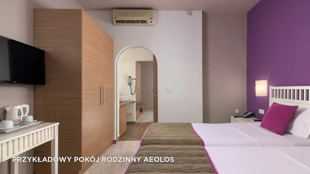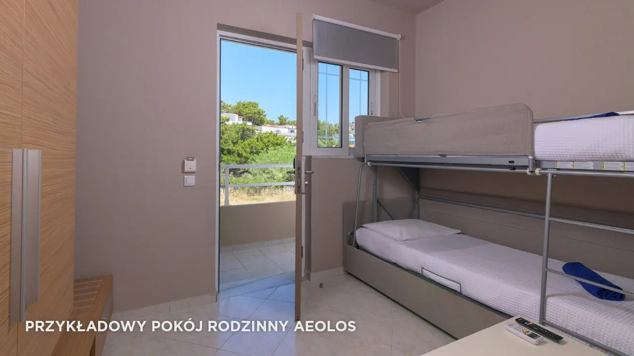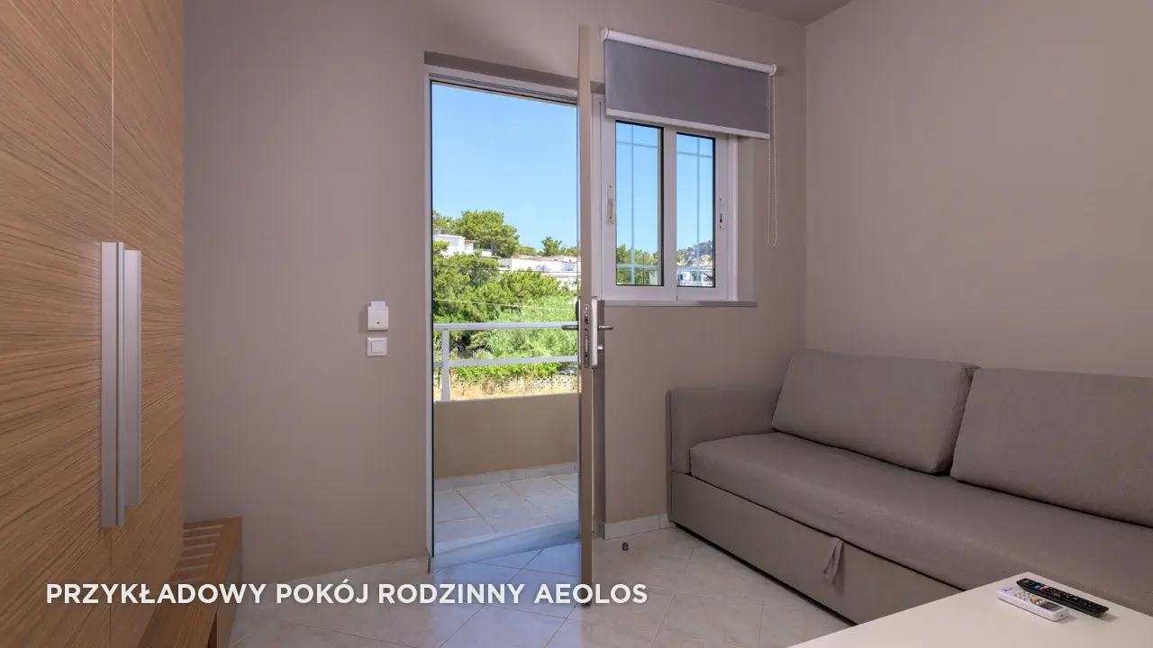 Standard• 2-3 os. (ok. 21-24 m2)• dostawka dla 3. osoby (rozkładana sofa)• klimatyzacja indywidualna (bezpłatna)• Wi-Fi (bezpłatne)• sejf (bezpłatny)• TV-SAT, telefon• mini-lodówka• zestaw do kawy/herbaty• łazienka - wanna/prysznic, suszarka• balkon lub taras• widok na morze za dopłatąRodzinny Aeolos• 2-4 os. (ok. 23 m2)• dostawka dla 1. i 2. dziecka (łóżko piętrowe lub sofa)• dwa pomieszczenia oddzielone drzwiami• wyposażony jak pokój standard• balkon lub taras• widok na morze za dopłatą• zlokalizowany w budynku bocznym AeolosSuperior rodzinny• 3-4 os. (ok. 32-38 m2)• dostawka dla 3. i 4. osoby (rozkładana sofa)• sypialnia i pokój dzienny oddzielone przesuwnymi drzwiami• wyposażony jak pokój standard• widok na ogród lub góry• balkon lub taras