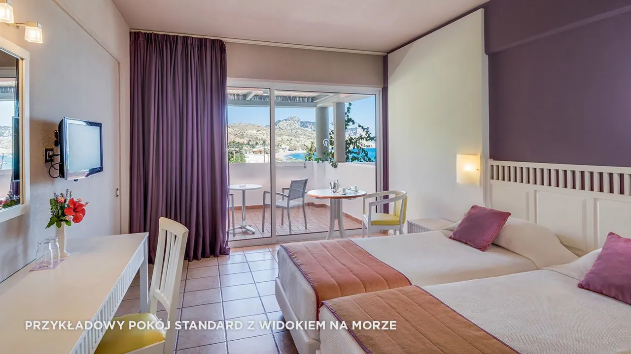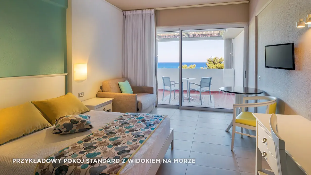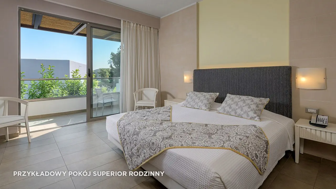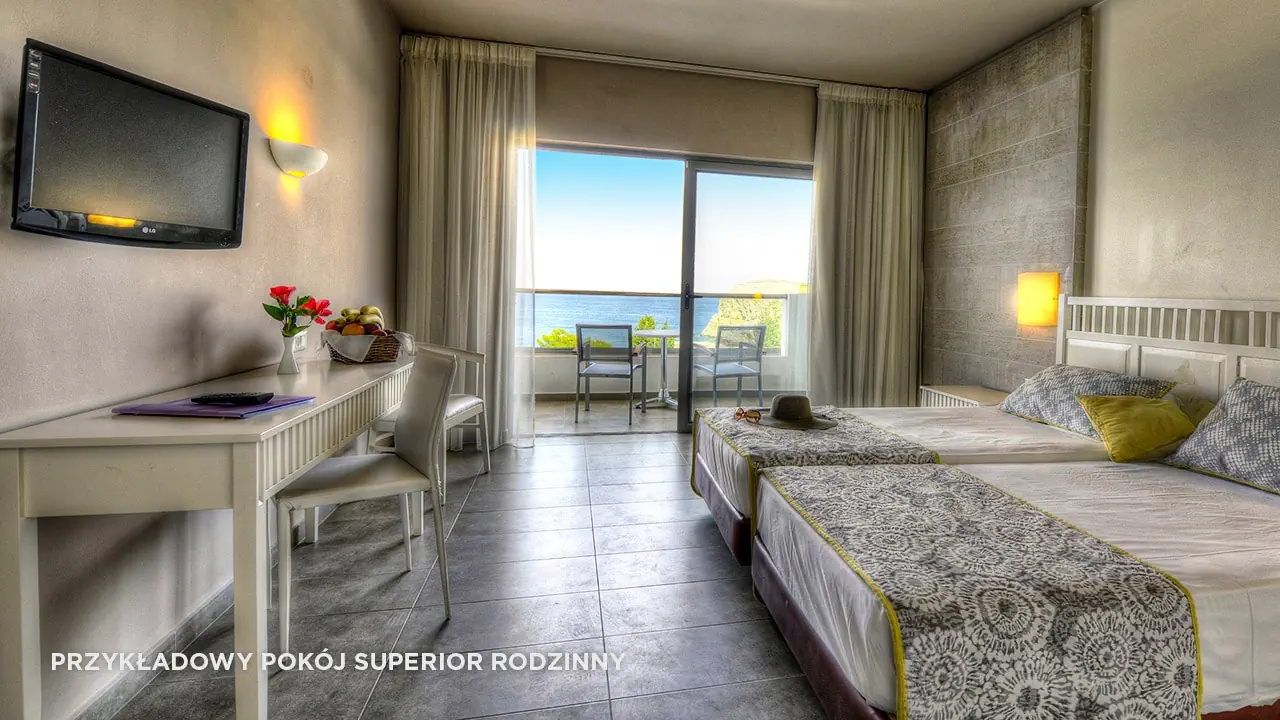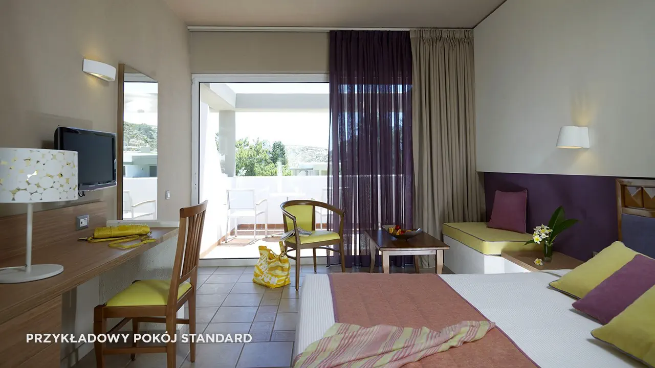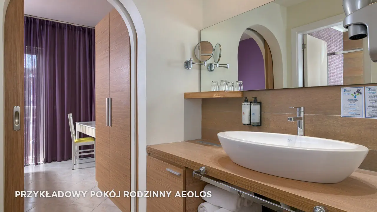 Standard• 2-3 os. (ok. 21-24 m2)• dostawka dla 3. osoby (rozkładana sofa)• klimatyzacja indywidualna (bezpłatna)• Wi-Fi (bezpłatne)• sejf (bezpłatny)• TV-SAT, telefon• mini-lodówka• zestaw do kawy/herbaty• łazienka - wanna/prysznic, suszarka• balkon lub taras• widok na morze za dopłatąRodzinny Aeolos• 2-4 os. (ok. 23 m2)• dostawka dla 1. i 2. dziecka (łóżko piętrowe lub sofa)• dwa pomieszczenia oddzielone drzwiami• wyposażony jak pokój standard• balkon lub taras• widok na morze za dopłatą• zlokalizowany w budynku bocznym AeolosSuperior rodzinny• 3-4 os. (ok. 32-38 m2)• dostawka dla 3. i 4. osoby (rozkładana sofa)• sypialnia i pokój dzienny oddzielone przesuwnymi drzwiami• wyposażony jak pokój standard• widok na ogród lub góry• balkon lub taras