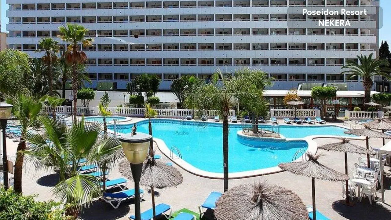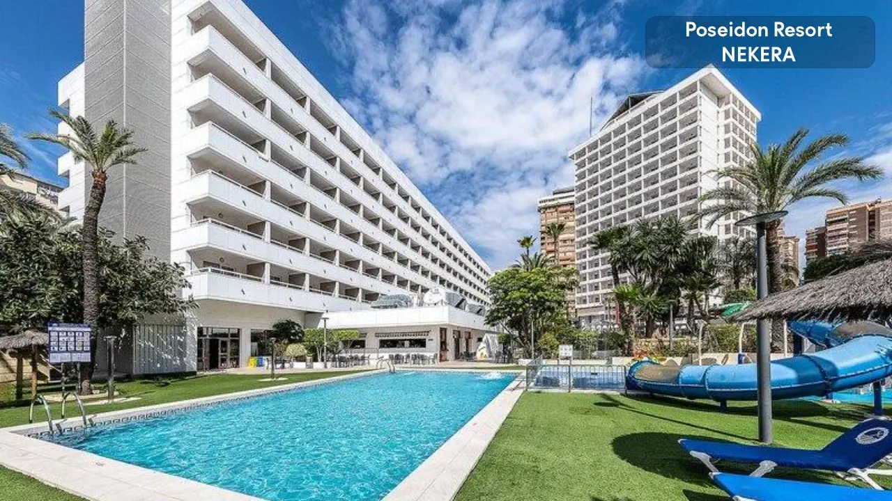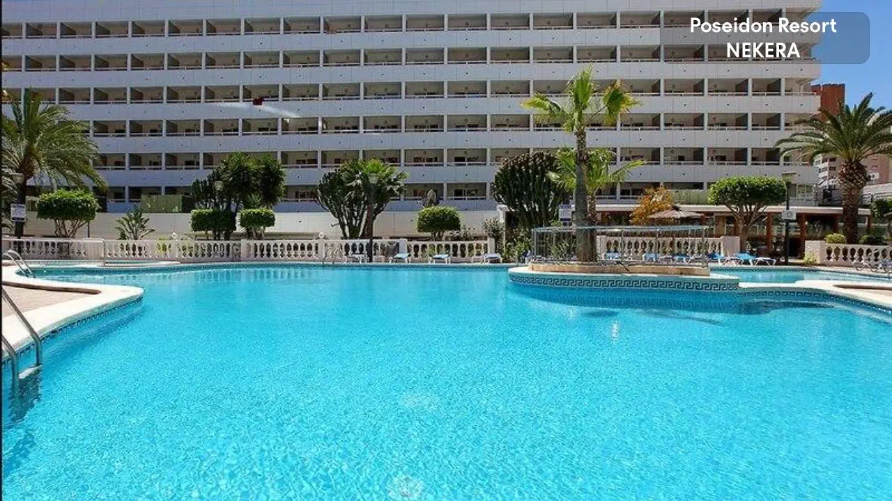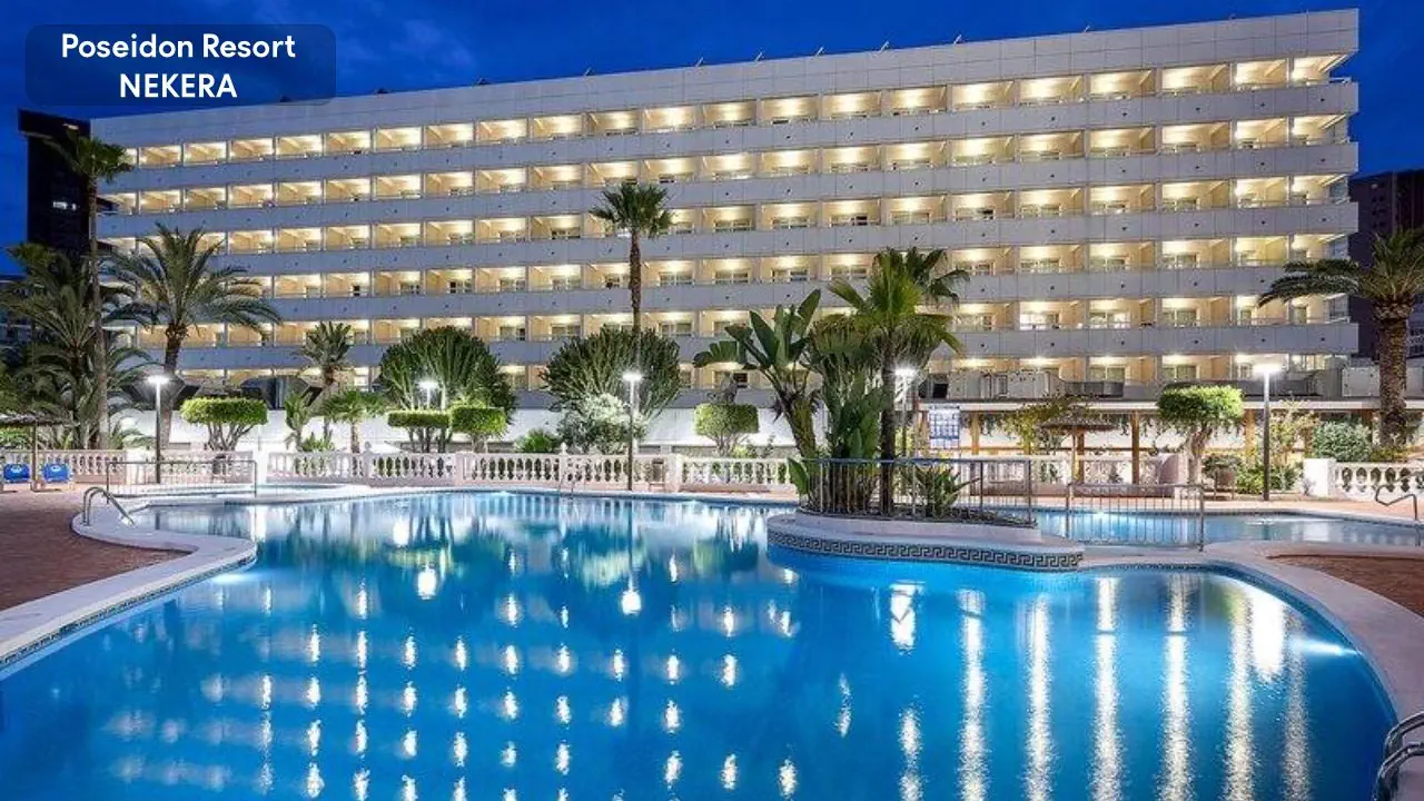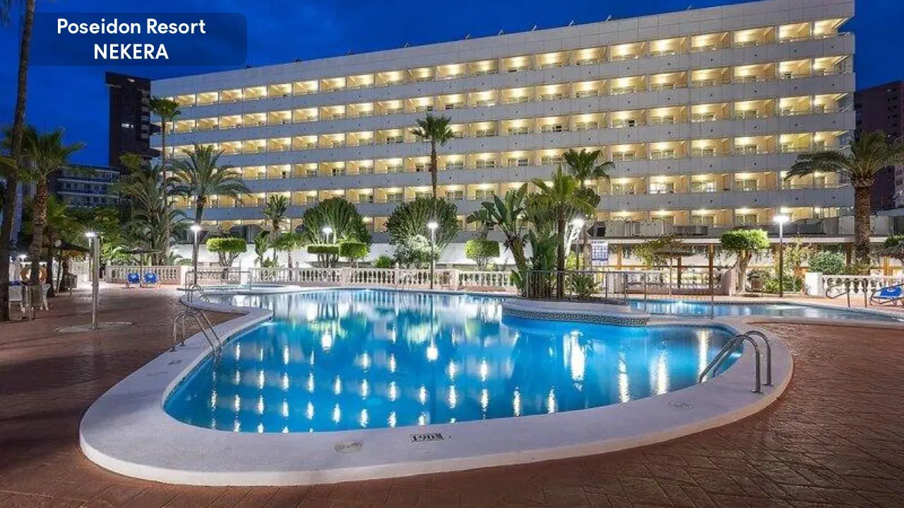 Hotel Poseidon Resort to trzygwiazdkowy obiekt, położony jest w centrum Benidormu, niedaleko centrum miasta, co zapewnia łatwy dostęp do lokalnych atrakcji i rozrywek. Na terenie obiektu znajdują się dwa odkryte baseny,, centrum fitness oraz sala zabaw dla dzieci. Goście mogą korzystać z różnorodnych programów animacyjnych dla dzieci i dorosłych, a także z mini klubu dostępnego w sezonie letnim. Pokoje wyposażone są w klimatyzację (czynną w sezonie), telewizor, bezpłatne Wi-Fi oraz łazienkę z wanną lub prysznicem i suszarką do włosów.