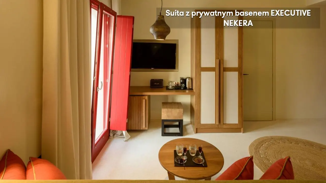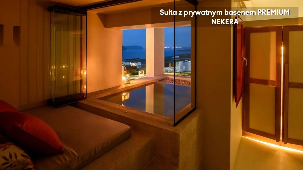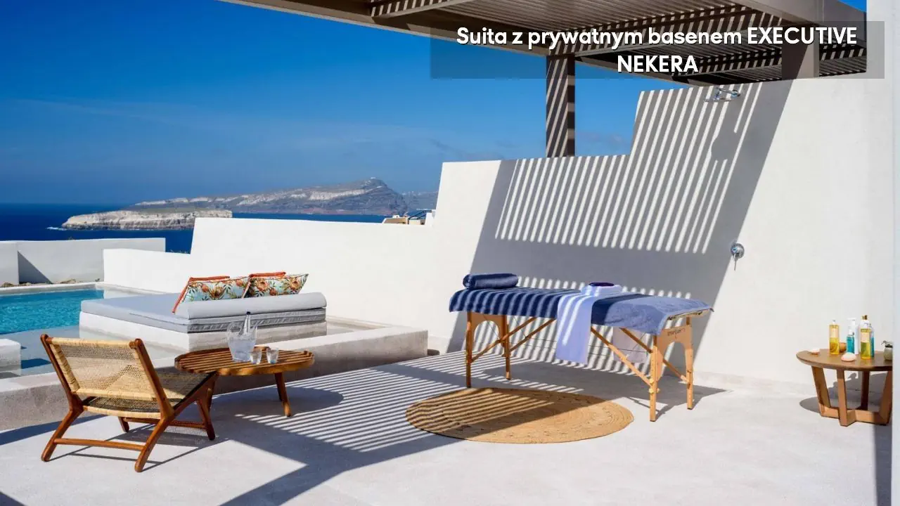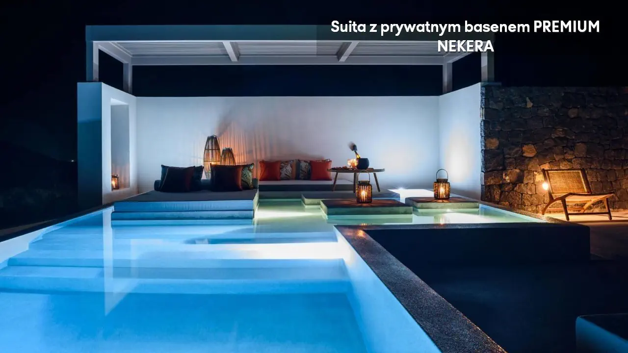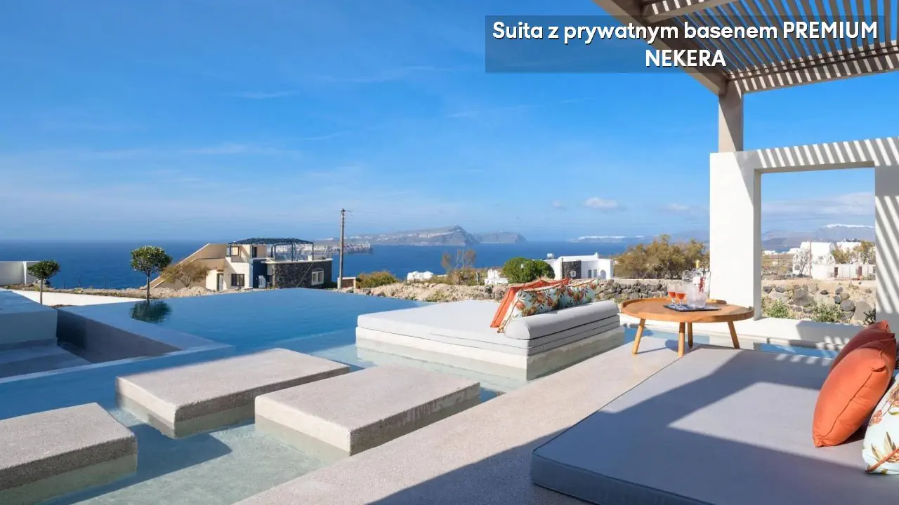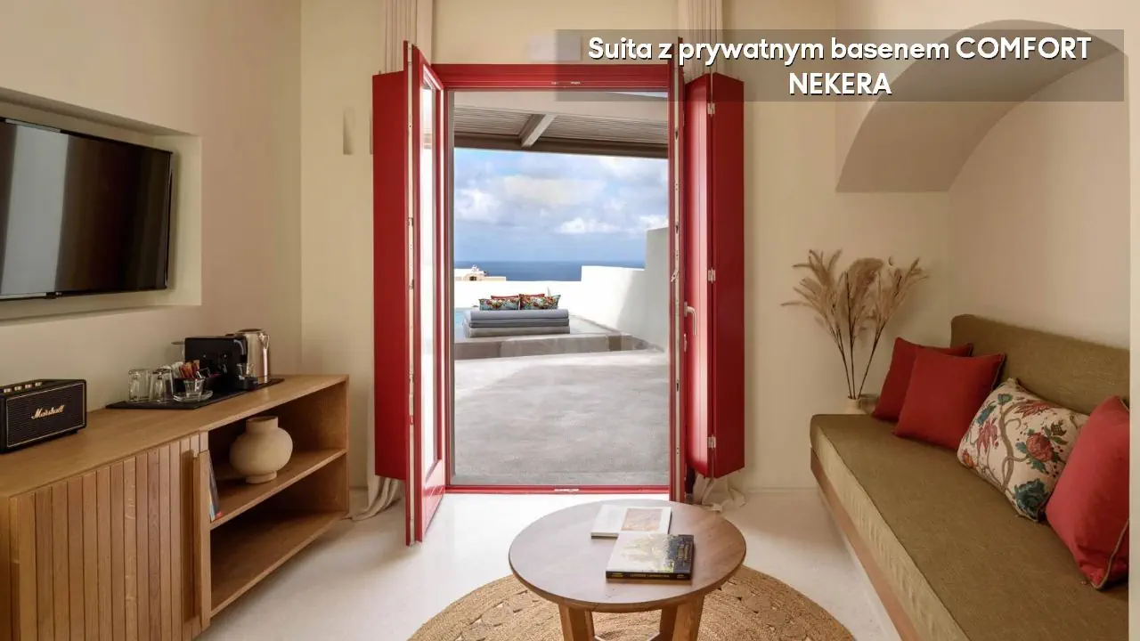 SUITA z prywatnym basenem i jacuzzi • ok. 23 m² • maks. 3 osoby dorosłe • łóżko podwójne o rozm. king-size i sofa • klimatyzacja • TV- Sat. • sejf • minilodówka • zestaw do parzenia kawy/herbaty • łazienka z prysznicem • suszarka do włosów • luksusowe minikosmetyki • ręcznik basenowy • taras z widokiem na kalderę • basen z jacuzzi na tarasie • łóżka na tradycyjnych kamiennych postumentach SUITA z jacuzzi • ok. 23 m² • maks. 3 osoby dorosłe • łóżko podwójne o rozm. king-size i sofa • jacuzzi na tarasie • poza tym wyposażony jak suita z prywatnym basenem i jacuzzi SUITA z jacuzzi i prywatnym basenem PREMIUM • ok. 40 m² • maks. 4 osoby dorosłe • 2 sypialnie i salon • pokój piętrowy • prywatny basen na tarasie • poza tym wyposażony jak suita z prywatnym basenem i jacuzzi SUITA z jacuzzi i prywatnym basenem COMFORT • ok. 26 m² • maks. 3 osoby dorosłe • sypialnia i salon • prywatny basen na tarasie • poza tym wyposażony jak suita z prywatnym basenem i jacuzzi