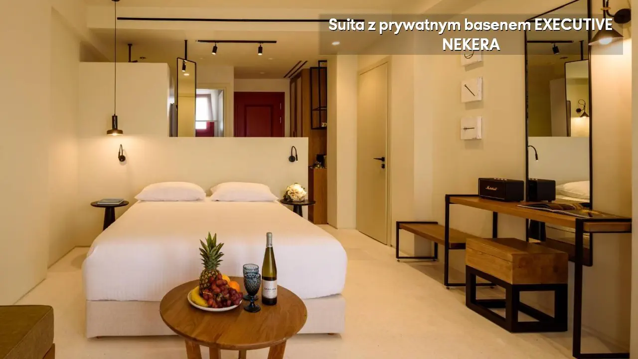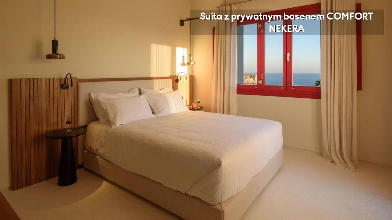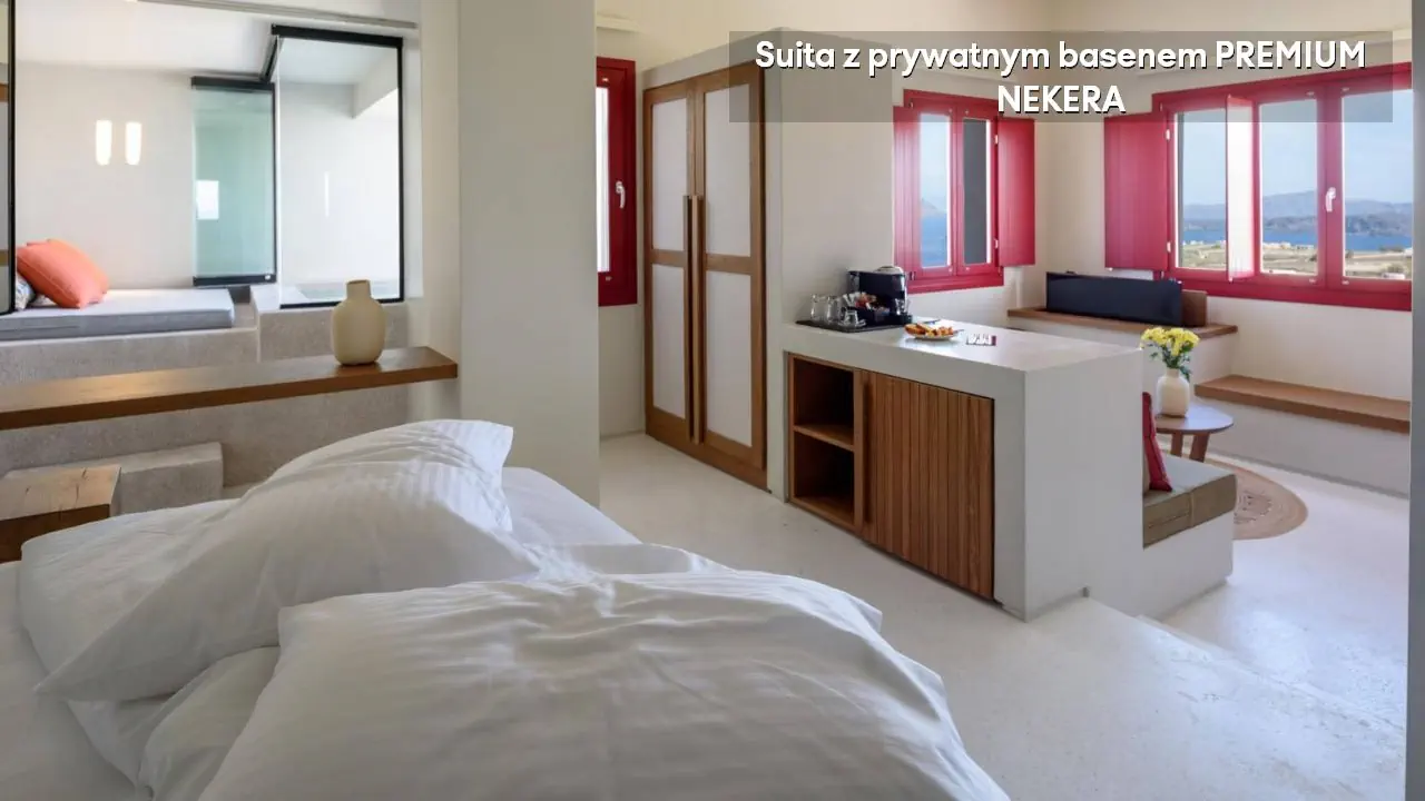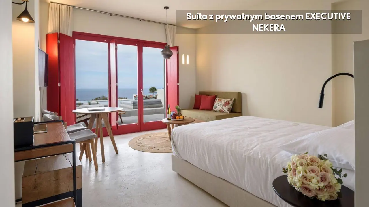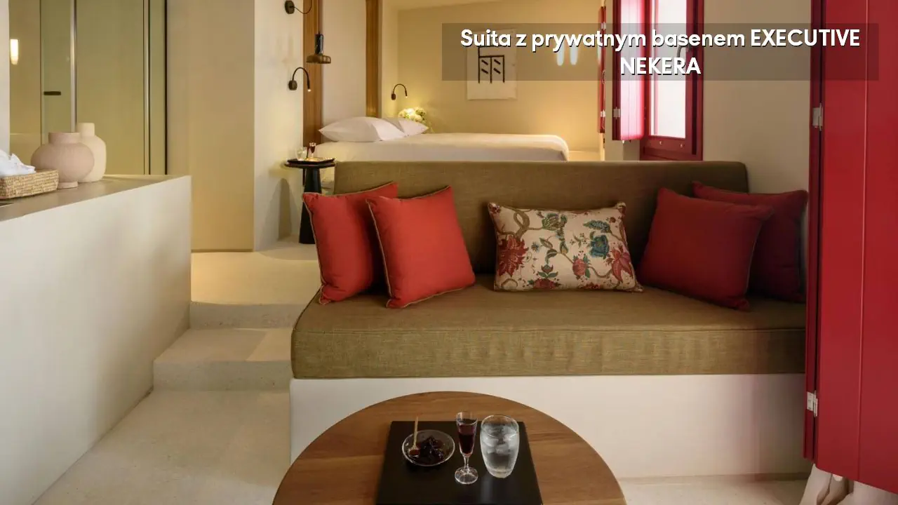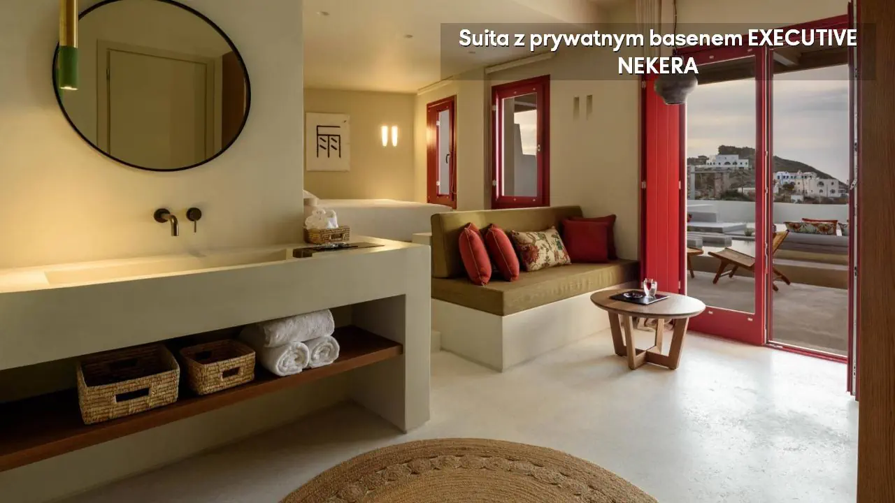 SUITA z prywatnym basenem i jacuzzi • ok. 23 m² • maks. 3 osoby dorosłe • łóżko podwójne o rozm. king-size i sofa • klimatyzacja • TV- Sat. • sejf • minilodówka • zestaw do parzenia kawy/herbaty • łazienka z prysznicem • suszarka do włosów • luksusowe minikosmetyki • ręcznik basenowy • taras z widokiem na kalderę • basen z jacuzzi na tarasie • łóżka na tradycyjnych kamiennych postumentach SUITA z jacuzzi • ok. 23 m² • maks. 3 osoby dorosłe • łóżko podwójne o rozm. king-size i sofa • jacuzzi na tarasie • poza tym wyposażony jak suita z prywatnym basenem i jacuzzi SUITA z jacuzzi i prywatnym basenem PREMIUM • ok. 40 m² • maks. 4 osoby dorosłe • 2 sypialnie i salon • pokój piętrowy • prywatny basen na tarasie • poza tym wyposażony jak suita z prywatnym basenem i jacuzzi SUITA z jacuzzi i prywatnym basenem COMFORT • ok. 26 m² • maks. 3 osoby dorosłe • sypialnia i salon • prywatny basen na tarasie • poza tym wyposażony jak suita z prywatnym basenem i jacuzzi
