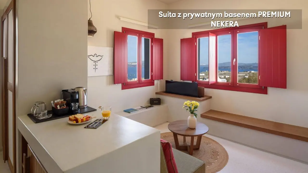 • pięciogwiazdkowy, w spokojnej okolicy • 6 suit • 1 budynek (2 piętra) • recepcja • lobby • klimatyzacja • w tradycyjnym cykladzkim stylu