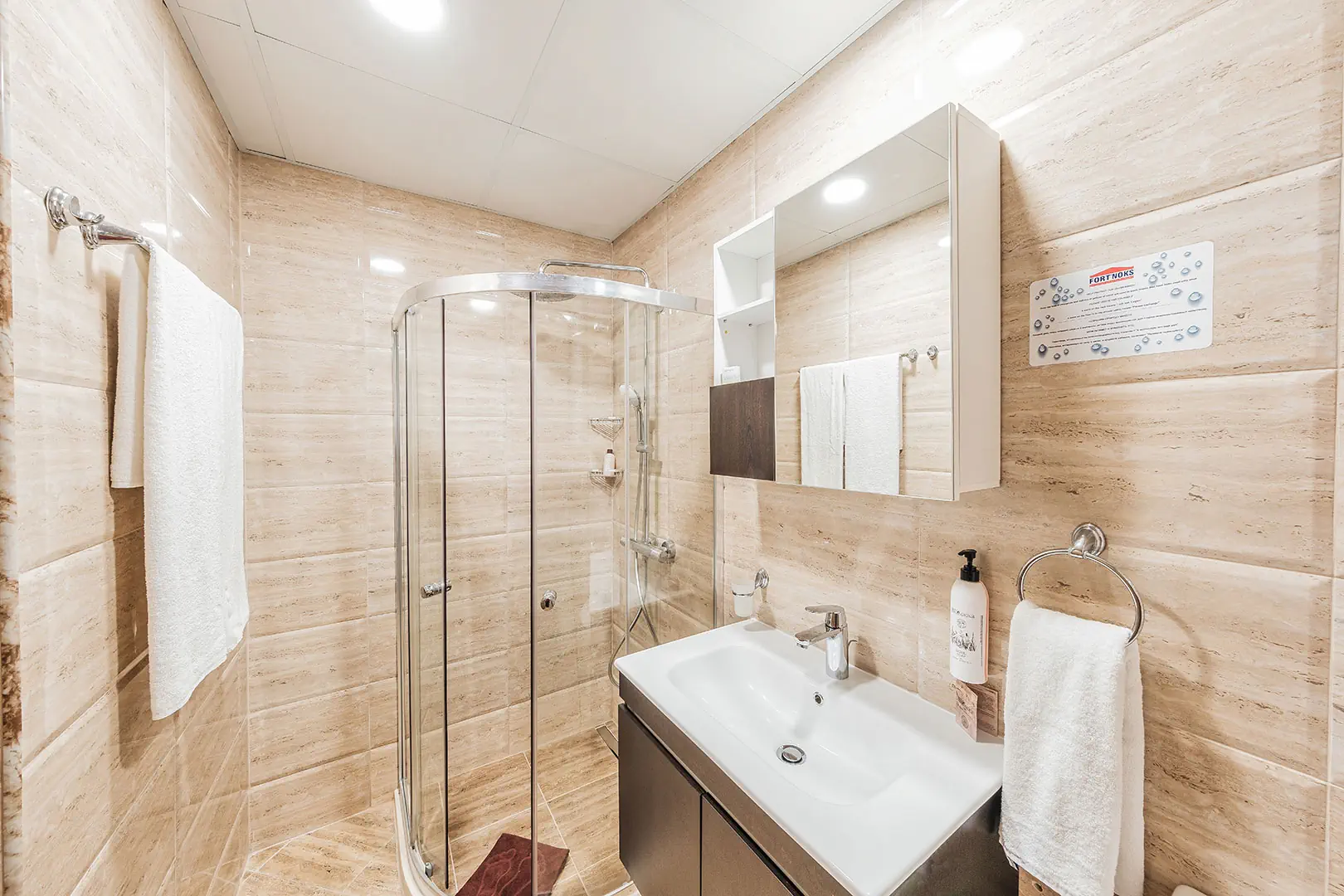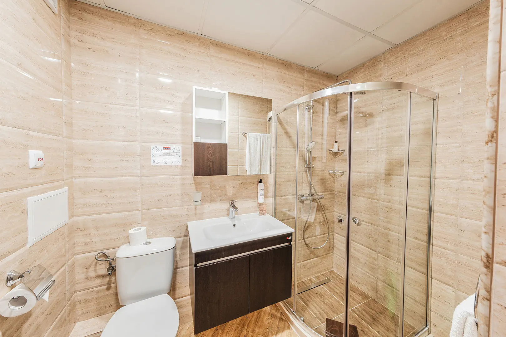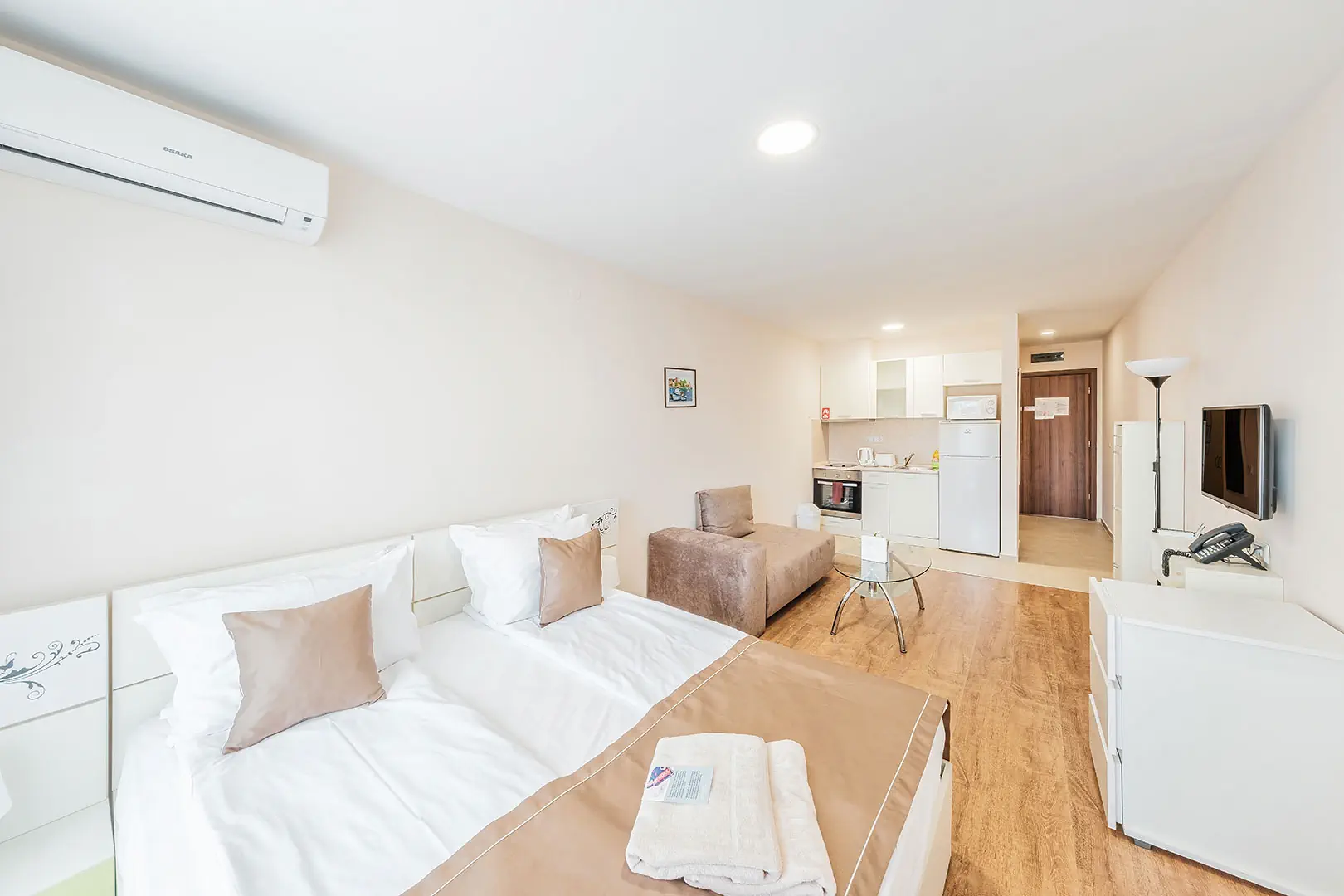 Dla max. 2 osób, Przestrzeń zewnętrzna: Balkon lub taras, prysznic, Powierzchnia pokoju: ok. 20 - 25 m2, Dostawka: sofa, Rodzaj podłogi: laminat, Sprzątanie raz na tydzień, 1 sypialnia, Maksymalna liczba osób dorosłych: 2, Maksymalna liczba dzieci: 1, Widok niesprecyzowany , Liczba łazienek: 1, Liczba toalet: 1, Klimatyzacja: Klimatyzacja indywidualna (dodatkowo płatne)