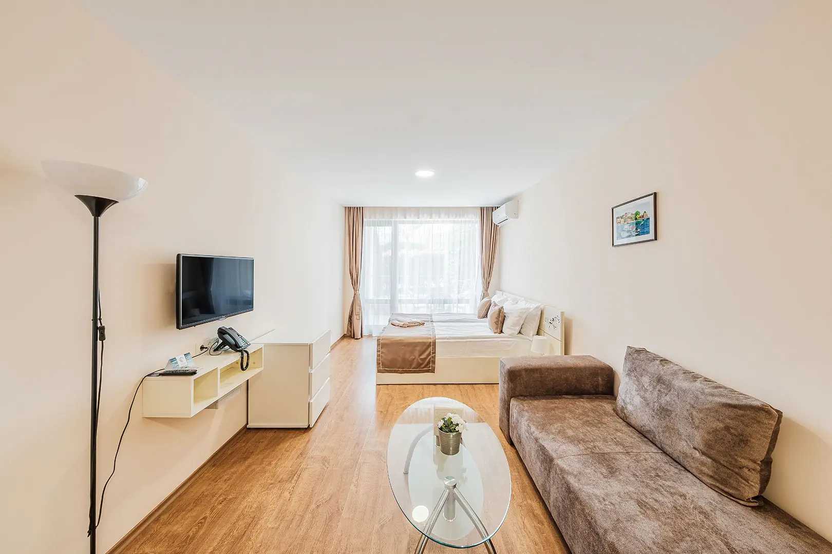 Dla max. 3 osób, Przestrzeń zewnętrzna: Balkon lub taras, prysznic, Powierzchnia pokoju: ok. 35 m2, Dostawka: sofa, Rodzaj podłogi: laminat, Sprzątanie raz na tydzień, 1 sypialnia, Maksymalna liczba osób dorosłych: 2, Maksymalna liczba dzieci: 2, Widok niesprecyzowany , Liczba łazienek: 1, Liczba toalet: 1, Klimatyzacja: Klimatyzacja indywidualna (dodatkowo płatne)