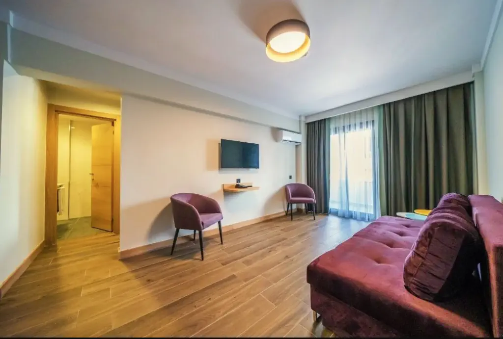 Dla max. 3 osób, Przestrzeń zewnętrzna: Balkon, Kanały telewizji: Angielski, Telefon w pokoju, prysznic, Powierzchnia pokoju: ok. 20 - 22 m2, Dostawka: sofa, Rodzaj podłogi: płytki, Sprzątanie codziennie, 1 sypialnia, Maksymalna liczba osób dorosłych: 3, Maksymalna liczba dzieci: 1, Boczny widok na morze, Liczba łazienek: 1, Liczba toalet: 1, Zestaw do parzenia kawy i herbaty, Klimatyzacja: Klimatyzacja indywidualna