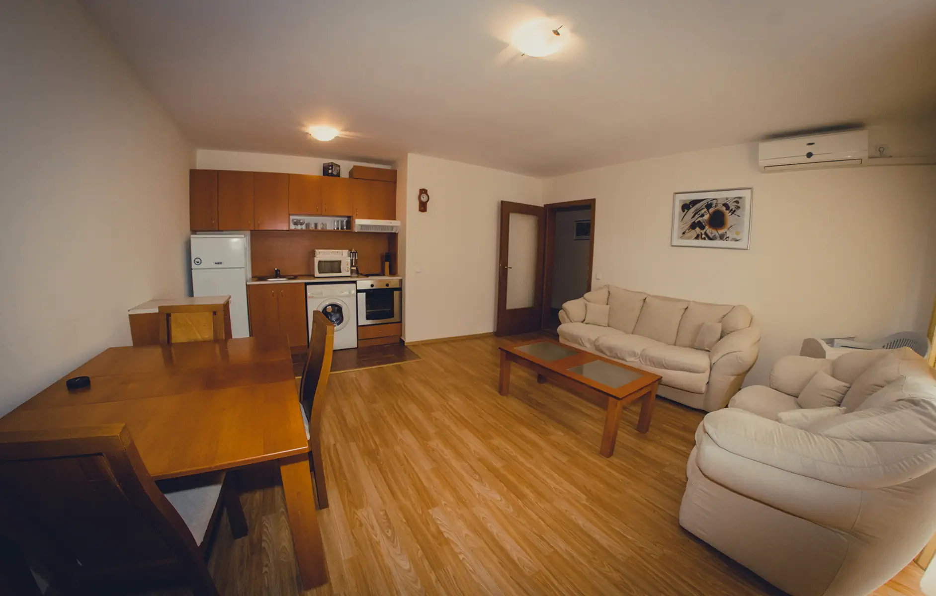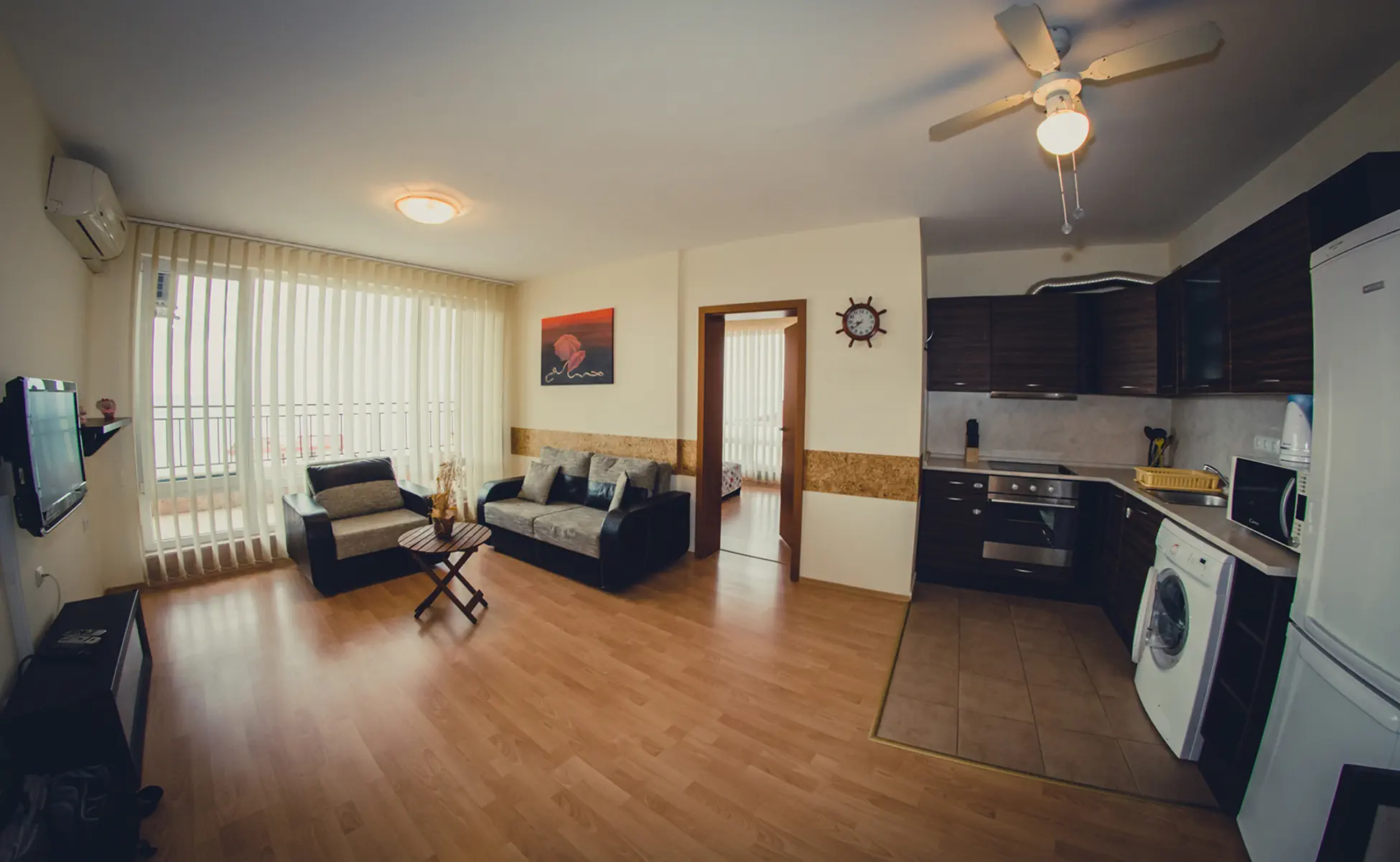 Dla max. 8 osób, Przestrzeń zewnętrzna: Balkon lub taras, Aneks kuchenny, wanna i prysznic , Powierzchnia pokoju: ok. 26 m2, Dostawka: sofa, Rodzaj podłogi: laminat, Sprzątanie codziennie, 1 sypialnia, Maksymalna liczba osób dorosłych: 6, Maksymalna liczba dzieci: 6, Widok niesprecyzowany , Liczba łazienek: 1, Liczba toalet: 1, Klimatyzacja: Klimatyzacja indywidualna