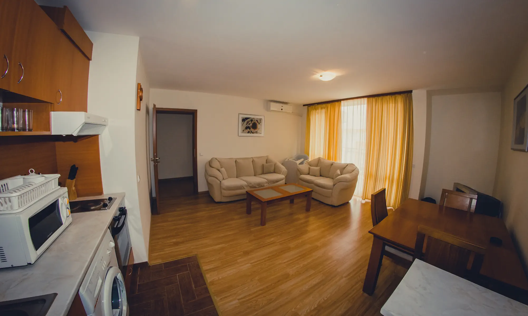 Dla max. 6 osób, Przestrzeń zewnętrzna: Balkon lub taras, Aneks kuchenny, wanna i prysznic , Powierzchnia pokoju: ok. 23 m2, Dostawka: sofa, Rodzaj podłogi: laminat, Sprzątanie codziennie, 1 sypialnia, Maksymalna liczba osób dorosłych: 4, Maksymalna liczba dzieci: 2, Widok niesprecyzowany , Liczba łazienek: 1, Liczba toalet: 1, Klimatyzacja: Klimatyzacja indywidualna
