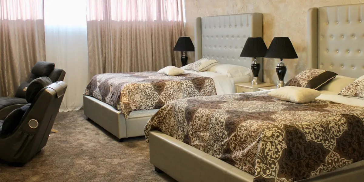 Komfortowy, klimatyzowany, wyciszony pokój z dwoma małżeńskimi łóżkami