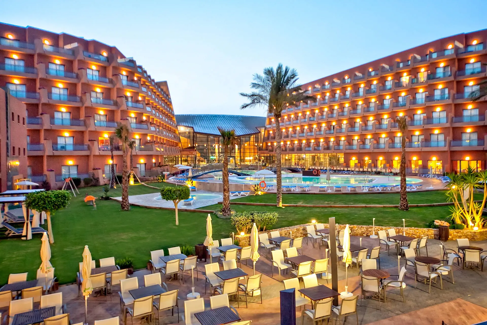 Położenie Nowoczesny i świetnie utrzymany hotel, położony w samym centrum turystycznym kurortu. W pobliżu szeroki wybór barów, restauracji i sklepów. Do lotniska w Maladze ok. 190 km. Do lotniska w Almerii ok. 35 km. Plaża Obiekt usytuowany przy piaszczysto-żwirowej plaży (przejście przez niewielką promenadę). Leżaki i parasole na plaży - płatne (ok. 5 EUR/os.). Do dyspozycji gości Recepcja, lobby, windy, restauracja główna (posiadająca taras z pięknym widokiem na morze), 2 restauracje a’la carte, jedna z nich specjalizująca się w rybach - La Sal i druga - La Brasserie - w daniach mięsnych, lounge bar, bar przy basenie. Duży ogród wokół basenu z leżakami i parasolami, ogromny basen otoczony sztuczną rzeką - prawdziwa frajda dla dzieci, brodzik dla dzieci, mini klub, plac zabaw, pralnia (dodatkowo płatna), wymiana walut, przechowalnia bagażu, sale konferencyjne, wypożyczalnia samochodów. Hotel zapewnia ręczniki basenowe (możliwy depozyt). Pokoje Hotel posiada 294 przestronne, komfortowe i elegancko urządzone pokoje z łazienką (suszarka do włosów na wyposażeniu), telefonem, TV-sat, klimatyzacją, balkonem (meble balkonowe), lodówką (minibar - alkohole płatne, napoje bezalkoholowe oraz woda - gratis) oraz sejfem (dodatkowo płatny). W każdym pokoju najczęściej 2 łóżka (1,05 cm x 200 cm każde) lub 1 duże łóżko małżeńskie + pojedyncze łóżko rozkładane dla dziecka. Możliwość zakwaterowania 2 osób dorosłych i 2 dzieci w pokojach typu familiar, ale proszę pamiętać, że w pokoju będą tylko 2 łóżka małżeńskie. Łóżeczko dla dziecka - gratis (ilość ograniczona). Wyżywienie All Inclusive: śniadania (08:00-10:30), śniadania kontynentalne (10:30-12:00), obiady (13:00-15:00) i obiadokolacje (19:00-22:00); przekąski w miejscach wyznaczonych przez hotel (11:00-17:00), lokalne napoje alkoholowe i bezalkoholowe (11:00 - 24:00), podwieczorek: ciastka, herbata (16:00-18:30), nocny snack bar (23:00 - 24:00). Program sportowy i animacyjny Bogaty program animacyjny dzienny i wieczorny, zarówno dla dzieci jak i dorosłych. Bezpłatne: boisko multisportowe, paddle, siłownia, basen kryty z hydromasażem. Płatne hotelowe Spa: jacuzzi, prysznice aromatyczne, łaźnia turecka, masaże, zabiegi kosmetyczne na twarz i ciało. Internet Stanowiska internetowe - płatne, internet Wi-Fi w recepcji - gratis, w pokojach - płatny. Kategoria lokalna ***** Naszym zdaniem To 5-gwiazdkowy, elegancki oraz ekskluzywny hotel ze wspaniałą lokalizacją tuż przy szerokiej plaży. Protur należy do najlepszych hoteli na wybrzeżu Almerii. Polecamy zarówno dla rodzin z dziećmi, jak i dla par. Strona www www.protur-hotels.com