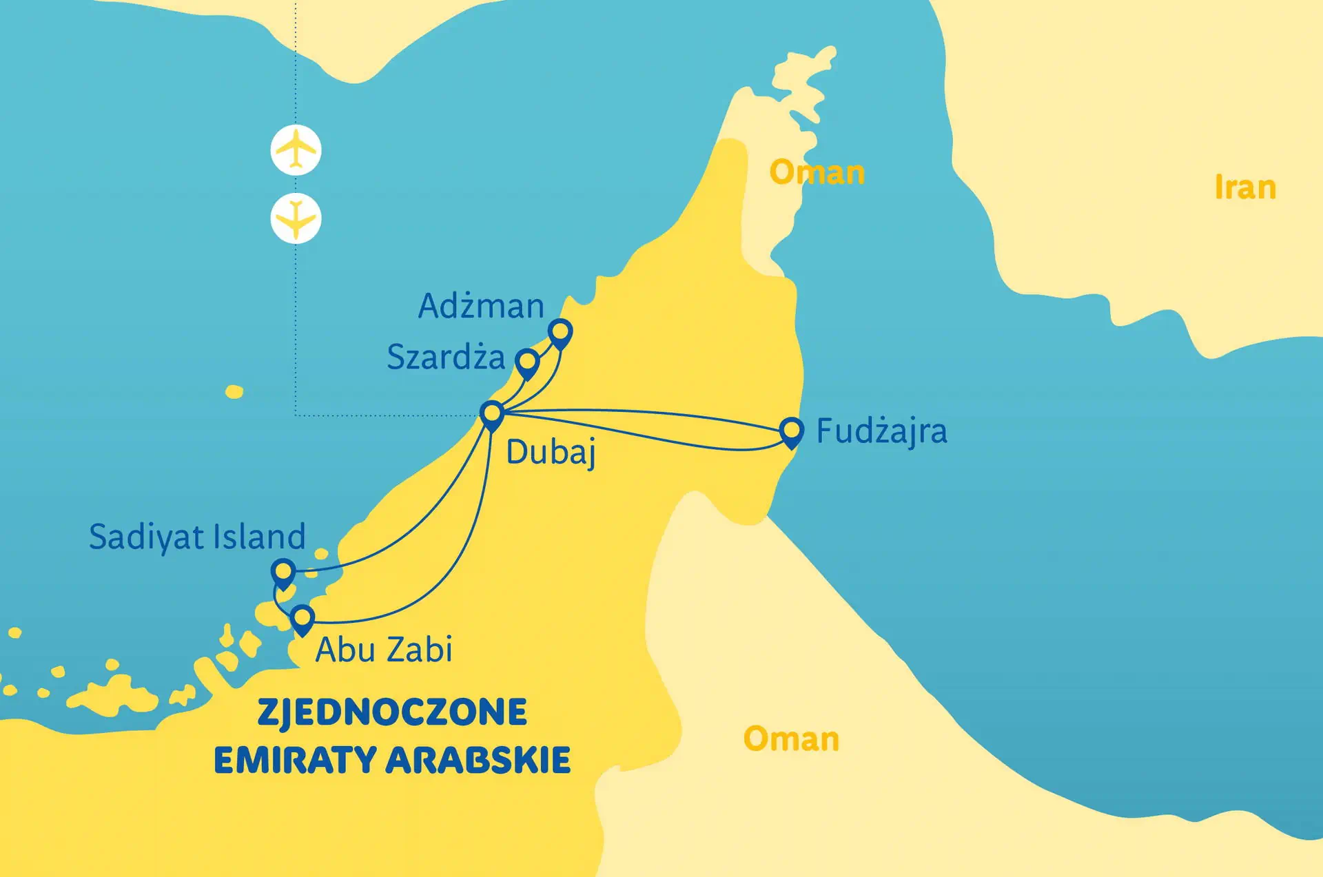 Zakwaterowanie Hotele wysokiej klasy o standardzie odpowiadającym ****/ ***** w ocenie organizatora (razem 7 rozpoczętych dób hotelowych). Do dyspozycji gości na terenie hotelu: restauracja, bar, recepcja, sejf. W większości hoteli basen. Wyżywienie: Śniadania oraz za dopłatą obiadokolacje (we wskazanych dniach, zazwyczaj w restauracjach hotelowych); napoje do kolacji dodatkowo płatne. Hotel w Dubaju - hotel sieci Novotel 4* (lub podobny) Hotel w rejonie Fujairah - Mirage Bab Al Bahr Beach Hotel 5* (lub podobny) Uwaga:wyżej wymienione hotele są przykładowe i istnieje możliwość wymiany ich na inne hotele o podobnym standardzie.