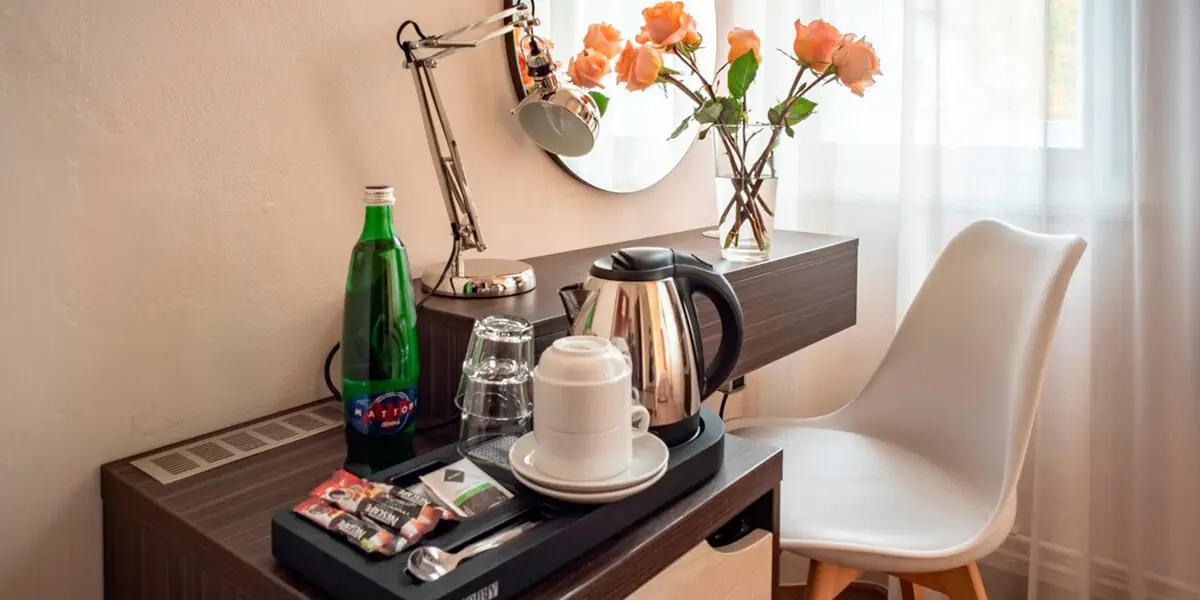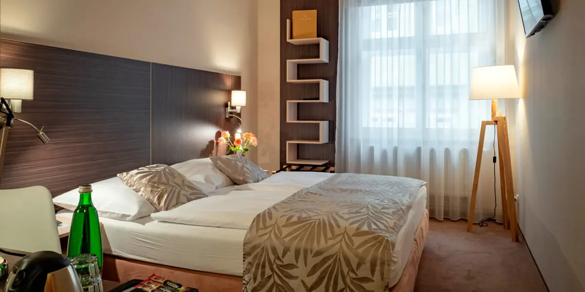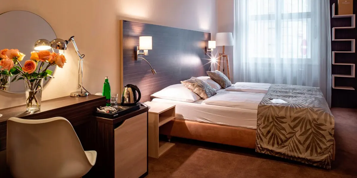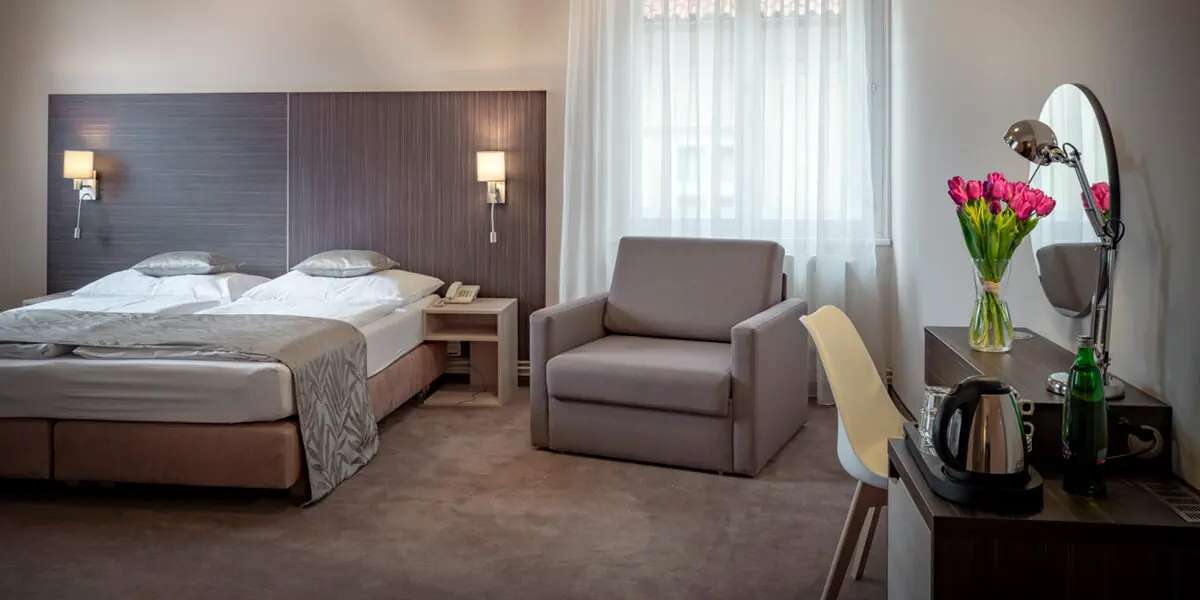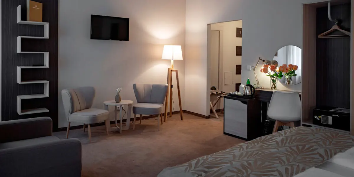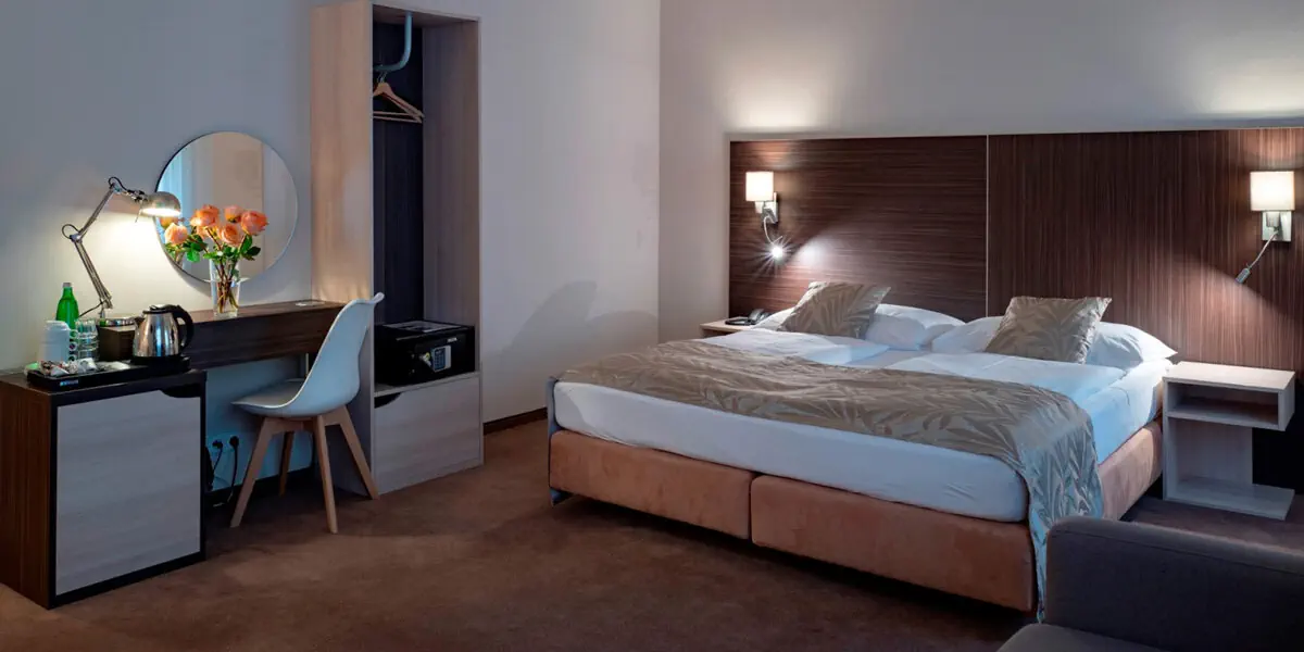 Wygodny pokój wyposażony w łazienkę z prysznicem lub wanną, suszarkę do włosów, kapcie, wysokiej jakości kosmetyki, TV SAT, telefon, sejf, koce i poduszki antyalergiczne, zestaw do kawy i herbaty oraz czajnik, minibar (za opłatą), biurko i krzesło, bezpłatne łącze Wi-Fi.