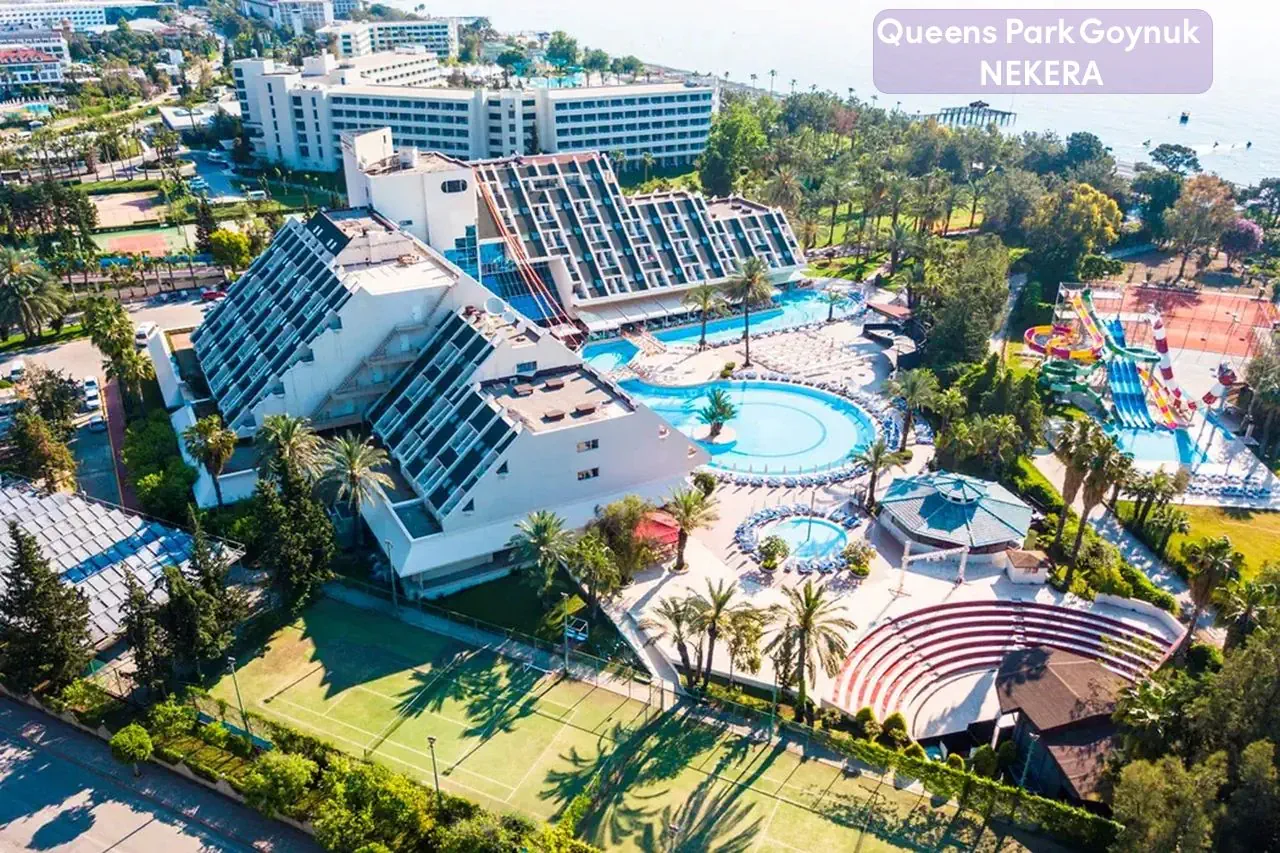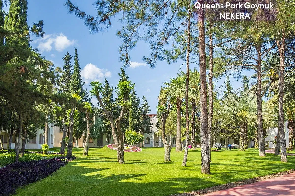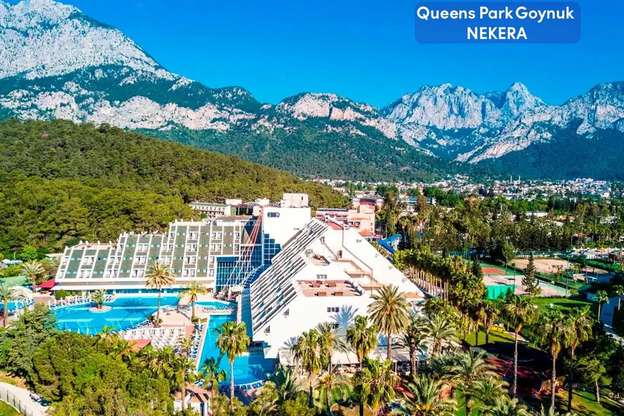Queen’s Park Goynuk (Queen’s Park Resort Göynük) to luksusowy, pięciogwiazdkowy hotel  All Inclusive położony w turystycznym regionie  (Kemer) nad Morzem Śródziemnym. Obiekt łączy komfortowe zakwaterowanie z prywatną plażą, aquaparkiem, rozbudowaną infrastrukturą rekreacyjną oraz bogatą ofertą gastronomiczną – to świetna propozycja zarówno dla rodzin z dziećmi, par, jak i gości aktywnie wypoczywających.