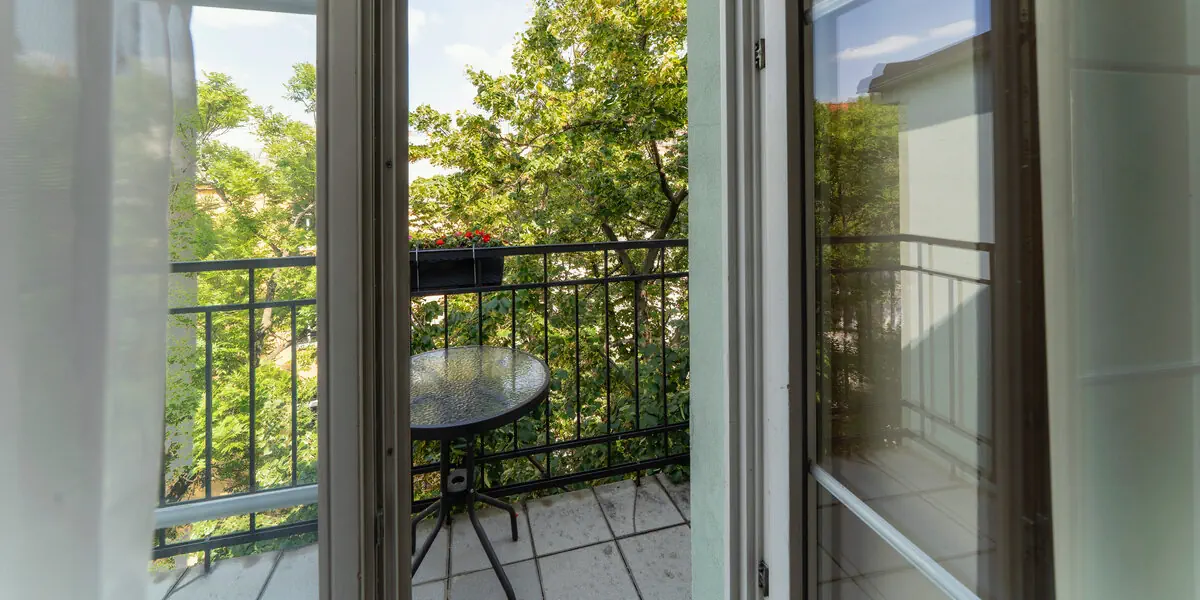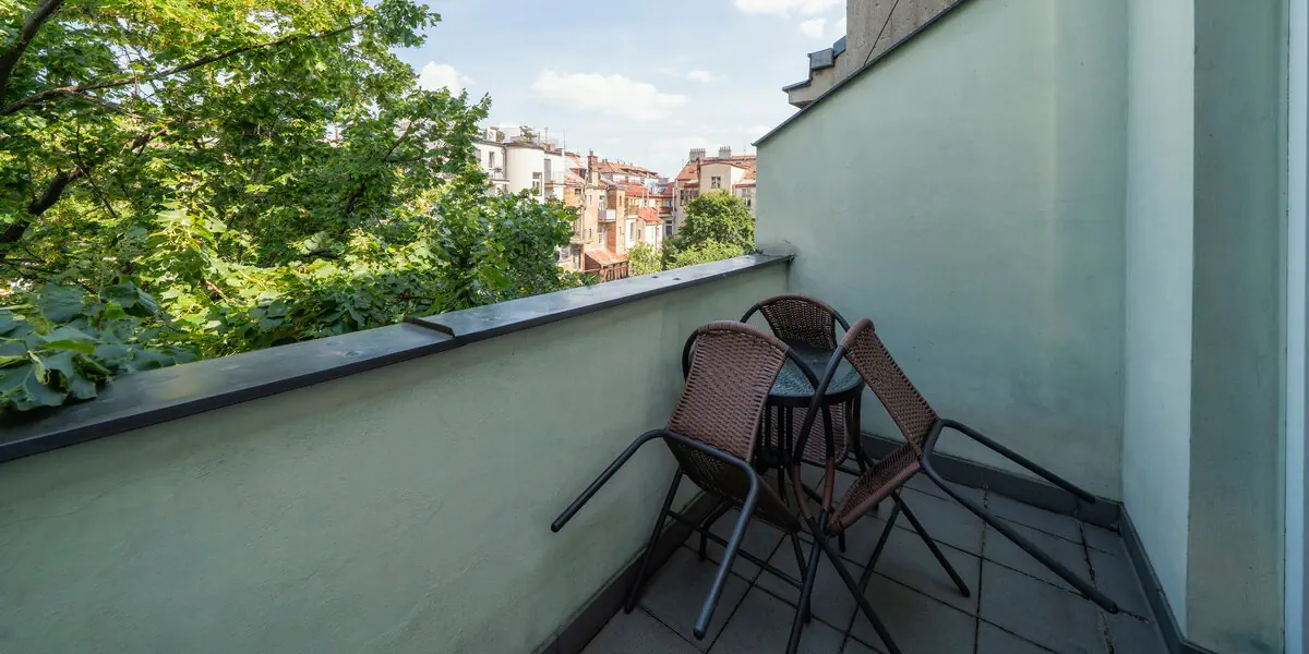 Studio z balkonem składające się z dwóch pomieszczeń: sypialni z podwójnym łóżkiem oraz drugiego pokoju z łóżkiem pojedynczym oraz częścią wypoczynkową z kanapą