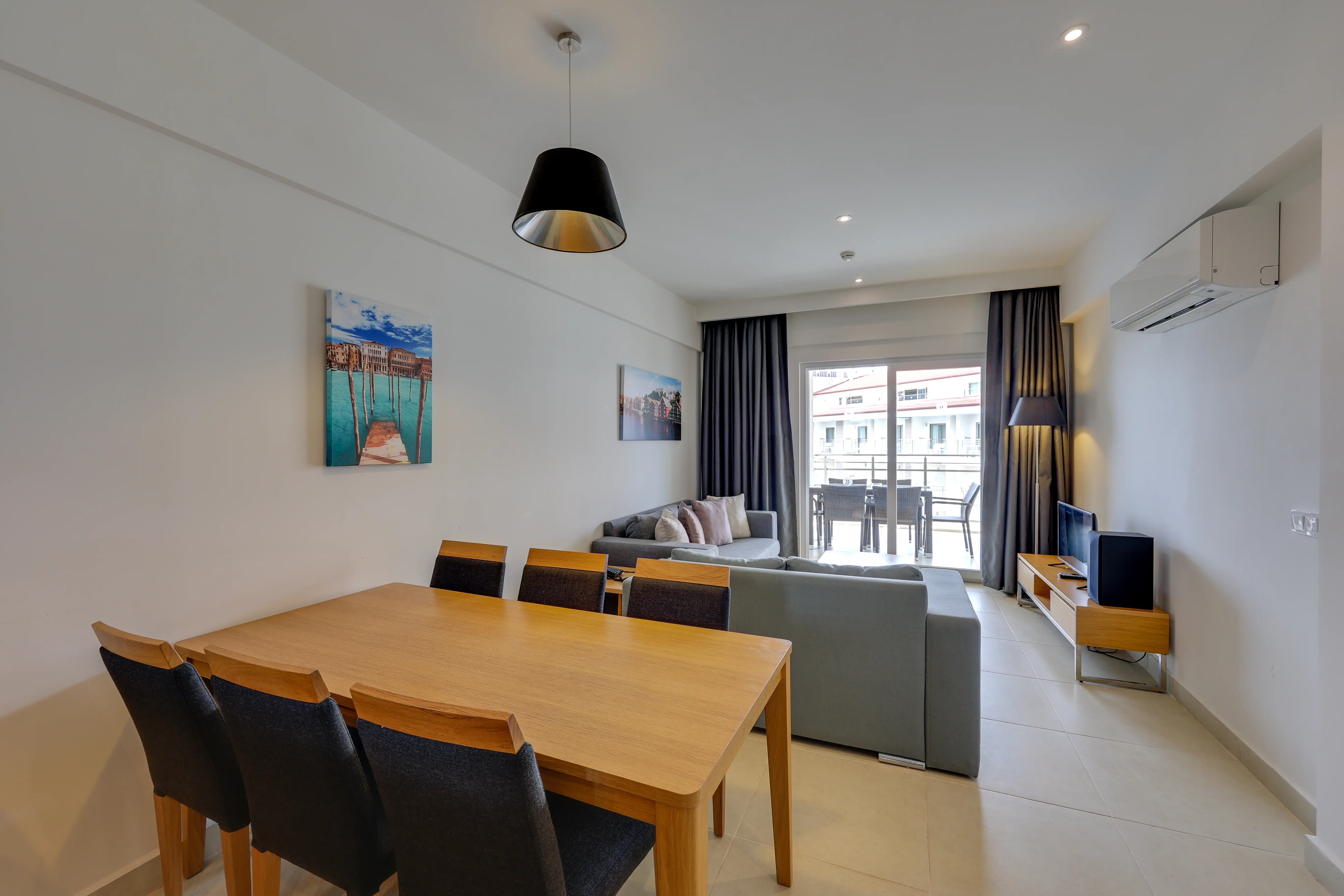 Dla max. 5 osób, Przestrzeń zewnętrzna: Balkon, Kanały telewizji: Polski, Angielski, Telefon w pokoju, prysznic, Powierzchnia pokoju: ok. 71 m2, Rodzaj podłogi: płytki, Sprzątanie cykliczne, Salon, 2 sypialnie, Drzwi łączące między pokojami, Maksymalna liczba osób dorosłych: 5, Maksymalna liczba dzieci: 3, Widok na basen i morze, Liczba łazienek: 2, Liczba toalet: 2, Zestaw do parzenia kawy i herbaty, Klimatyzacja: Klimatyzacja indywidualna