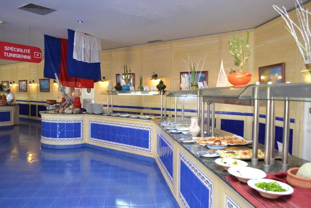 Śniadanie (07:00 - 10:00) - Main Restaurant - La Voile, stół szwedzki, Późne śniadanie (10:00 - 11:00) - Main Restaurant - La Voile, stół szwedzki, Obiad (12:30 - 14:30) - Main Restaurant - La Voile, stół szwedzki, Przekąski (16:00 - 17:00) - Main Bar - Le Brigantin, stół szwedzki, Kolacja (19:00 - 21:00) - Main Restaurant - La Voile, stół szwedzki, A La Carte Restaurant - L Olivier (19:00 - 22:00) (19:00 - 22:00), raz podczas pobytu, Kuchnia: Tunezyjska, śródziemnomorska, Wymagana rezerwacja: Tak, Main Bar - Le Brigantin (08:00 - 00:00), Napoje: alkohole lokalne, napoje bezalkoholowe (08:00 - 00:00), Pool Bar - Le Grand Large (10:00 - 18:00), Napoje: alkohole lokalne, napoje bezalkoholowe (10:00 - 18:00), Moorish Cafe - La Darbouka (15:00 - 00:00), Napoje: napoje bezalkoholowe (15:00 - 00:00), Lounge Bar - Le Grafit (21:00 - 02:00), Napoje: alkohole lokalne, wybrane alkohole importowane, napoje bezalkoholowe (21:00 - 02:00), napoje bezalkoholowe, alkohole lokalne, wybrane alkohole importowane ¹⁾, pakiety dla nowożeńców ¹⁾, pakiety urodzinowe (na życzenie) ¹⁾, cukiernia, room service ¹⁾ ¹⁾ - dodatkowo płatne