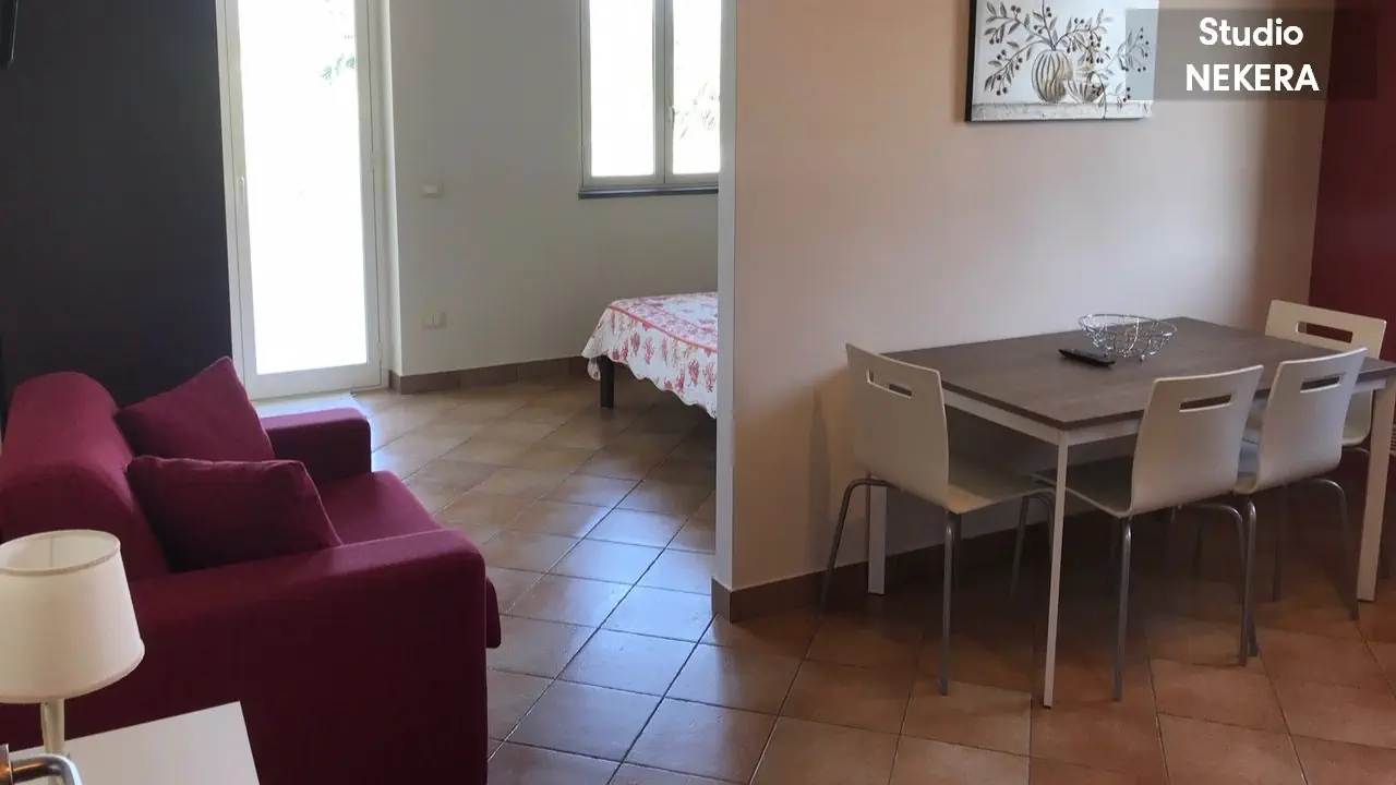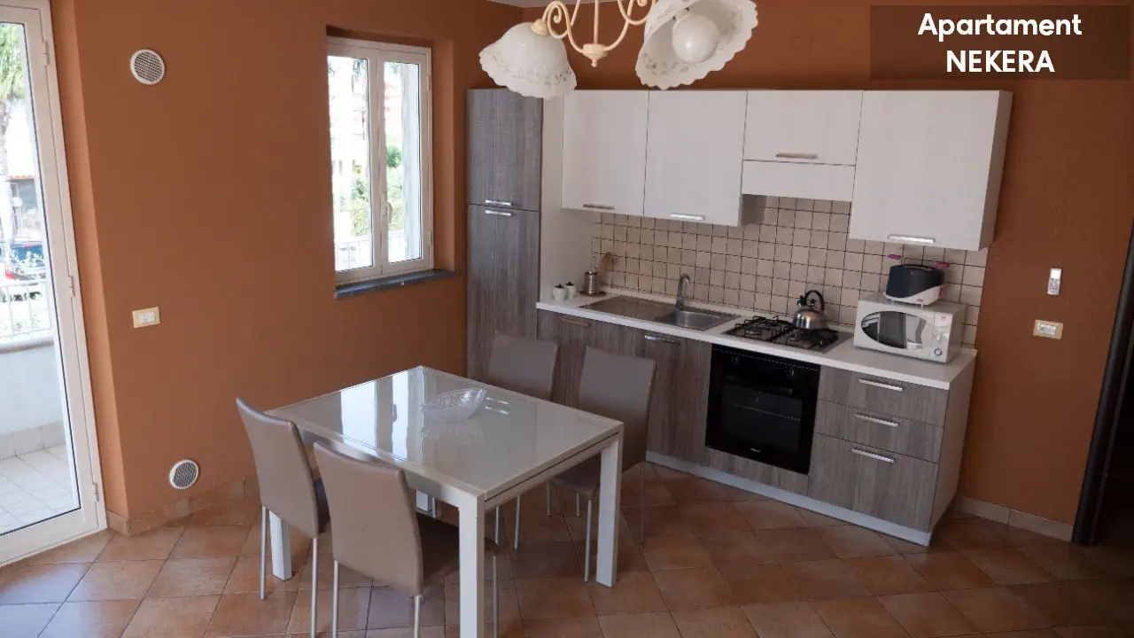 Studio dla max 2–3 osób, część dzienna z aneksem kuchennym i rozkładaną sofą, część sypialna z łóżkiem małżeńskim, w pełni wyposażony aneks kuchenny (płyta grzewcza, piekarnik, lodówka, podstawowe naczynia i zastawa), klimatyzacja, TV z płaskim ekranem, szafa/garderoba, stół z krzesłami, prywatna łazienka (prysznic, WC, bidet, suszarka do włosów), umeblowany balkon lub taras. Apartament z 1 sypialnią, apartament dwupokojowy, dla max 4 osób dorosłych. Składa się z pokoju dziennego z aneksem kuchennym (płyta grzewcza, piekarnik, lodówka, podstawowe naczynia i zastawa), stołem jadalnym i rozkładaną sofą (może pełnić funkcję dostawki), oddzielnej sypialni z łóżkiem małżeńskim, prywatnej łazienki (prysznic, WC, bidet, suszarka do włosów). Wyposażenie: klimatyzacja, TV z płaskim ekranem, szafa/garderoba, kącik jadalny, balkon, taras lub mały ogródek z miejscem do siedzenia (stolik, krzesła).