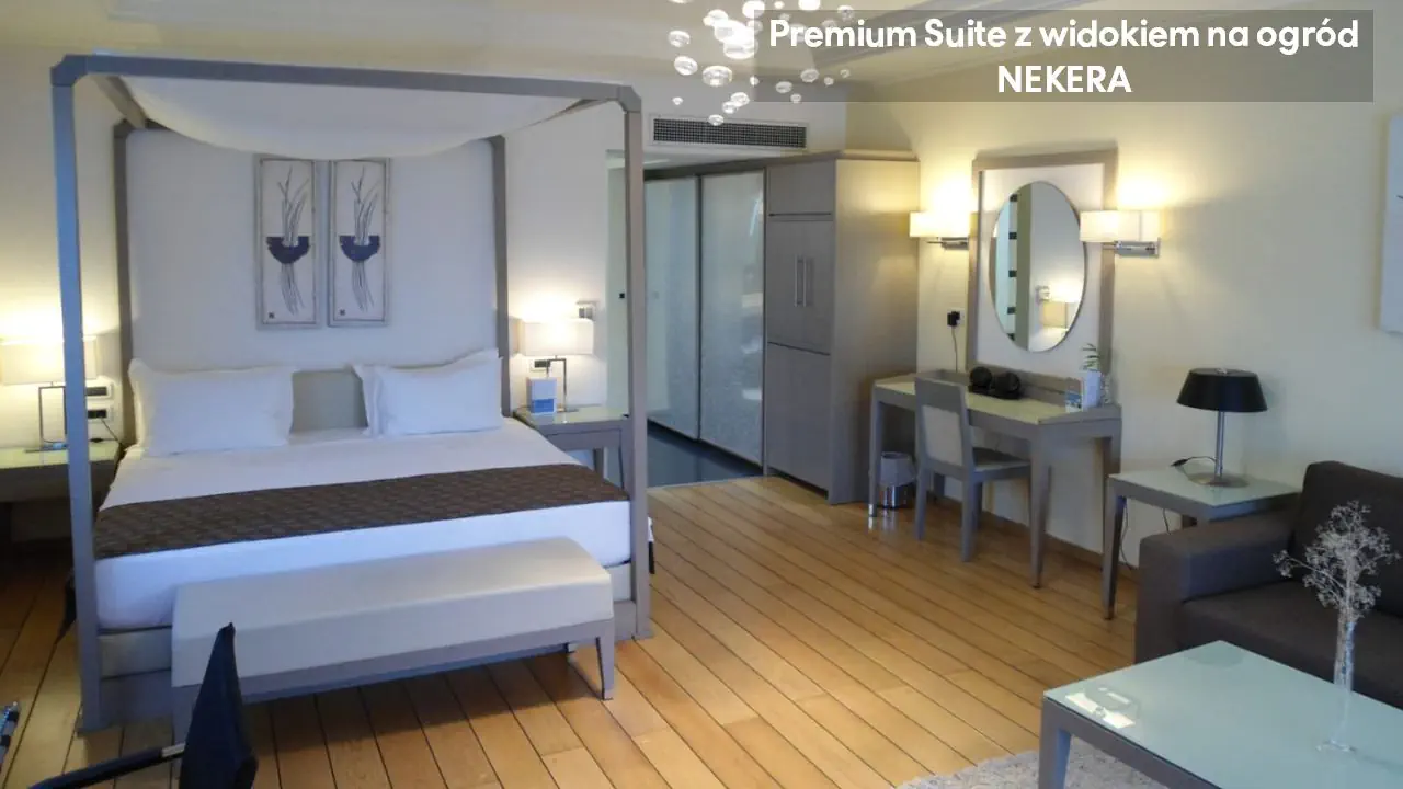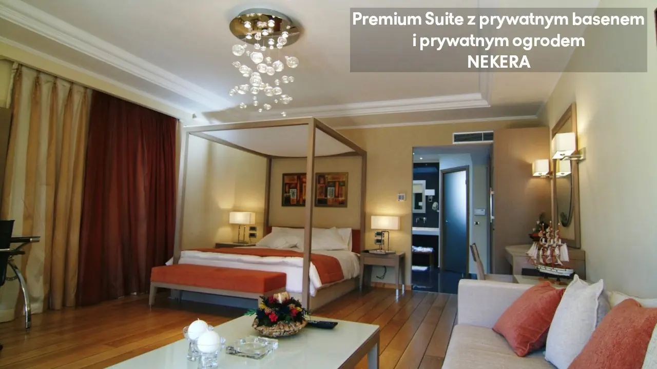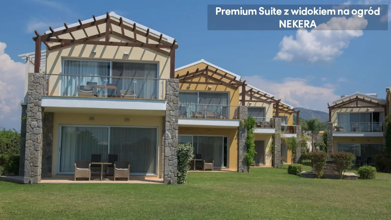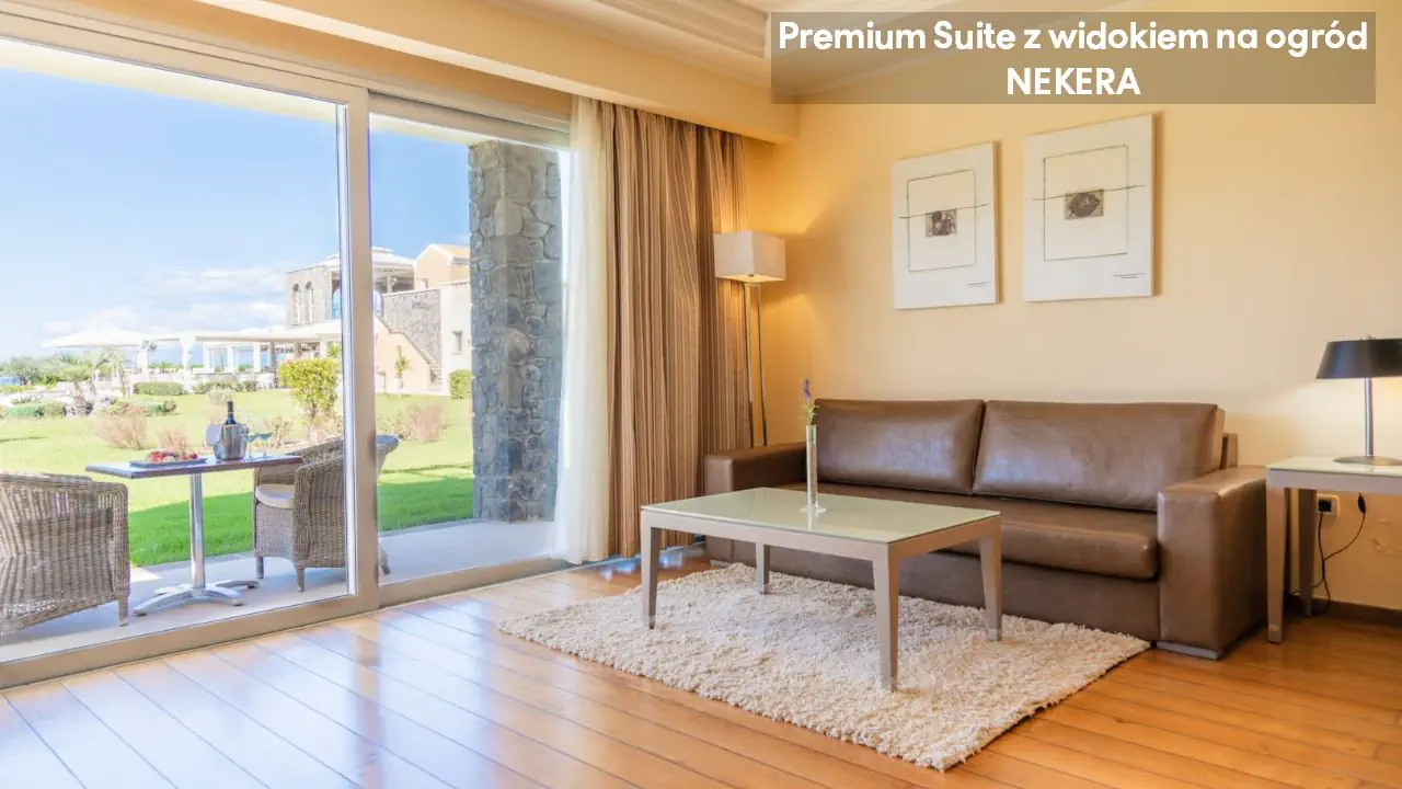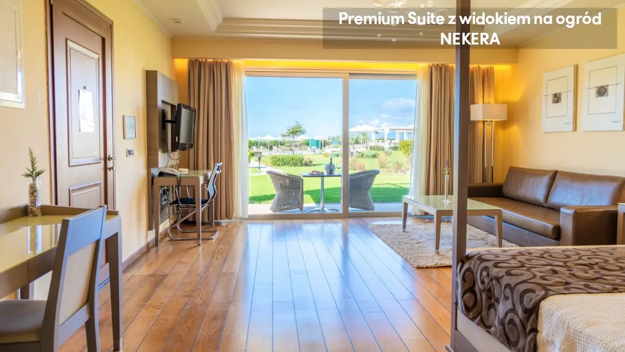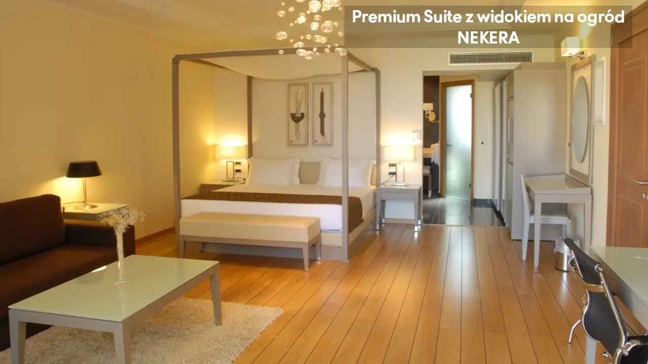 Suite Premium z widokiem na ogród - max 3-os - jedno łóżko podwójne lub dwa pojedyncze, sofa jako dostawka - klimatyzacja - sejf - bezpłatne Wi-Fi - suszarka do włosów - telewizor z płaskim ekranem - lodówka - łazienka z wanną lub prysznicem - mini kosmetyki - balkon lub taras - za dodatkową opłatą możliwość rezerwacji pokoju z prywatnym dostępem do basenu Suite Premium z widokiem na morze - ok. 52 m² - max 3-os - jedno łóżko podwójne lub dwa pojedyncze, sofa jako dostawka - klimatyzacja - sejf - bezpłatne Wi-Fi - suszarka do włosów - telewizor z płaskim ekranem - lodówka - łazienka z prysznicem lub wanną, jacuzzi - mini kosmetyki, kapcie, szlafrok - balkon lub taras