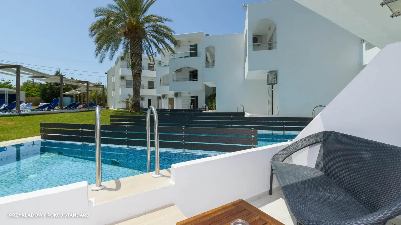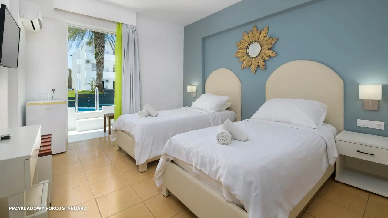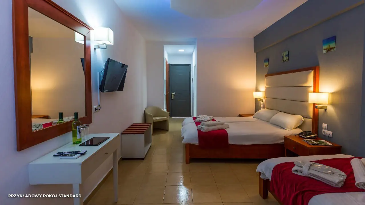 Standard• 2 os. (ok. 18-20 m2)• w pełni odnowiony na 2021• klimatyzacja indywidualna (bezpłatnie)• Wi-Fi (bezpłatne)• TV-SAT, telefon• sejf (płatny)• lodówka• łazienka- prysznic, suszarka• balkon lub taras• prywatny basen za dopłatąSuperior• 2-3 os. (ok. 25 m2)• dostawka dla 3. os (wliczając dzieci do 2 lat)• w pełni odnowiony na 2021• zestaw do kawy i herbaty (w pokojach z basenem)• tablet 10' (depozyt, w pokojach z basenem)• wyposażony jak pokój standard• prywatny basen za dopłatąRodzinne• 2-4 os. (ok. 35 m2)• dostawka dla 3. i 4 os (wliczając dzieci do 2 lat)• maksymalne obłożenie 3+1• 2 osobne pomieszczenia• w pełni odnowione na 2021• wyposażony jak pokój standard• w pokoju rodzinnym dla 3 osób jest optyczne wydzielenie pomieszczenia na 2 części (od sezonu 2024)