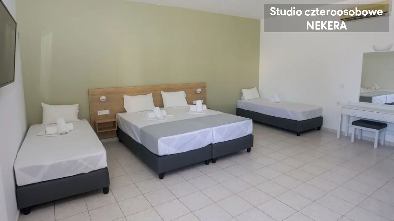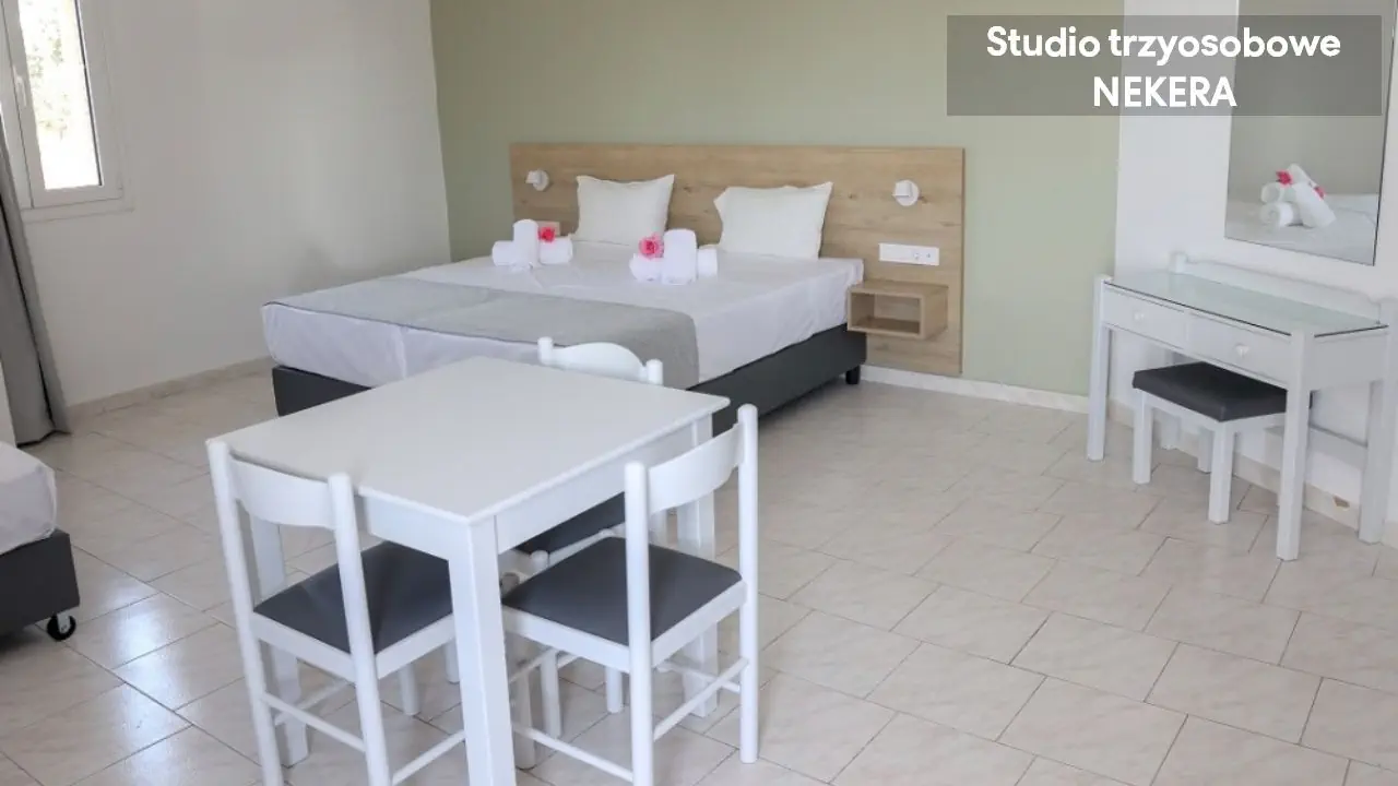 Pokoje typu studio STUDIO ROOM: dla max. 3 os.; prywatna łazienka (prysznic, WC), klimatyzacja (płatna), lodówka, wyposażony aneks kuchenny; balkon lub taras. Pokoje typu Apartament z 1 sypialnią 1-BEDROOM APARTAMENT: dla max. 4 os.; pokój dzienny + sypialnia; prywatna łazienka (prysznic, WC), klimatyzacja indywidualna (płatna); telewizja satelitarna; balkon lub taras.