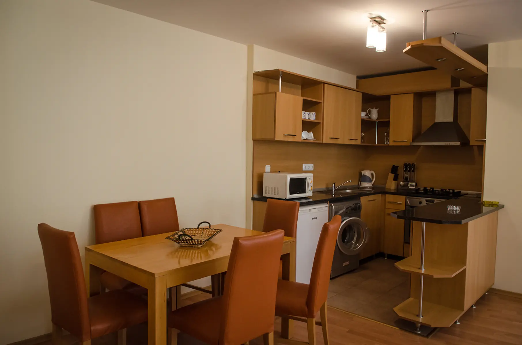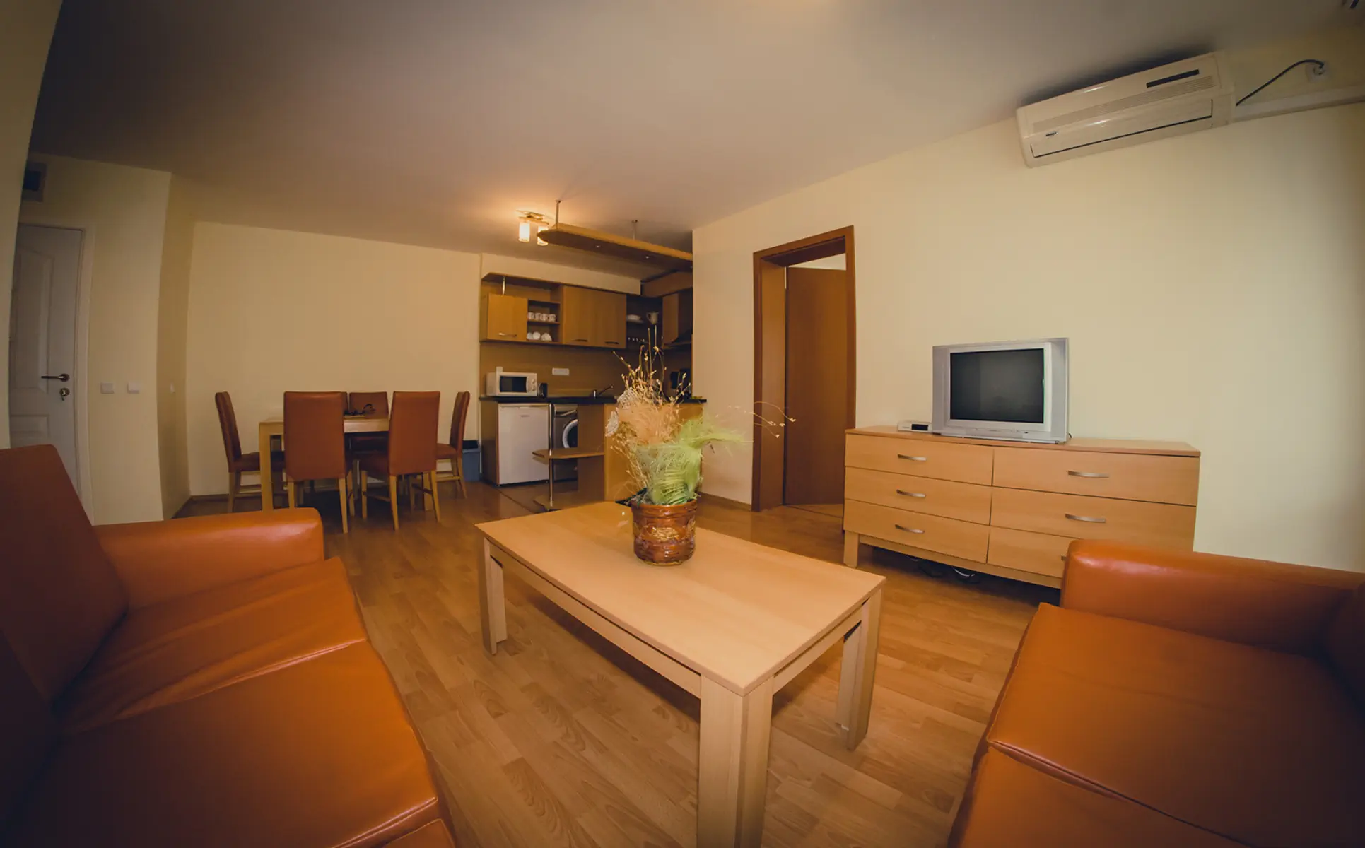 Dla max. 4 osób, Przestrzeń zewnętrzna: Balkon lub taras, Kanały telewizji: Angielski, Aneks kuchenny, wanna i prysznic , Powierzchnia pokoju: ok. 18 m2, Dostawka: sofa, Rodzaj podłogi: laminat, Sprzątanie raz na tydzień, Salon, 1 sypialnia, Maksymalna liczba osób dorosłych: 2, Maksymalna liczba dzieci: 2, Pralka, Widok niesprecyzowany , Liczba łazienek: 1, Liczba toalet: 1, Kuchenka mikrofalowa, Zestaw do parzenia kawy i herbaty, Klimatyzacja: Klimatyzacja indywidualna