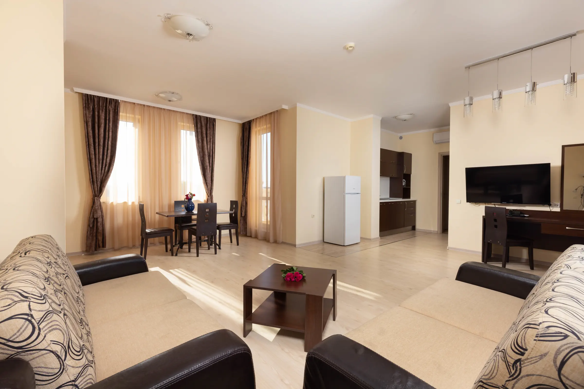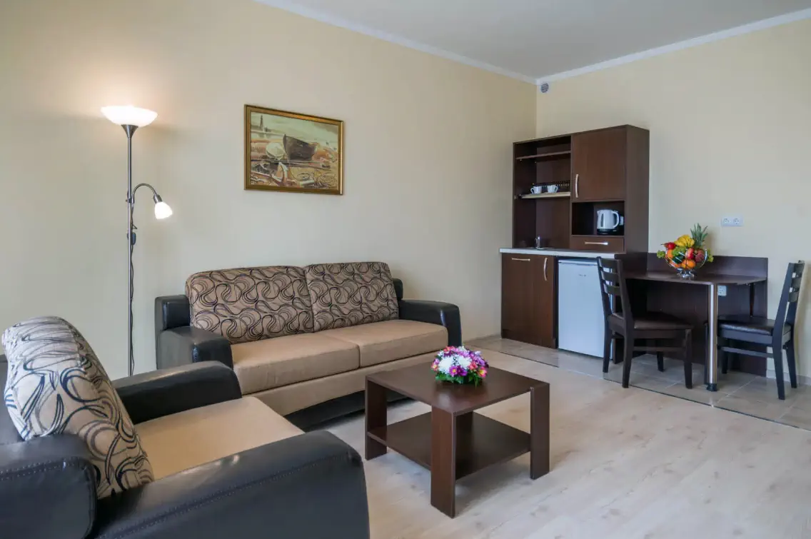 Dla max. 6 osób, Przestrzeń zewnętrzna: Balkon lub taras, Kanały telewizji: angielski, Telefon w pokoju, Aneks kuchenny, prysznic, Powierzchnia pokoju: ok. 85 - 90 m2, Dostawka: sofa, Rodzaj podłogi: laminat, Sprzątanie codziennie, Salon, część jadalniana, 1 sypialnia, Drzwi łączące między pokojami, Maksymalna liczba osób dorosłych: 6, Maksymalna liczba dzieci: 2, Widok na ogród,Widok na krajobraz, Liczba łazienek: 1, Liczba toalet: 1, Zestaw do parzenia kawy i herbaty, Klimatyzacja: Klimatyzacja indywidualna