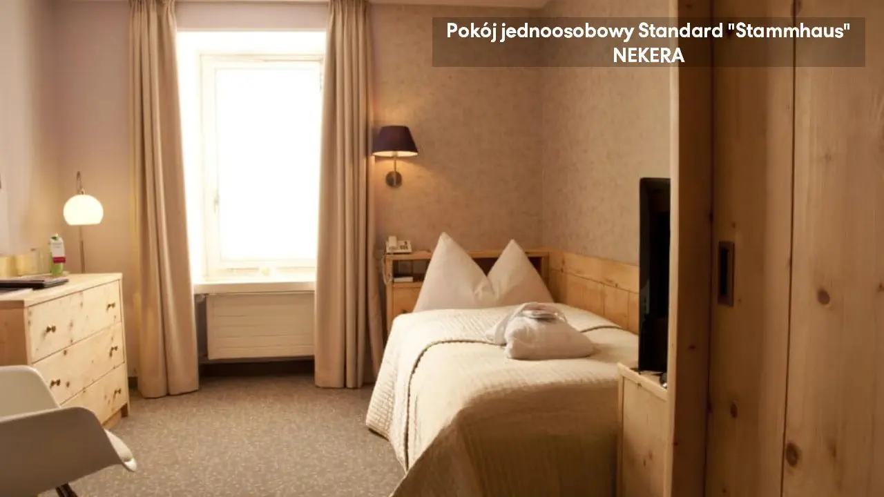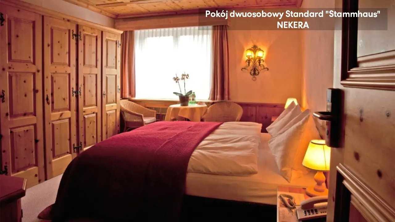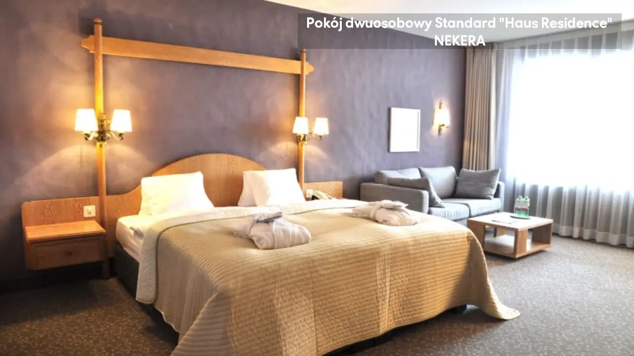 pokoje dwuosobowe standard "4*" (ok. 35 m2): wanna lub prysznic, WC, suszarka, telefon, TV, WiFi, sejf, balkon, mini bar (za opłatą). Pokoje jednoosobowe standard "3*" (ok. 15 m2): wyposażone jak pokoje dwuosobowe standard "4*", bez balkonu i mini baru. Pokoje czteroosobowe standard "4*" (ok. 35 m2): wyposażone jak pokoje dwuosobowe standard "4*". Pokoje dwuosobowe standard "3*" (ok. 20 m2): wyposażone jak pokoje dwuosobowe standard "4*", bez balkonu i mini baru.